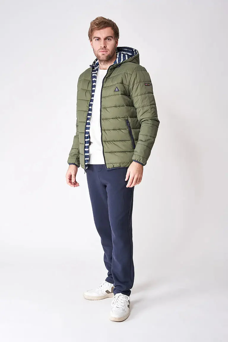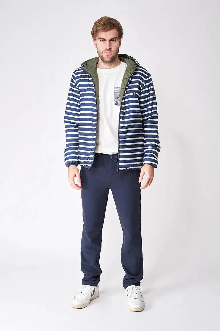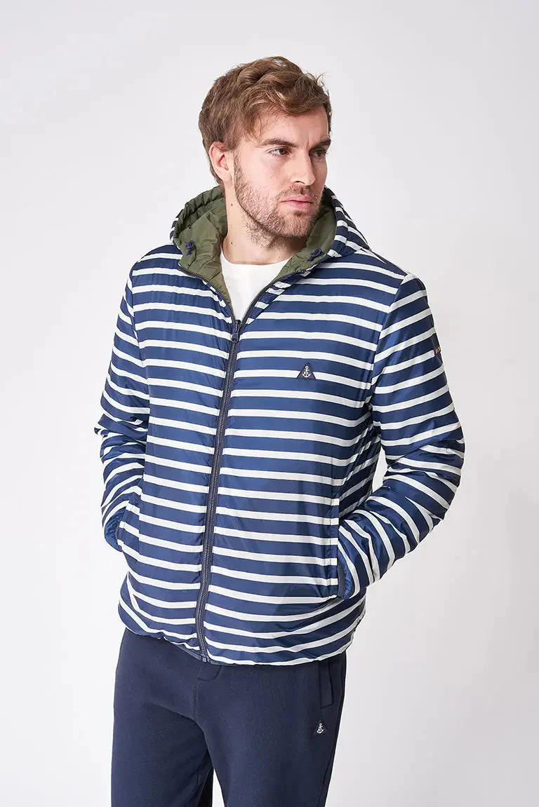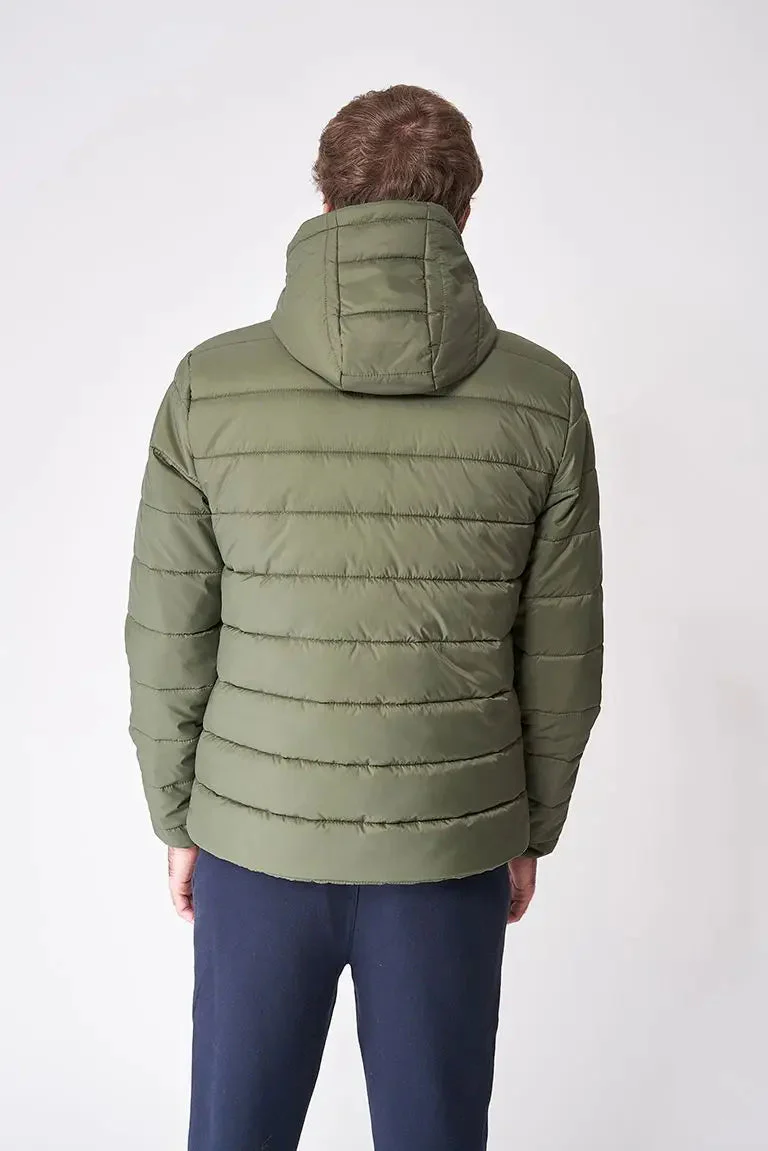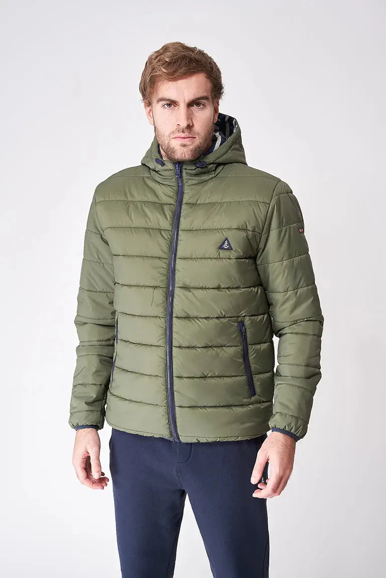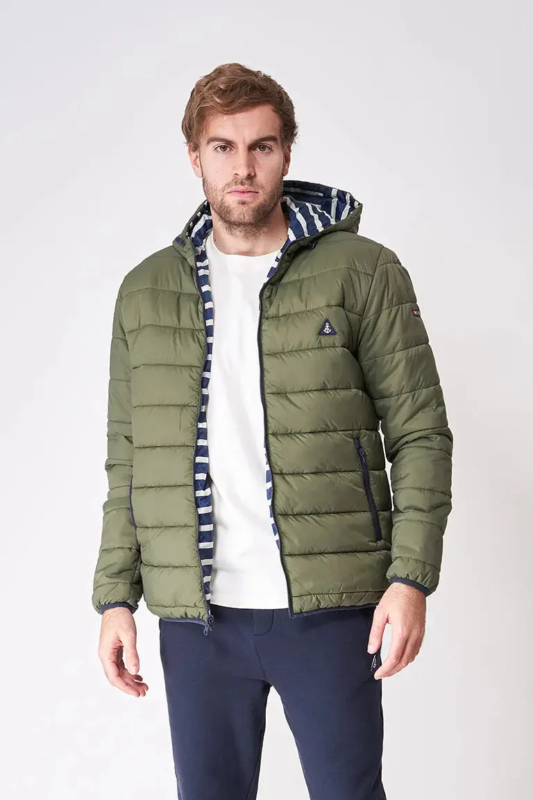 Chaqueta reversible con capucha y bolsillos laterales en diagonal. Prenda ligera y cómoda además de caliente.