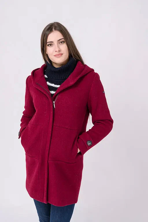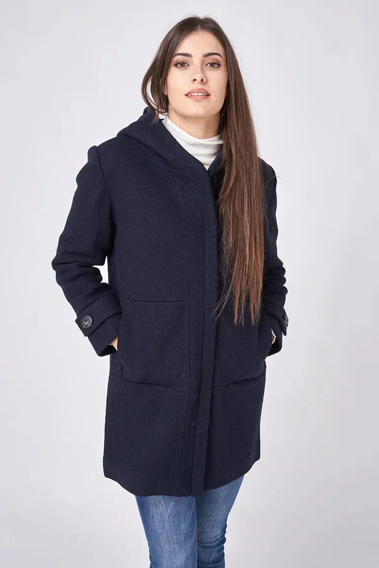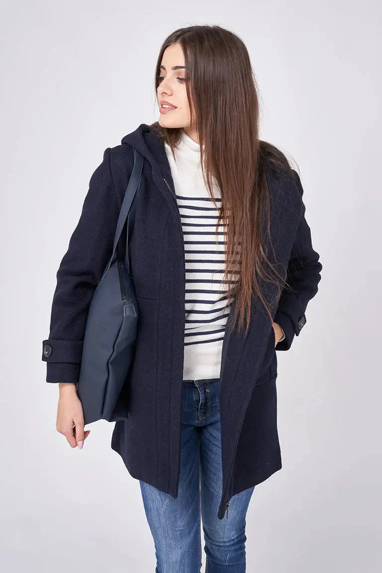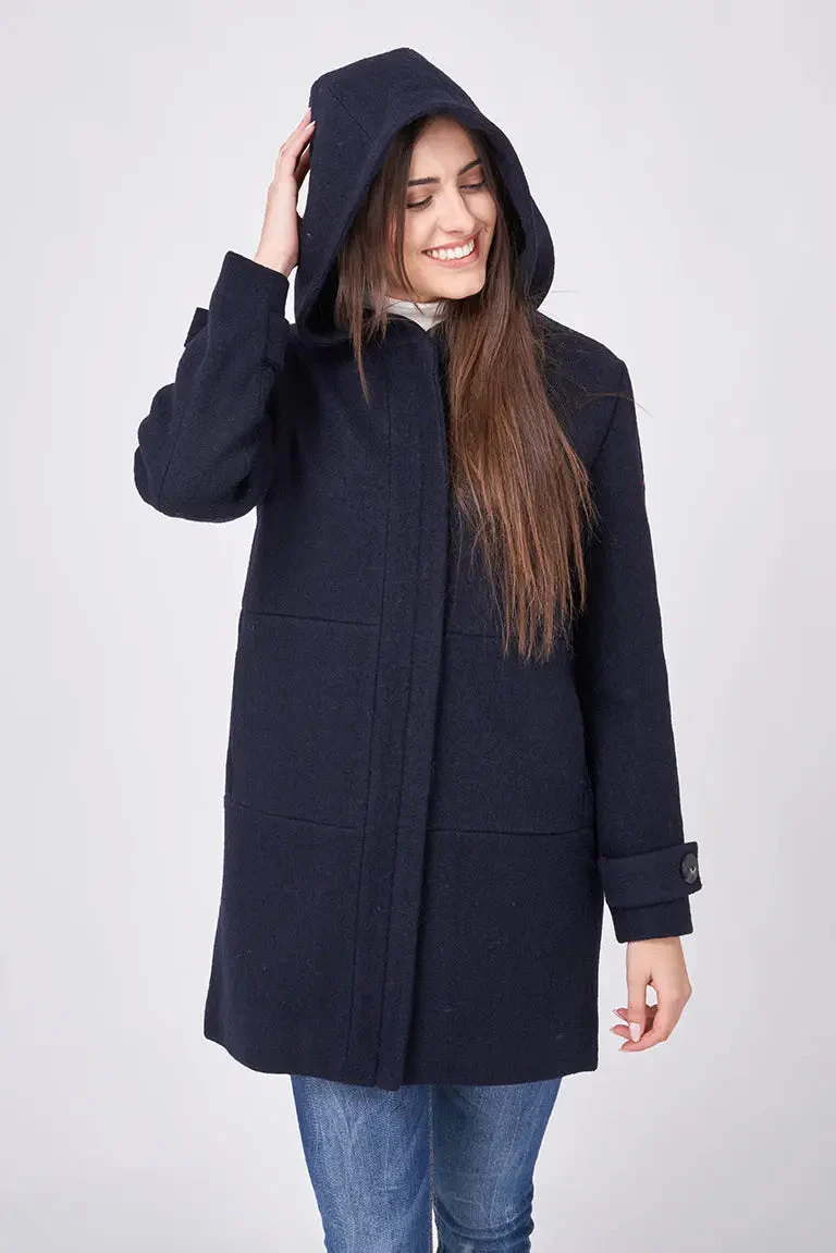 Este abrigo está hecho de lana cocida con cremallera, tiene capucha y bolsillos frontales en diagonal.