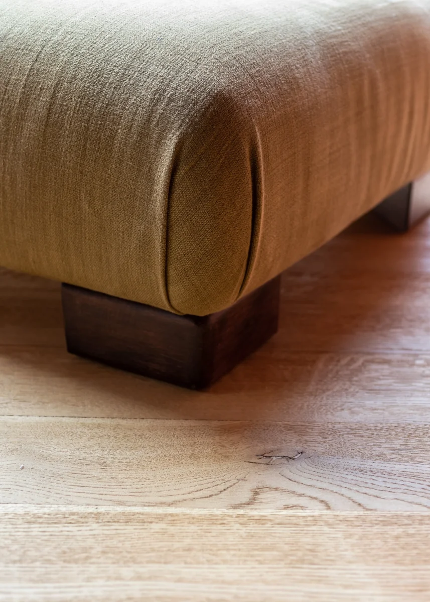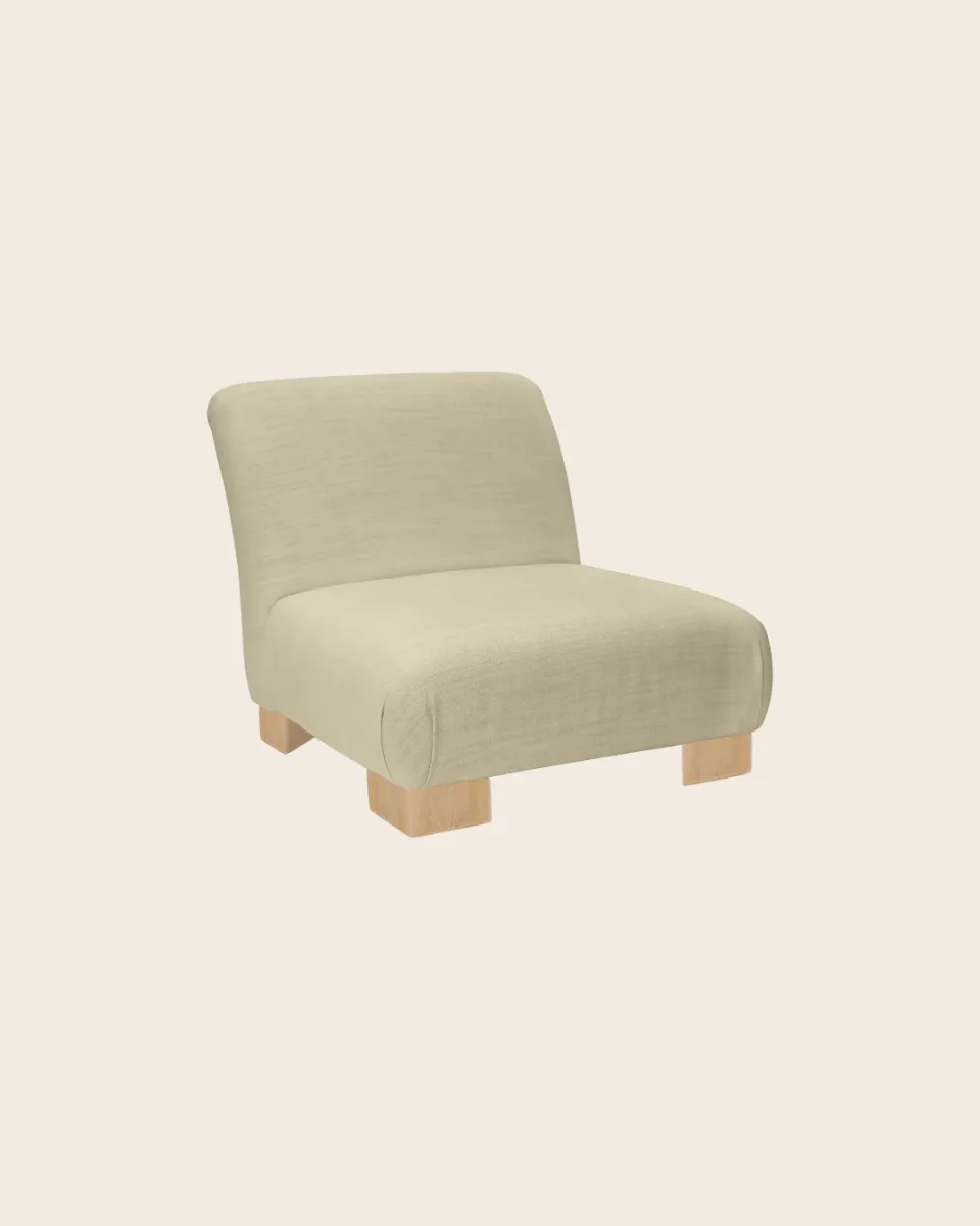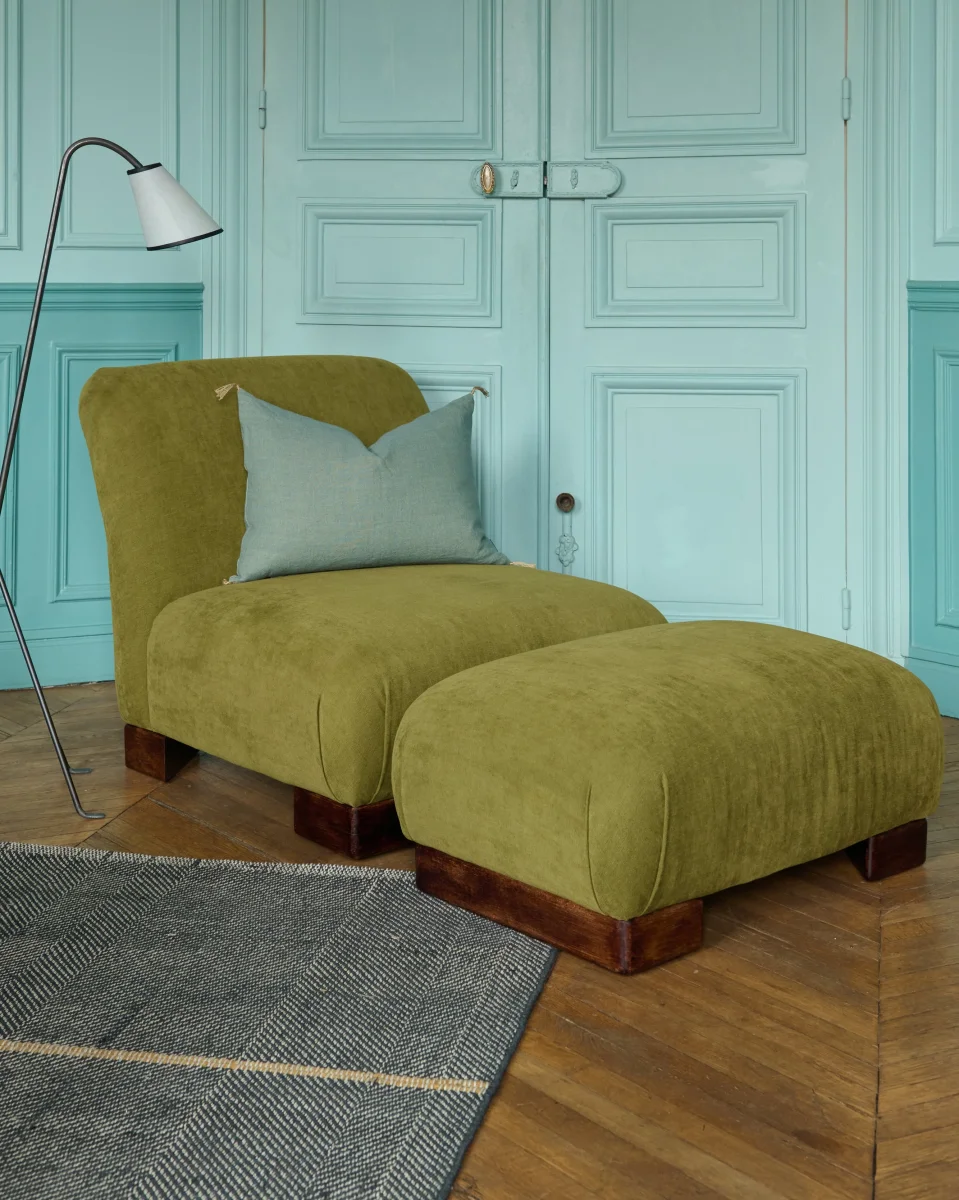 Au sol, des pieds plus géométriques lui apportent une touche contemporaine. Une invitation à s’y lover, en toute saison.