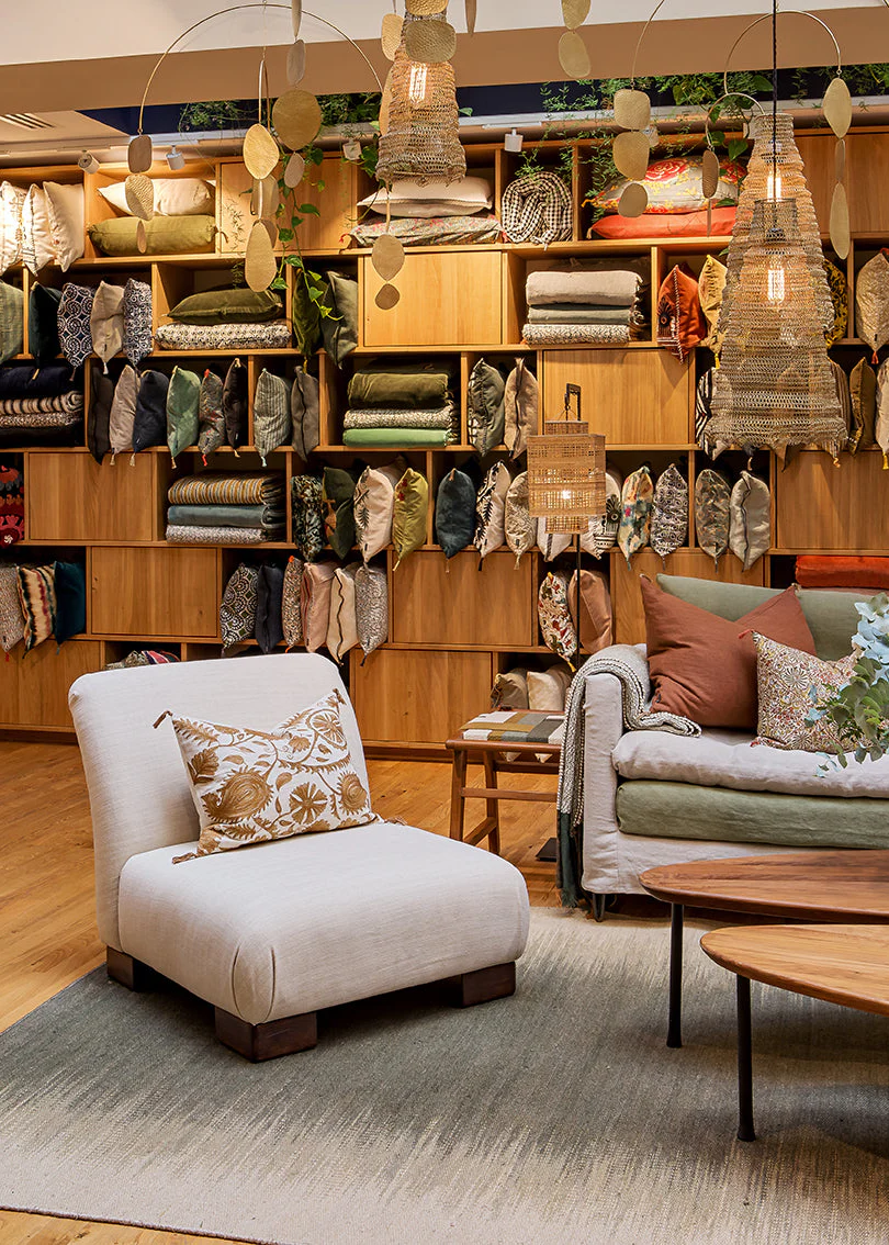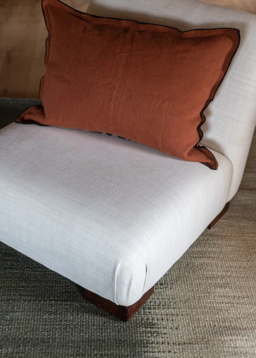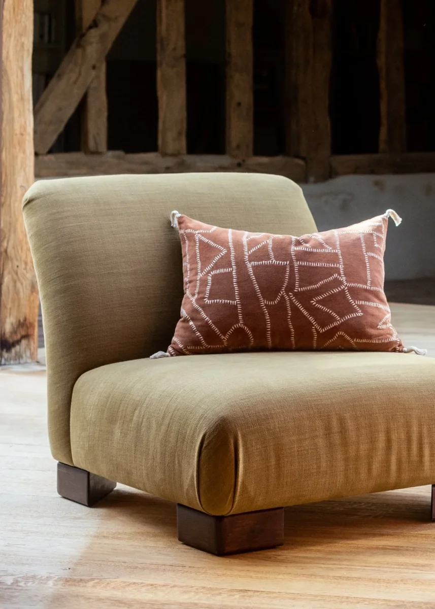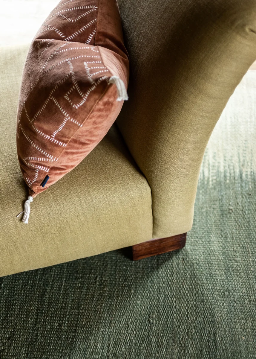 Au sol, des pieds plus géométriques lui apportent une touche contemporaine. Une invitation à s’y lover, en toute saison.