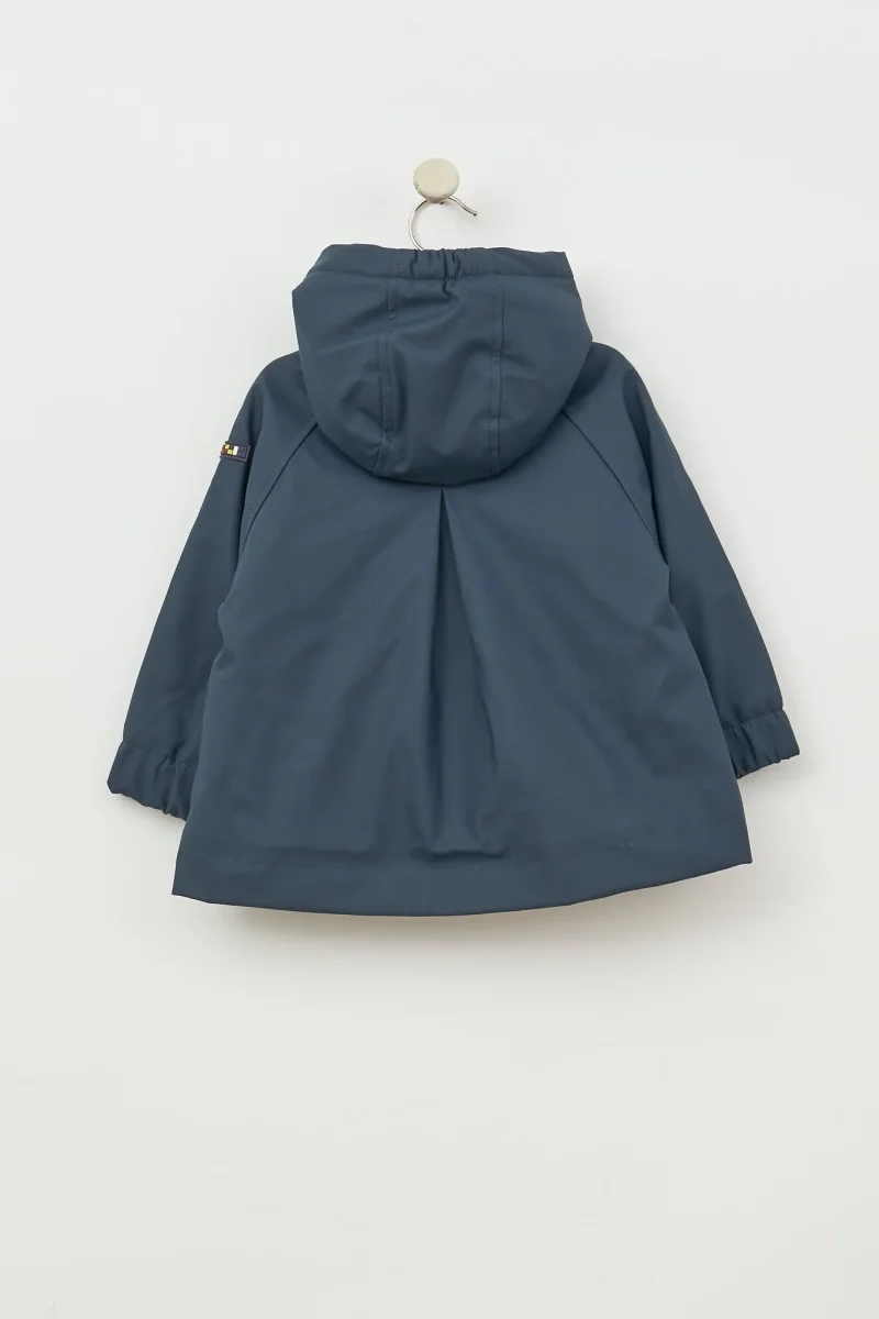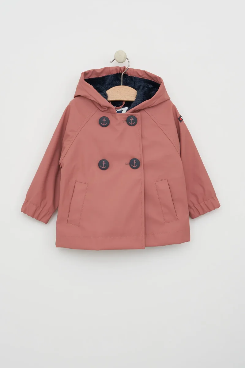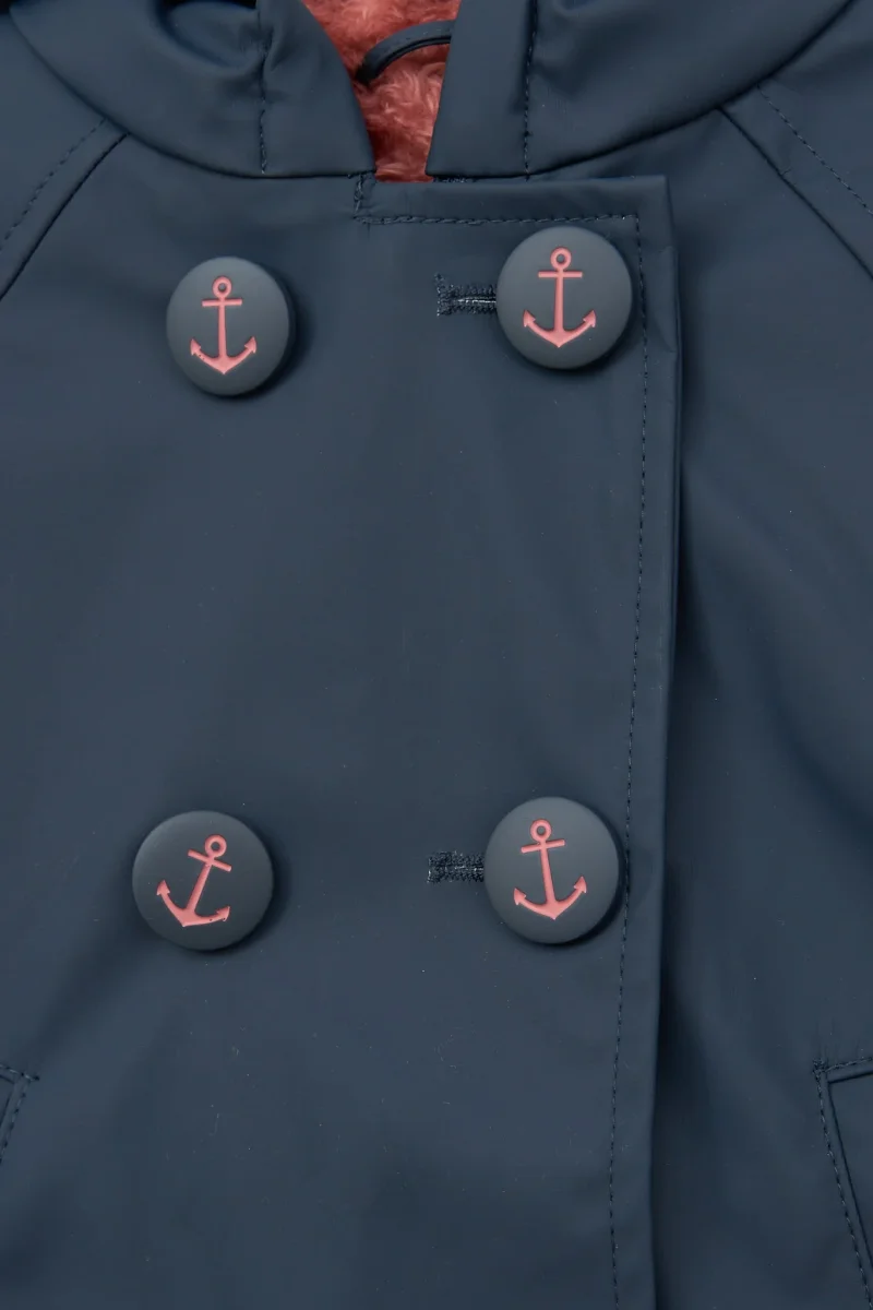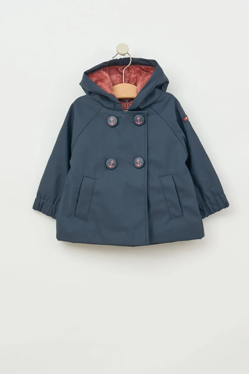 Chubasquero para bebé que combina funcionalidad y estilo náutico. Confeccionado en tejido impermeable de poliuretano y forrado en suave pelo interior, mantiene al bebé abrigado y protegido en los días lluviosos.