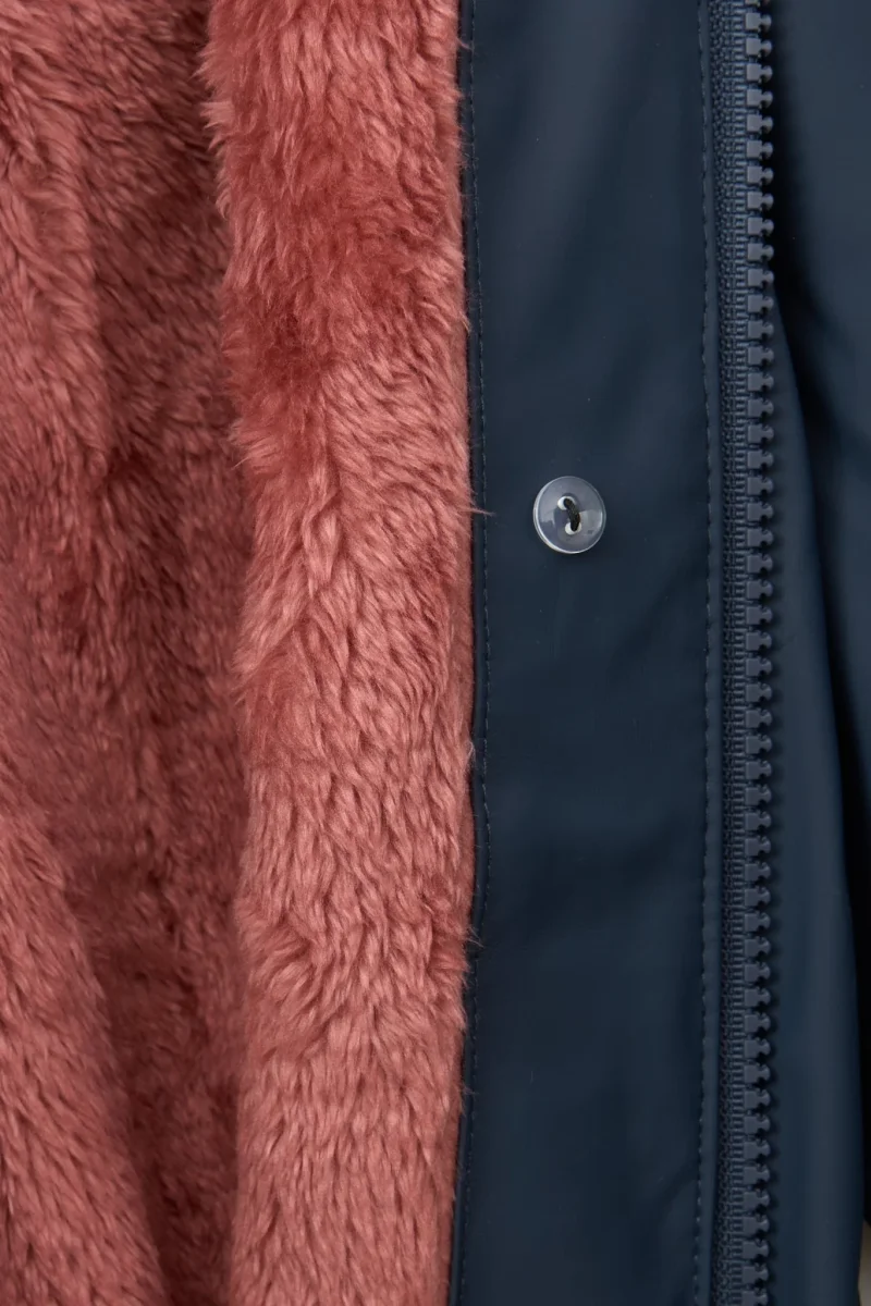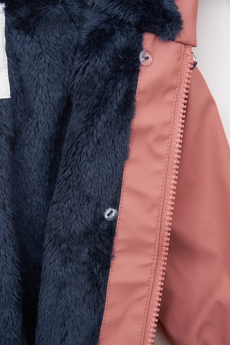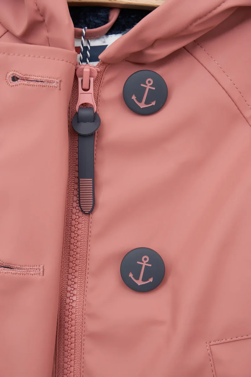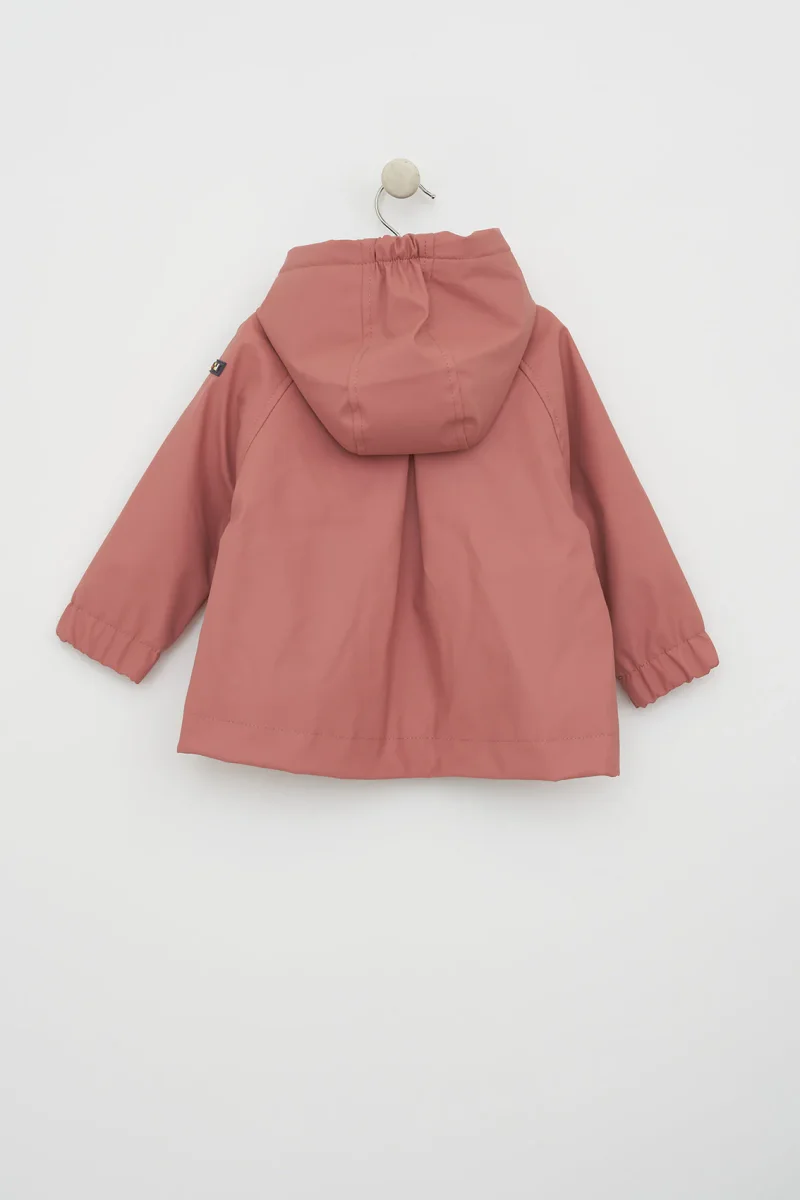 Chubasquero para bebé que combina funcionalidad y estilo náutico. Confeccionado en tejido impermeable de poliuretano y forrado en suave pelo interior, mantiene al bebé abrigado y protegido en los días lluviosos.