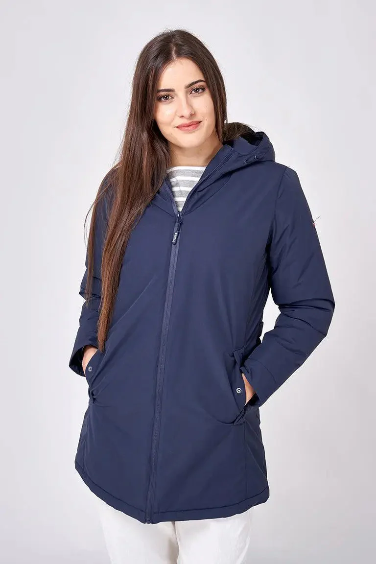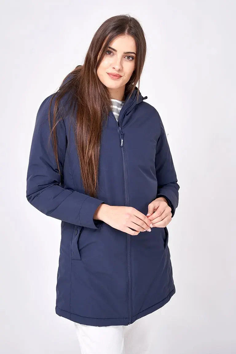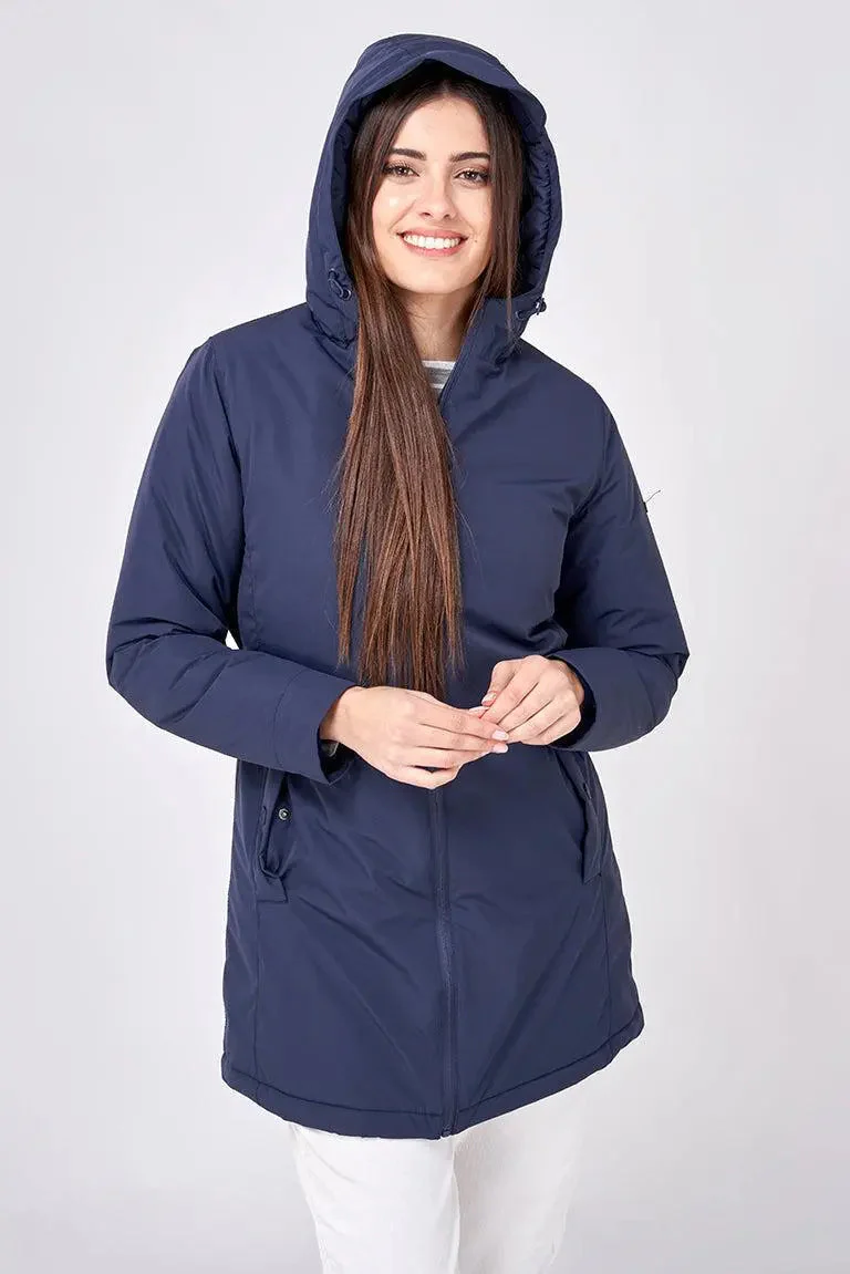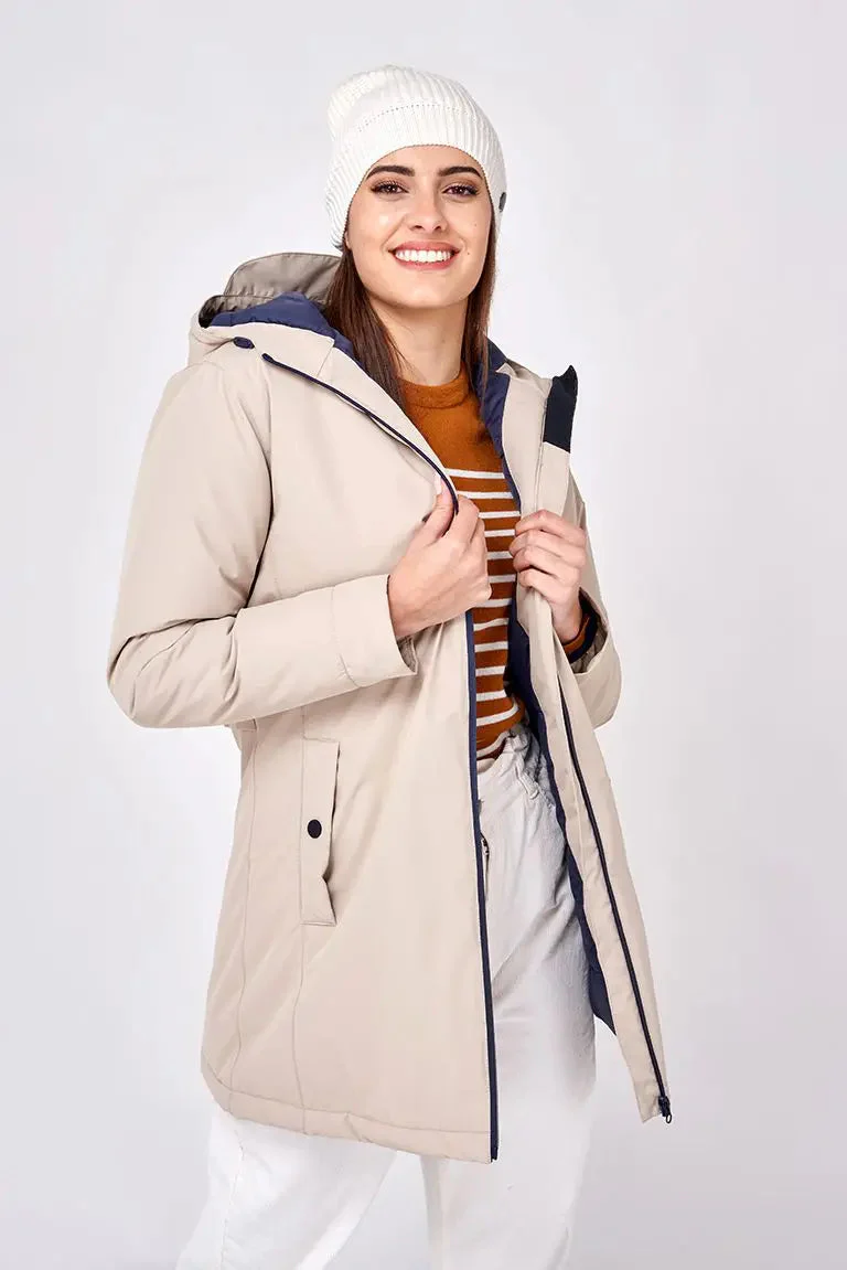 Corte recto, capucha fija con cordones para ajustar, interior acolchado en color marino, bolsillo francés con automático, cremallera central y posibilidad de ajuste en cintura mediante trabillas con botones a presión.