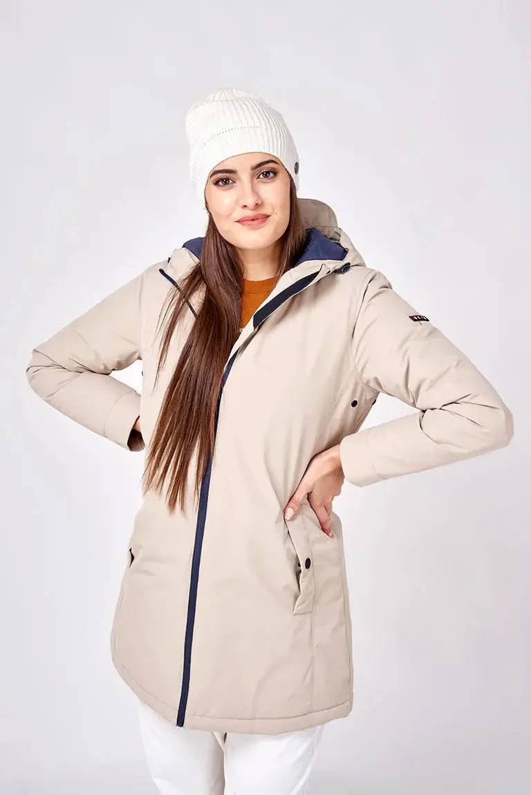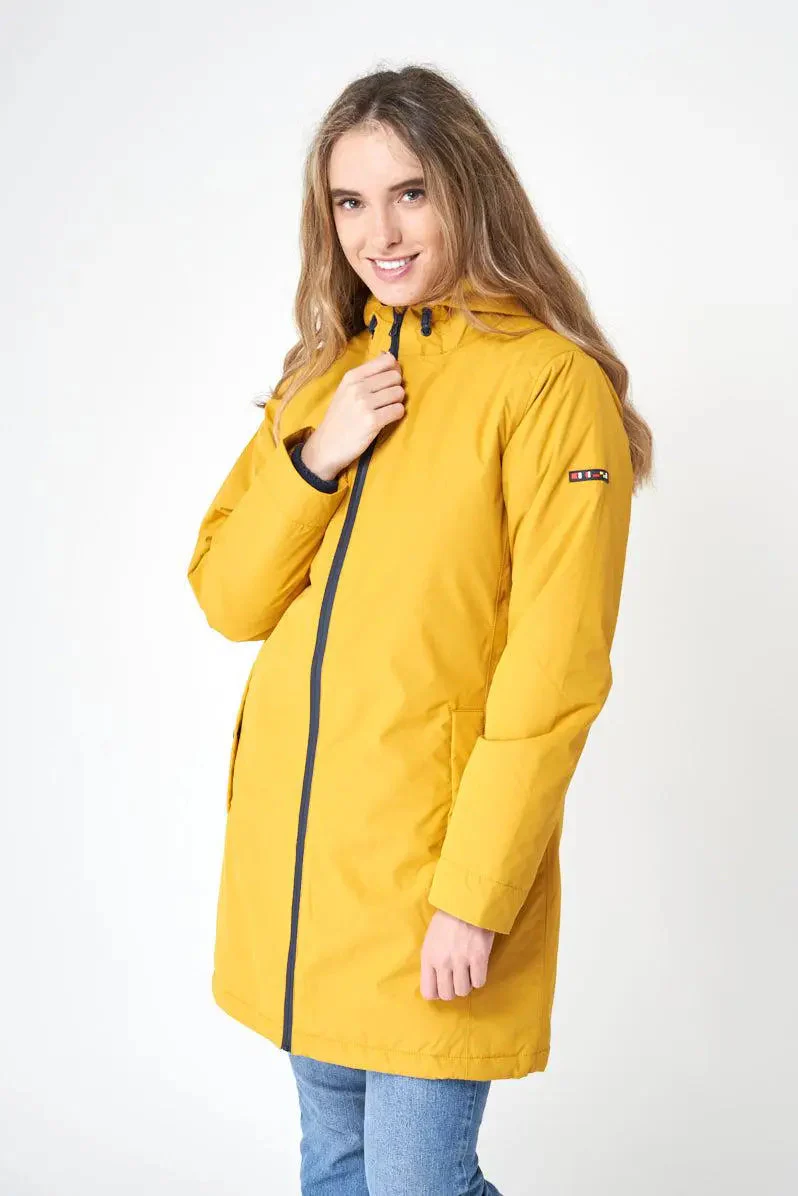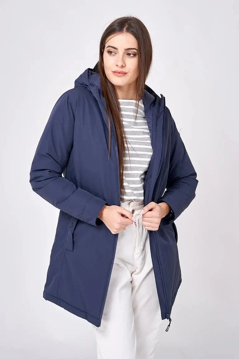 Corte recto, capucha fija con cordones para ajustar, interior acolchado en color marino, bolsillo francés con automático, cremallera central y posibilidad de ajuste en cintura mediante trabillas con botones a presión.