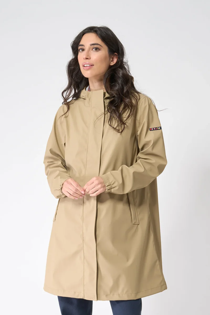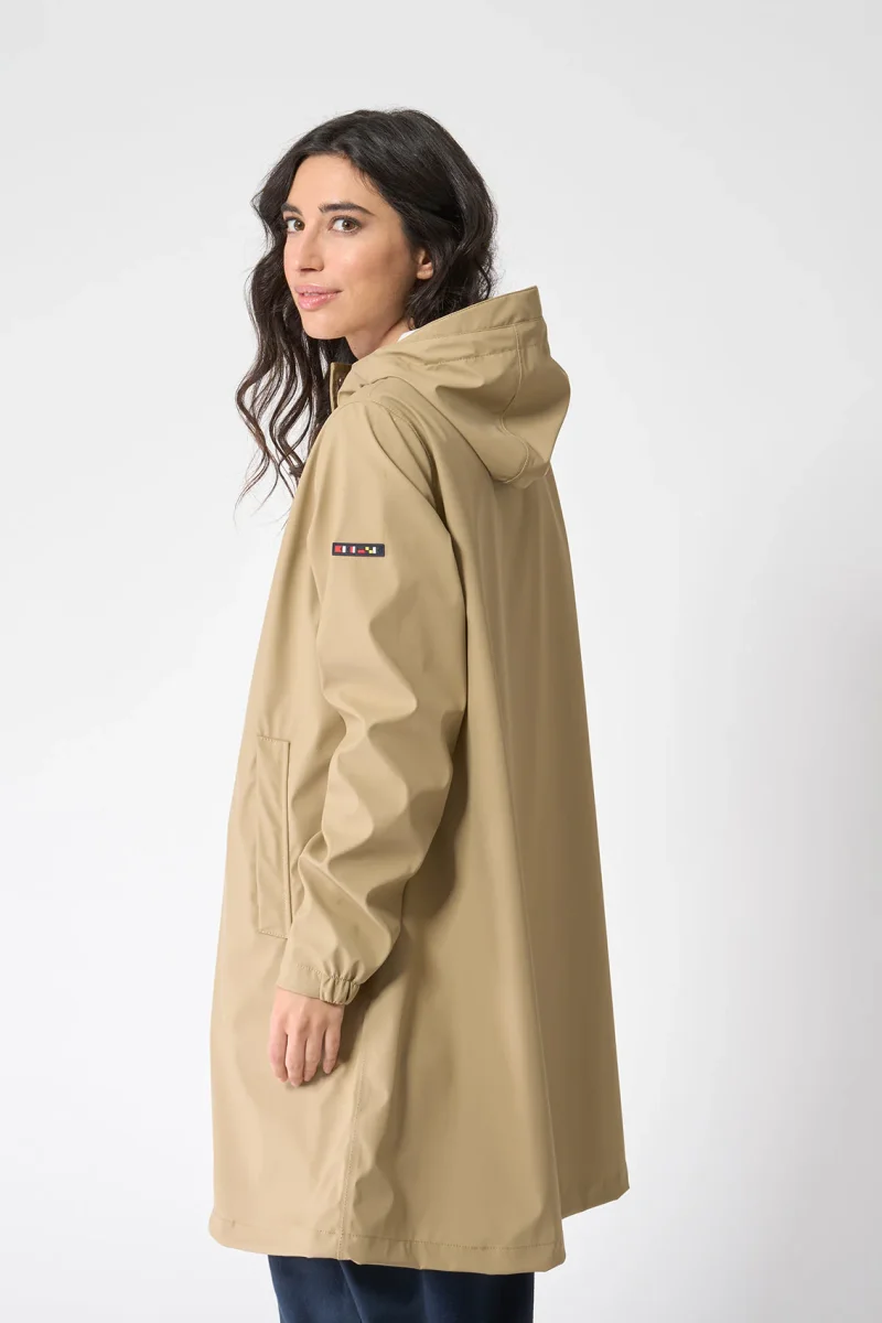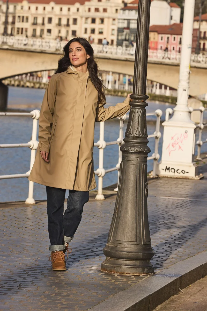 Chubasquero de entretiempo para mujer, confeccionado en tejido impermeable de poliuretano, ideal para protegerte de la lluvia y el viento durante los días templados de otoño. Diseño ligero sin forro interior, que permite una mayor transpirabilidad y facilidad de movimiento. Cuenta con cierre frontal de cremallera oculta bajo tapeta con corchetes, que refuerza la protección frente a la humedad. Incorpora una capucha ajustable, puños con acabado elástico y bolsillos laterales funcionales. Su acabado mate y minimalista lo convierte en una prenda versátil, perfecta tanto para looks urbanos como para escapadas al aire libre. Waterproof. La modelo mide 1,72m y lleva una talla 38.