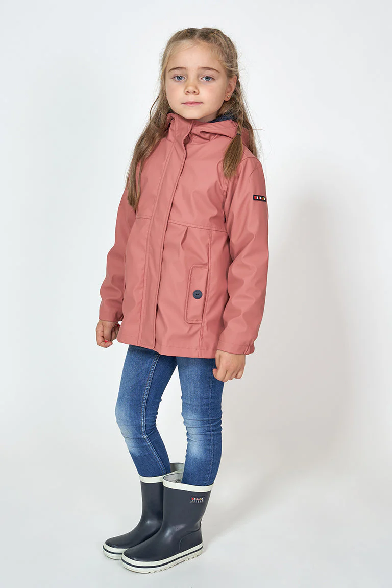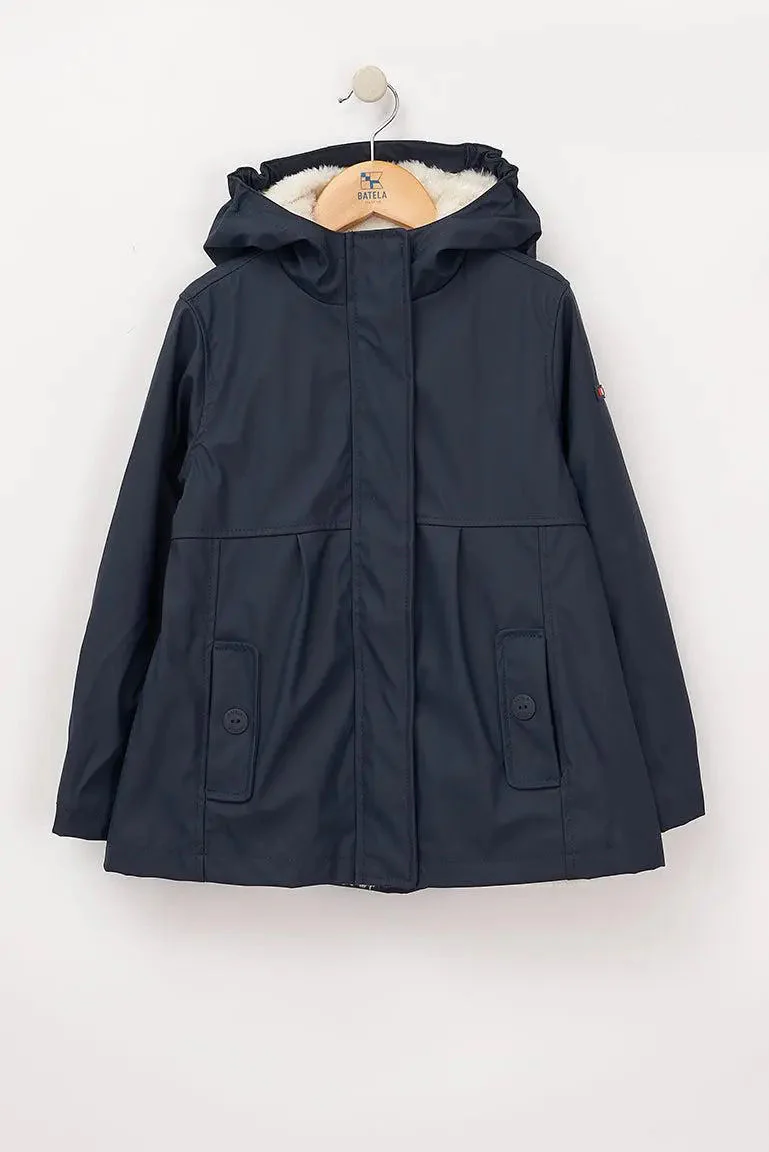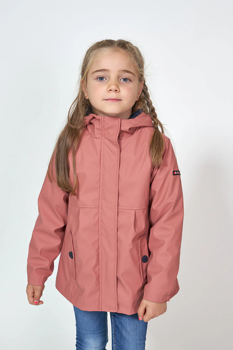 Chubasquero para niña con el exterior de poliuretano y con el interior de forro polar de pelo largo. Cómodo y ligero para los días más húmedos.