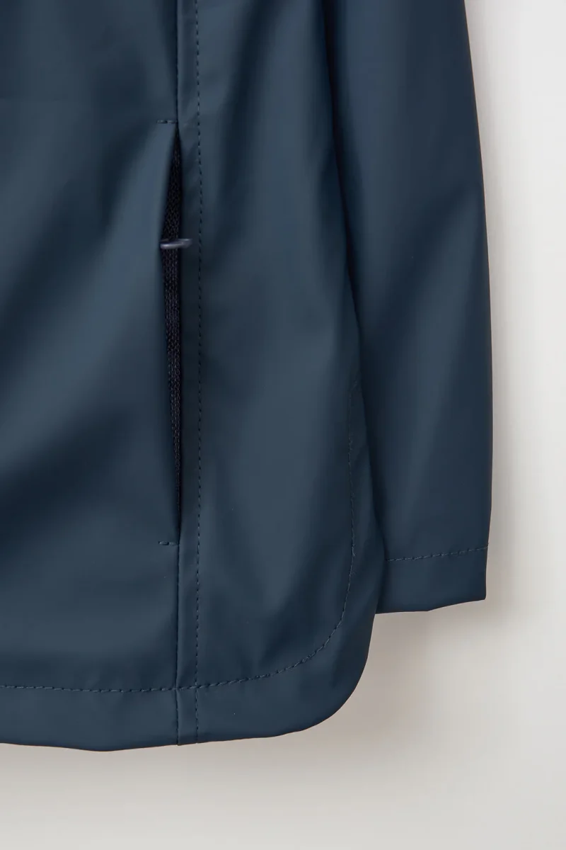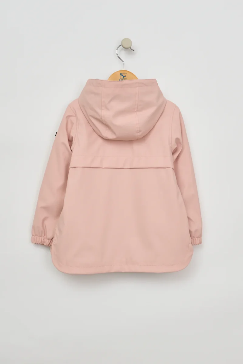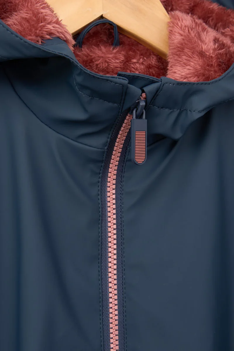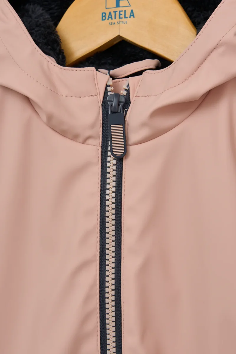 Chubasquero infantil confeccionado en poliuretano impermeable, con cierre de cremallera y un forro interior de pelo suave en color de contraste con el exterior, pero a tono con la cremallera, creando un acabado armonioso y original.