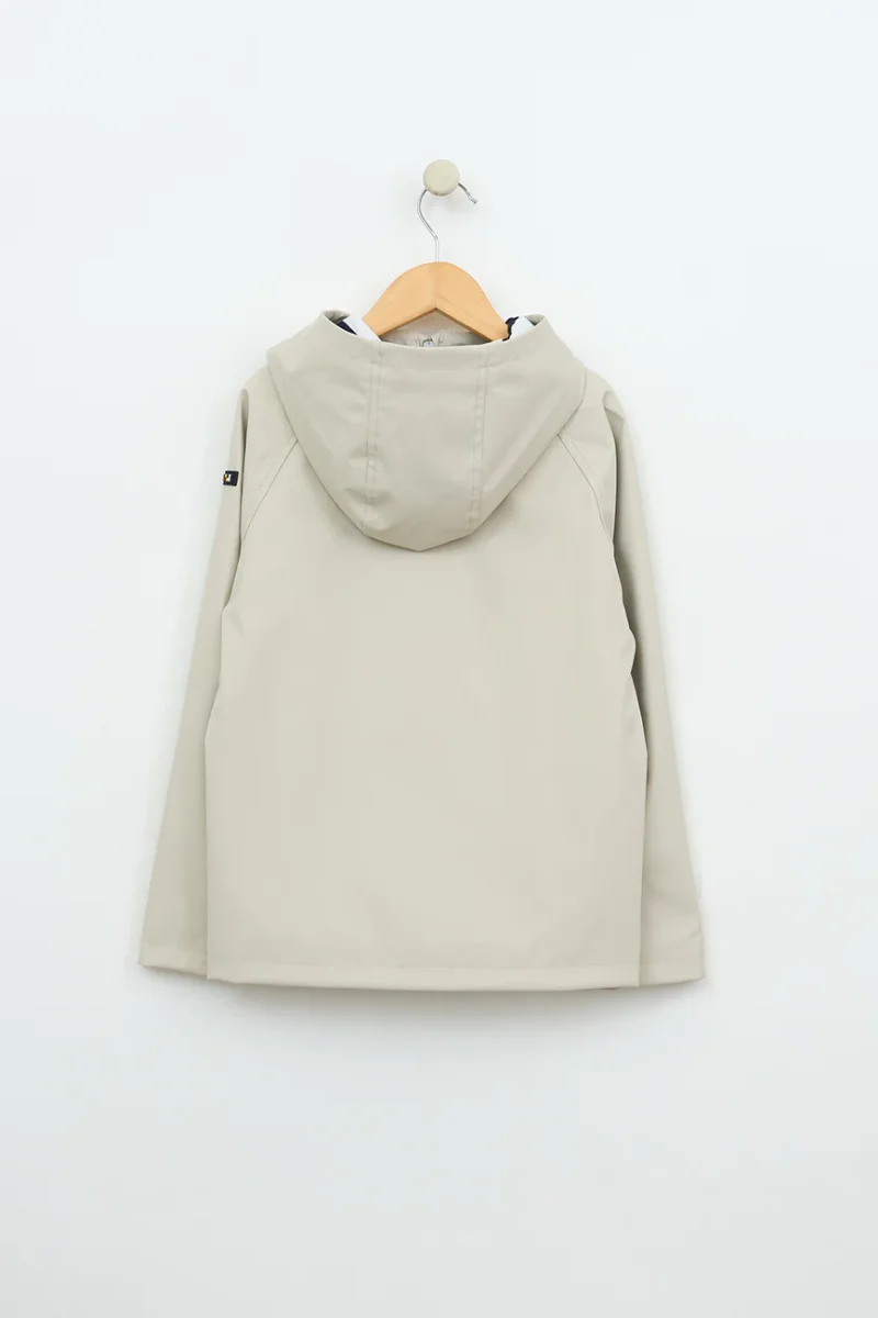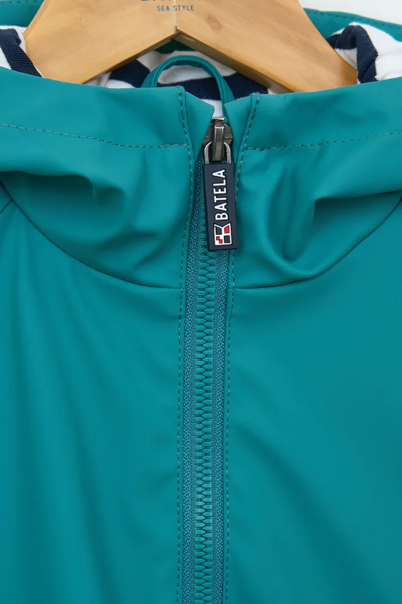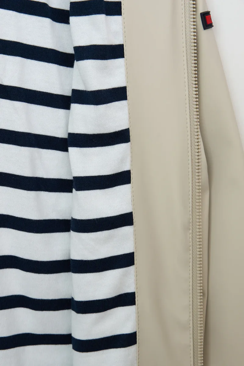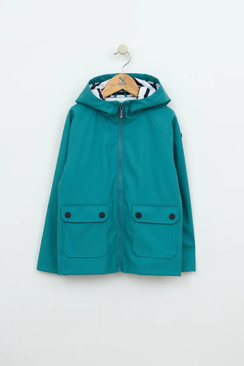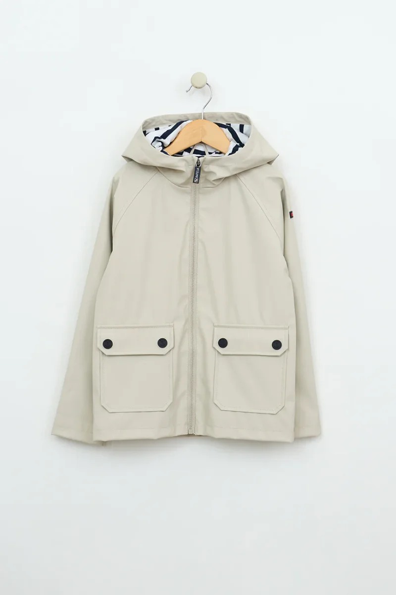 Chubasquero marinero de niño o niña de poliuretano con forro interior de algodón con raya marinera en mangas, cuerpo y capucha. Un modelo perfecto para lucir un look marinero con sus bolsillos con solapas y botones a presión con motivos de anclas.