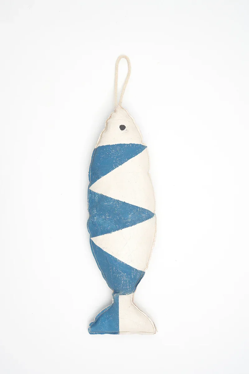 Cojín con forma de pez hecho en canvás y pintado de forma envejecida, para lograr un efecto muy atractivo.