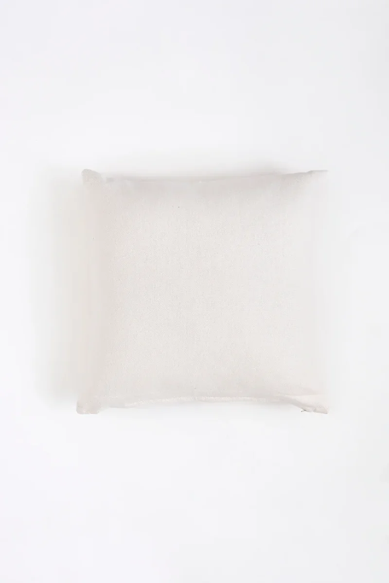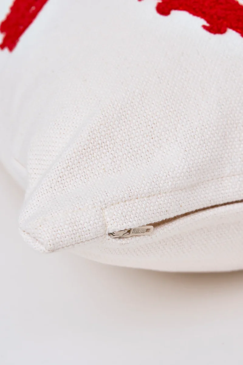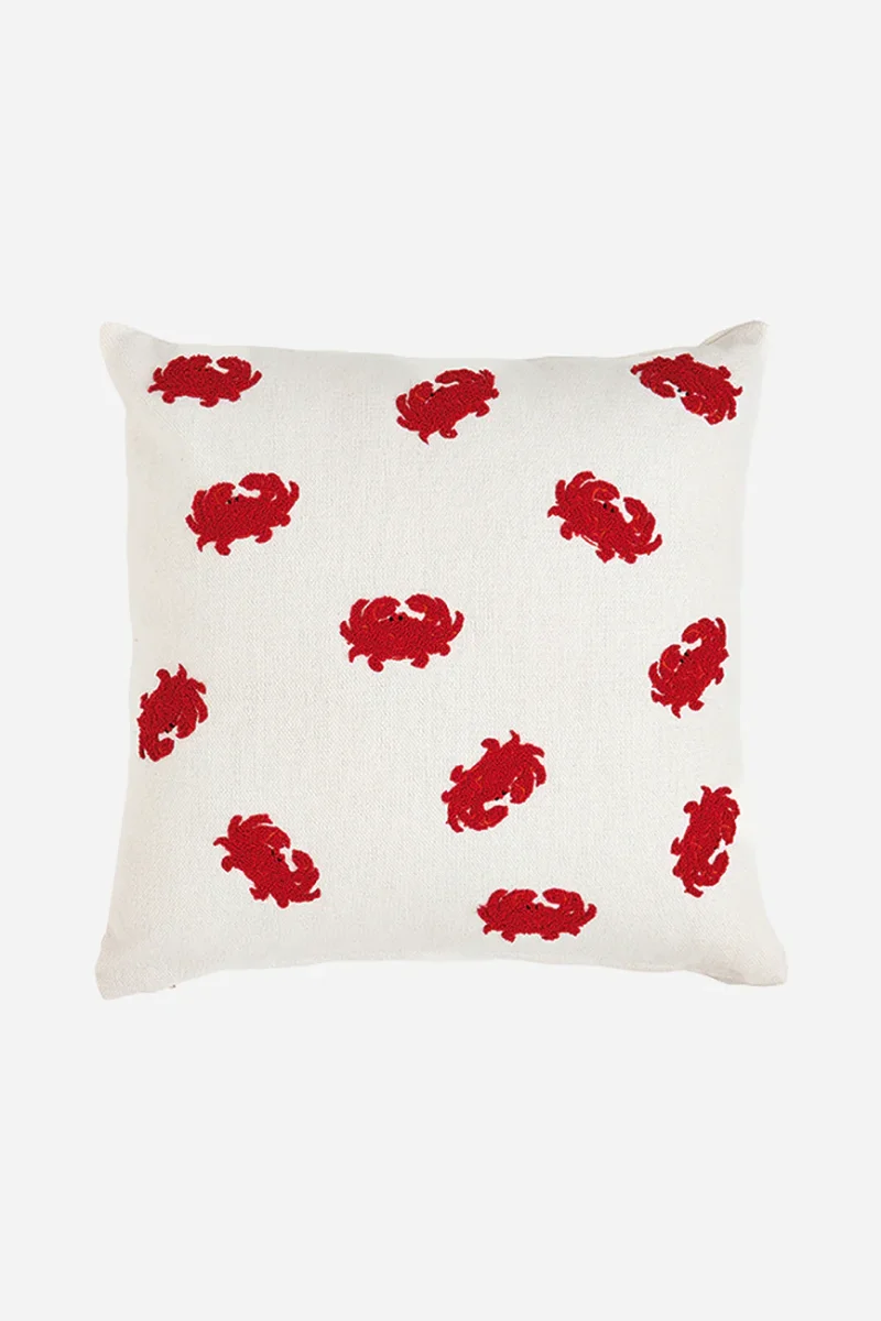 Cojín de algodón decorado con un patrón de cangrejos bordados en color rojo.