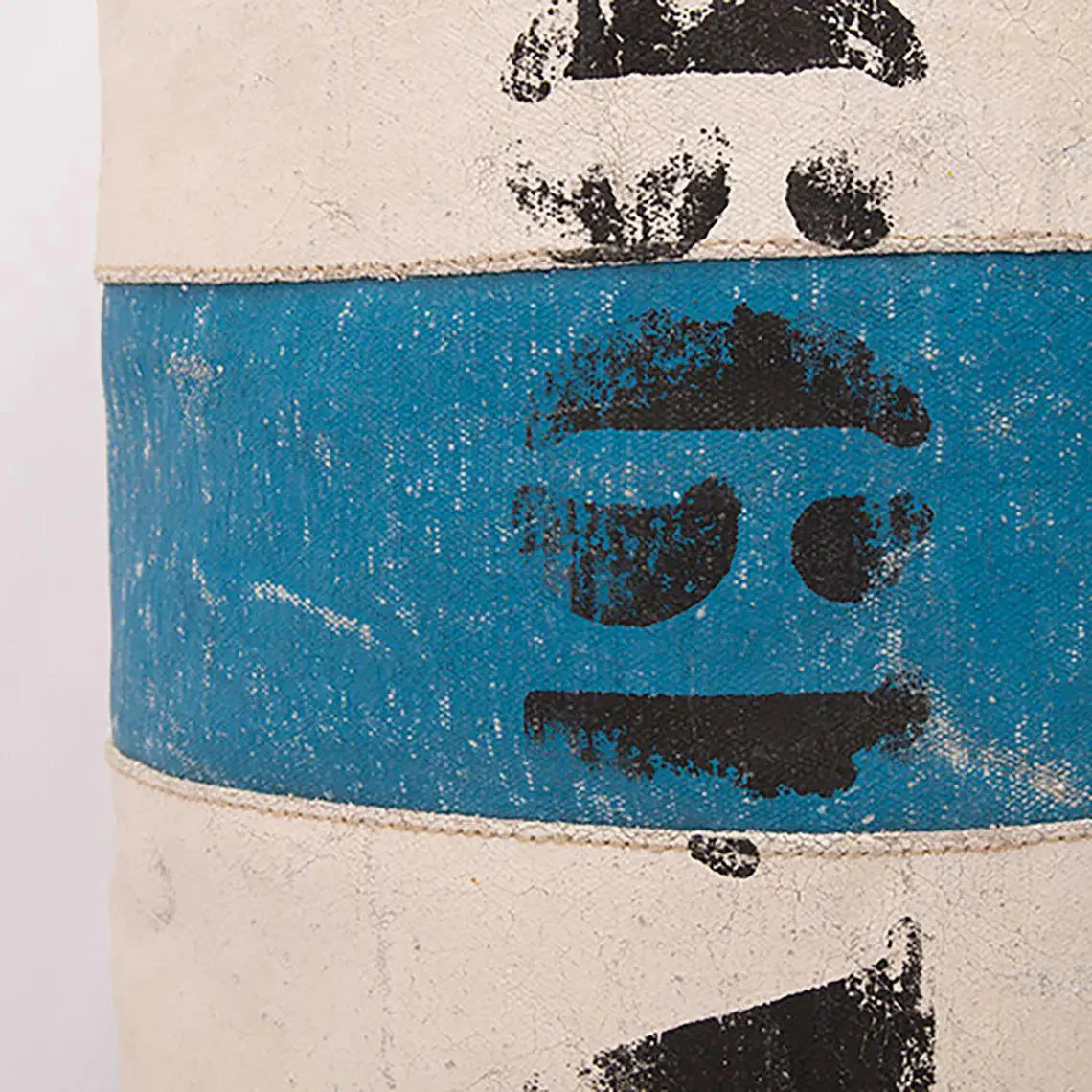Cojín de canvas con forma de boya. Está pintado con una terminación envejecida que le confiere el aspecto de las verdaderas boyas de puerto.