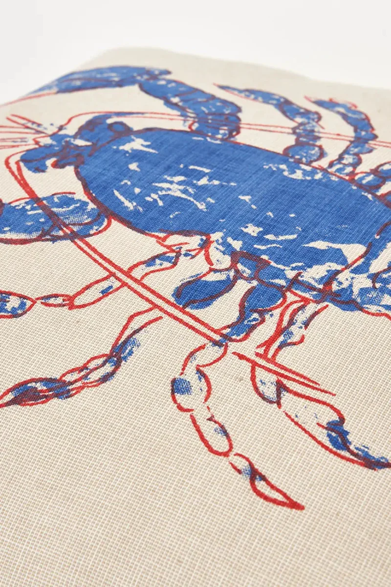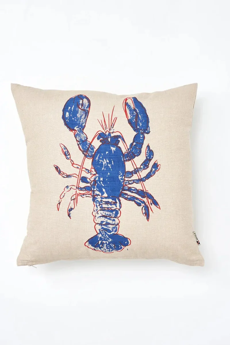 lBonito cojín en algodón con un llamativo estampado de una langosta roja sobre fondo crudo. Confort y elegancia para tu salón. Se envía con relleno.