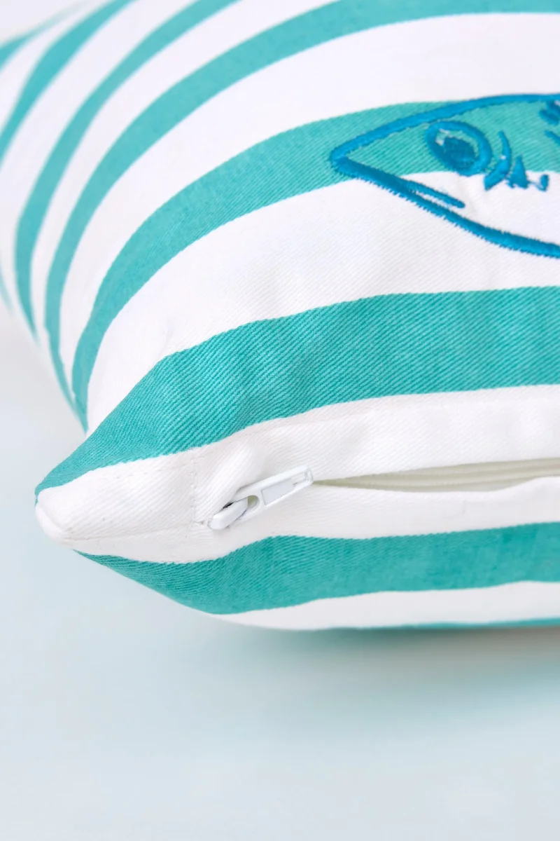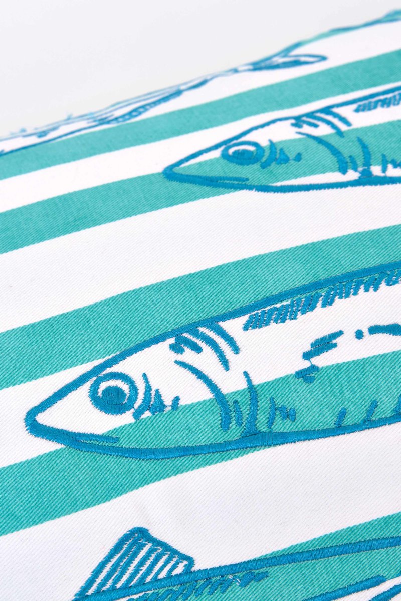 Cojín decorativo de algodón con estampado de peces sobre fondo de rayas en tonos verdes y blancos. Un diseño fresco y marinero ideal para aportar un toque costero al sofá o al dormitorio.