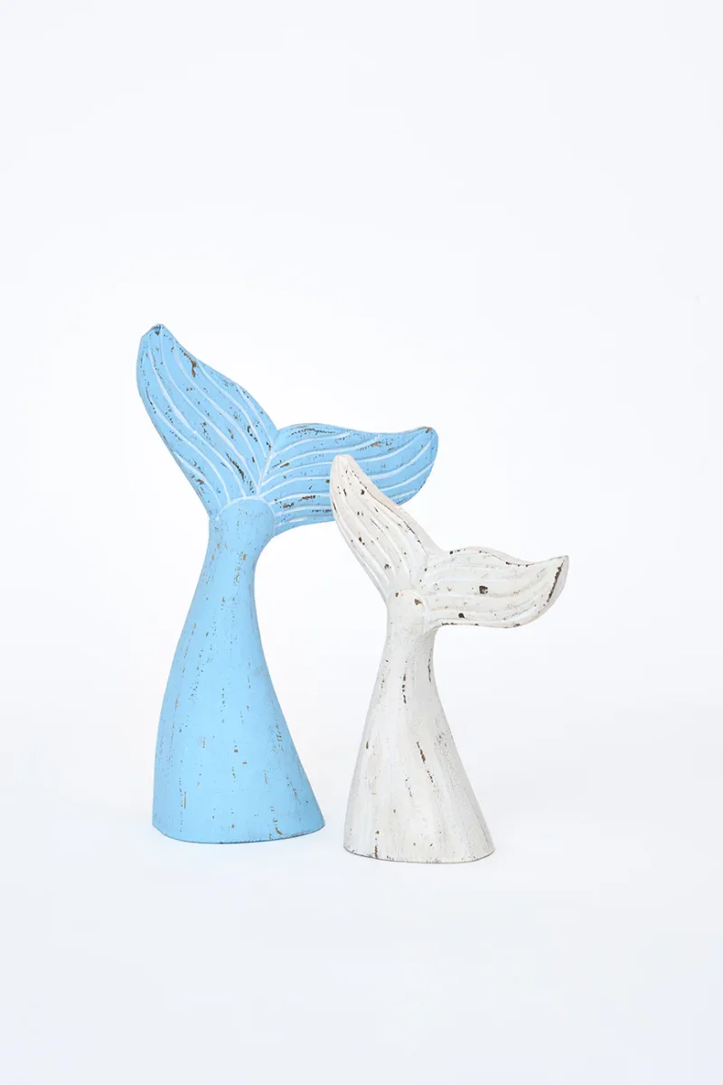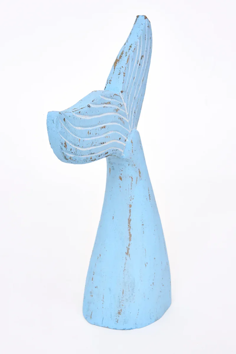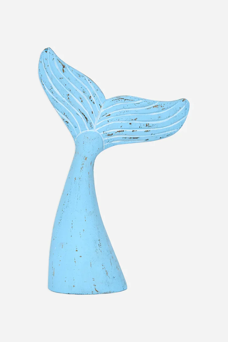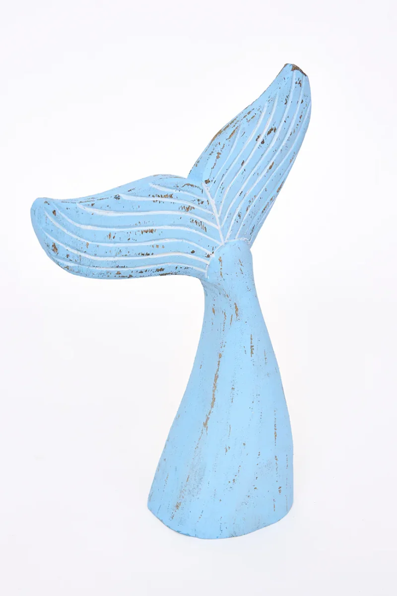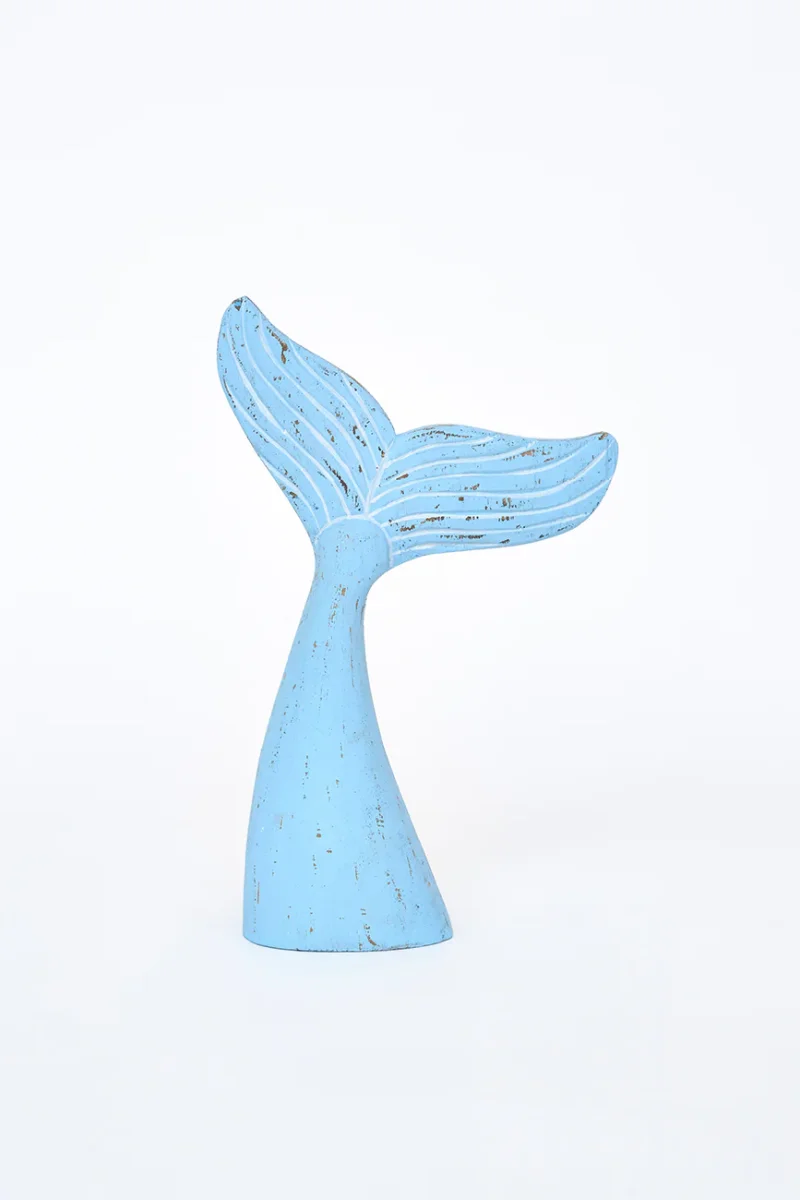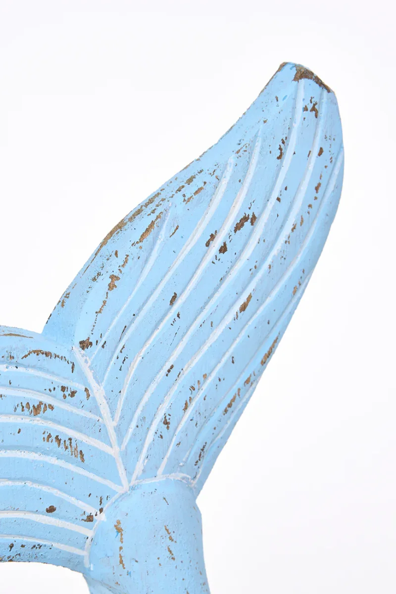 Cola de ballena decorativa elaborada en madera. Pintada en color azul cielo con un acabado ligeramente envejecido. Un elemento decorativo con inspiración marinera para el hogar.