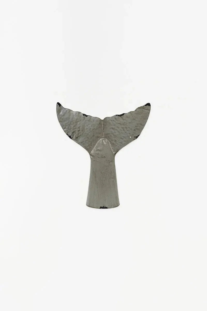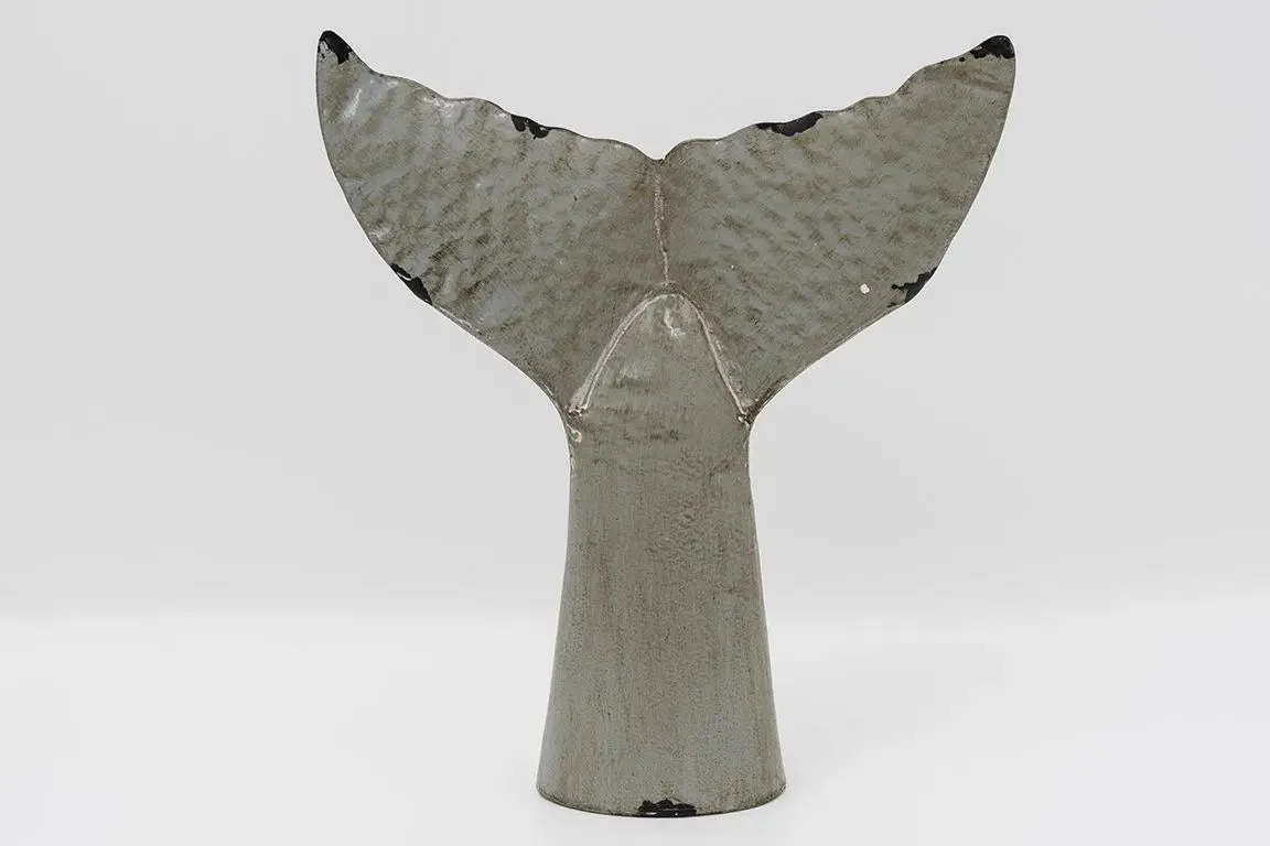 Cola de ballena decorativa náutica de metal con terminación envejecida. Se puede colocar en la pared o sobre una mesa.