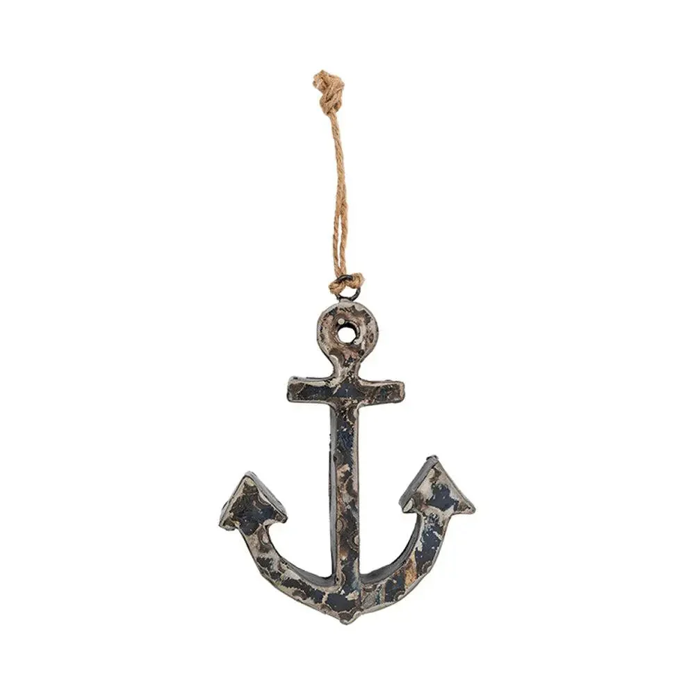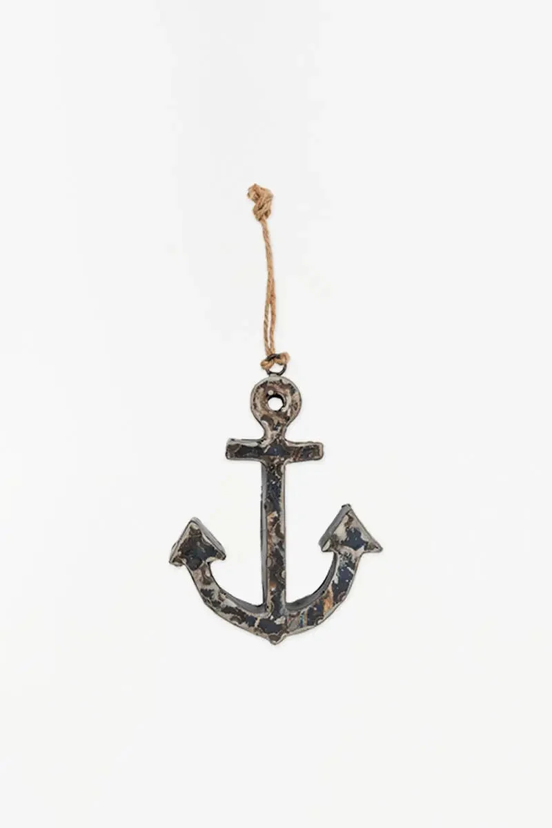 Colgante de chapa de bidón reciclado con forma de ancla. Viene con una cuerda. Un detalle original y divertido para el hogar.