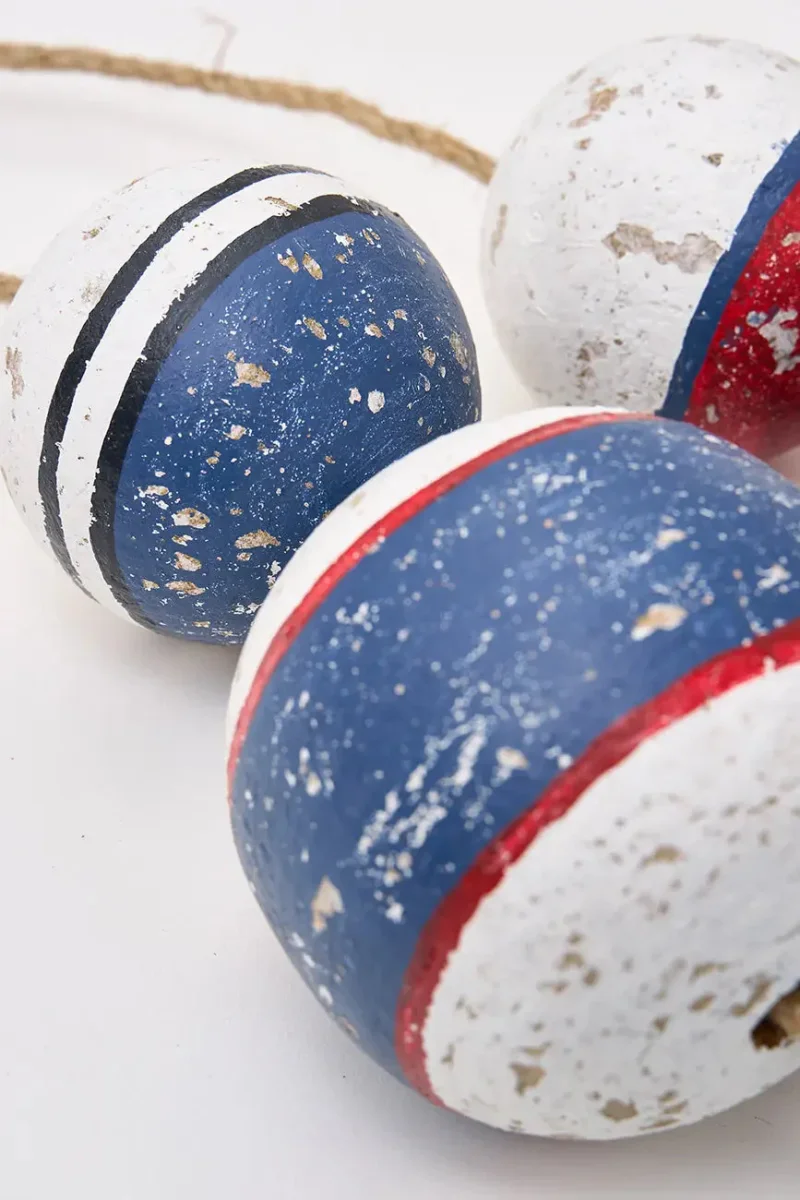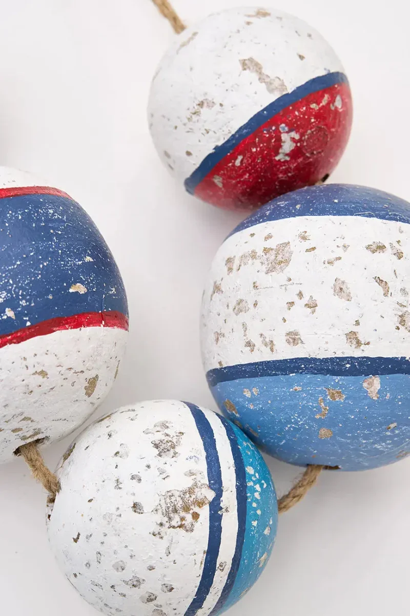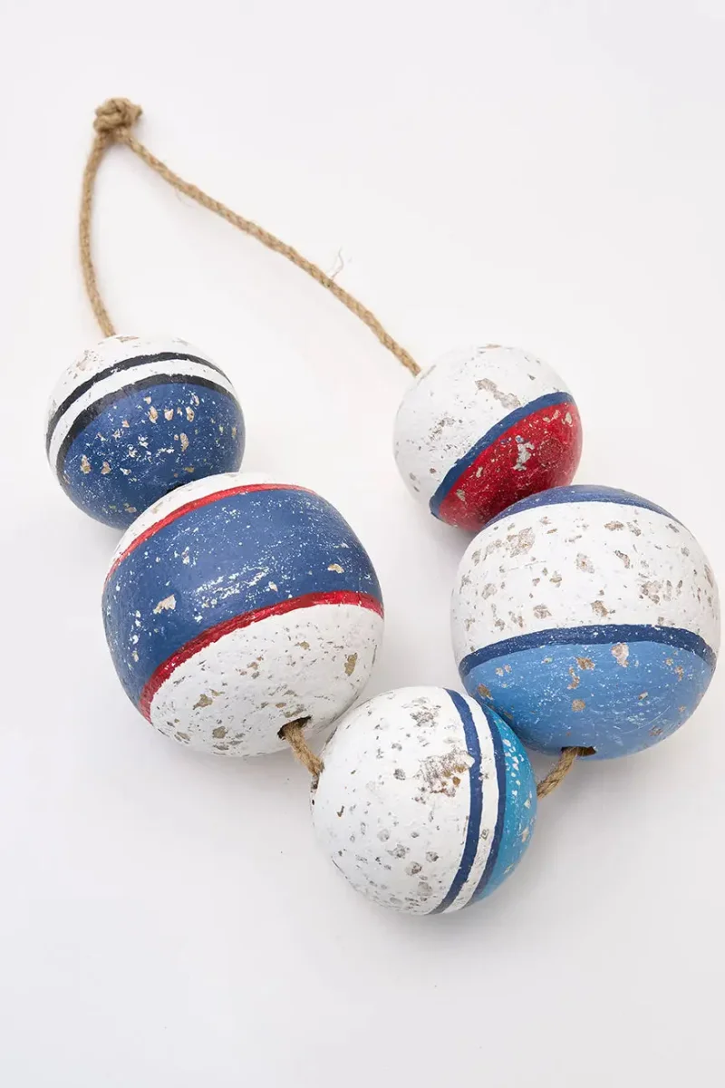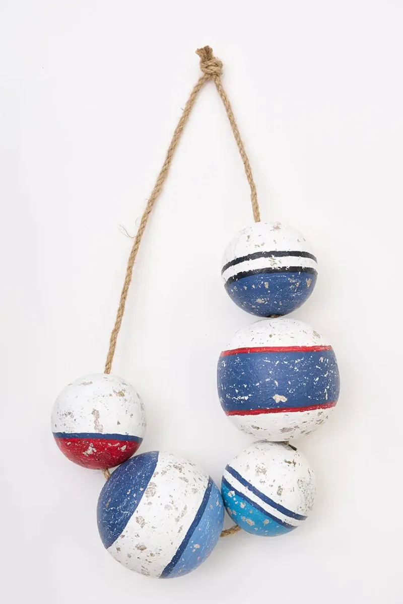 Colgante decorativo de boyas de madera envejecida, ideal para un toque náutico auténtico en cualquier espacio. Perfecto para interiores o patios.