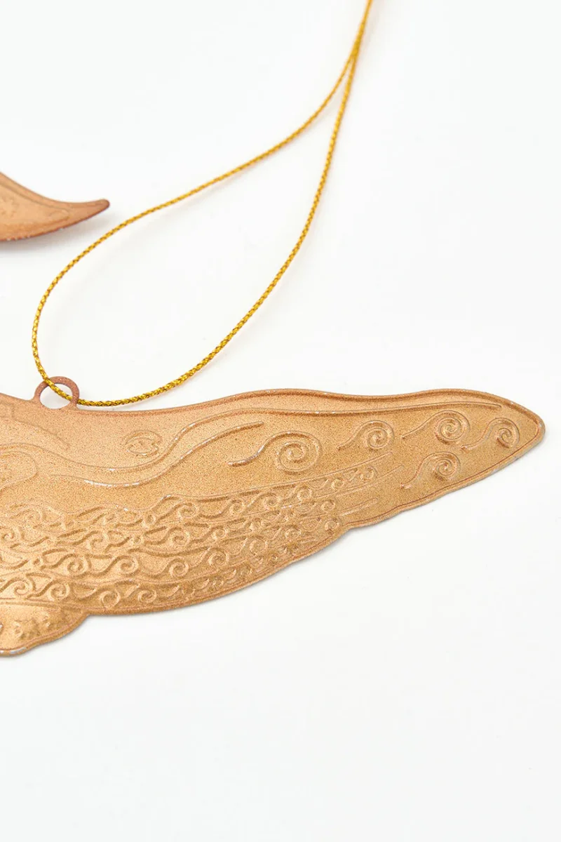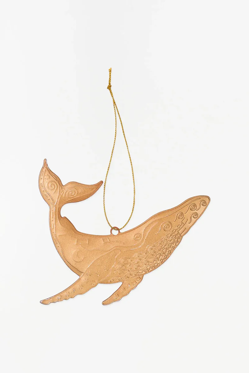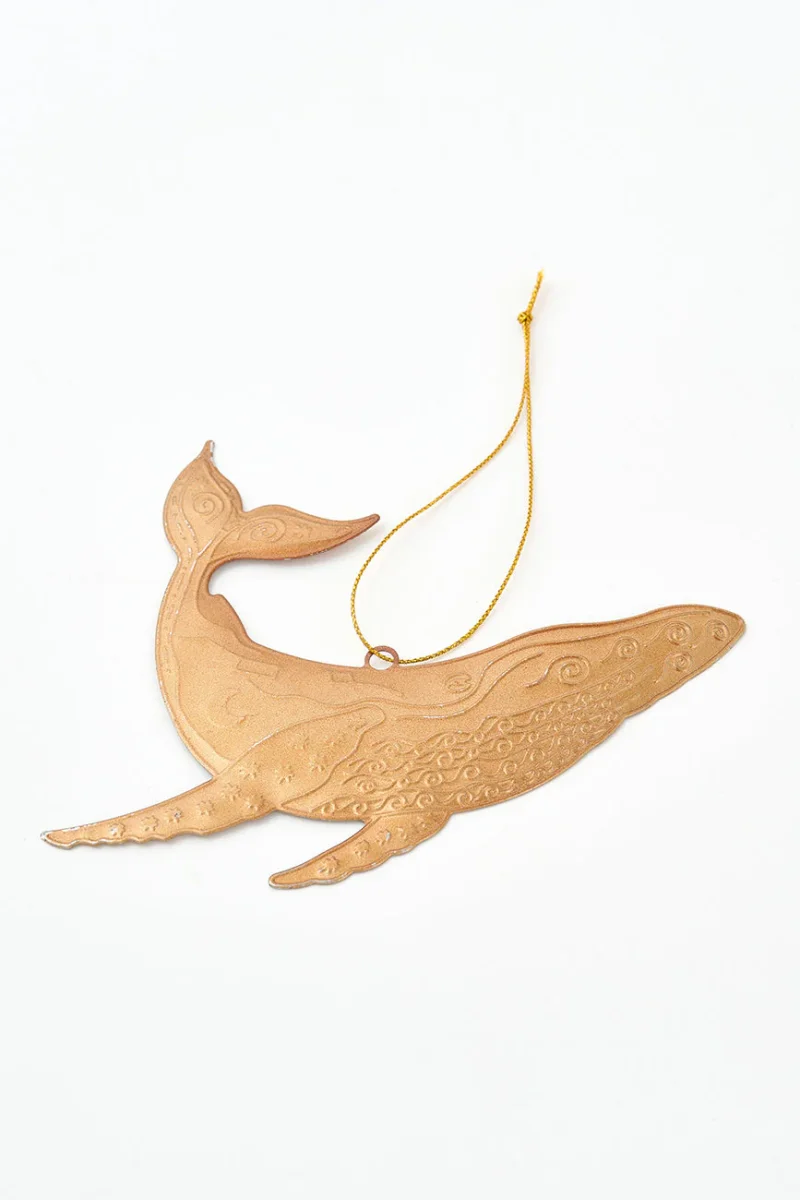 Colgante navideño de hojalata con forma de ballena en color dorado, ideal para dar un toque marinero a tu árbol de Navidad. Aporta un encanto costero y festivo a tu decoración navideña.