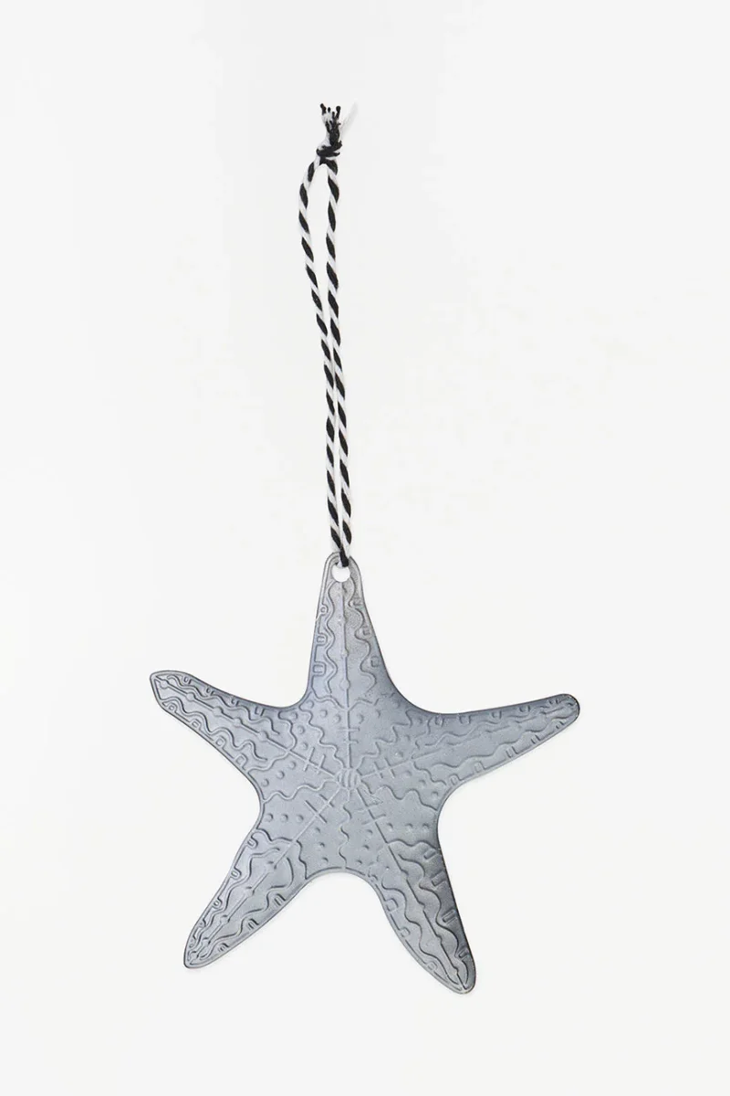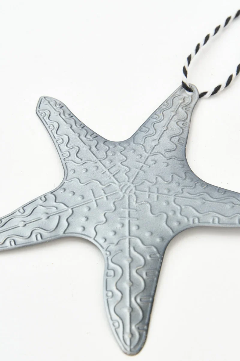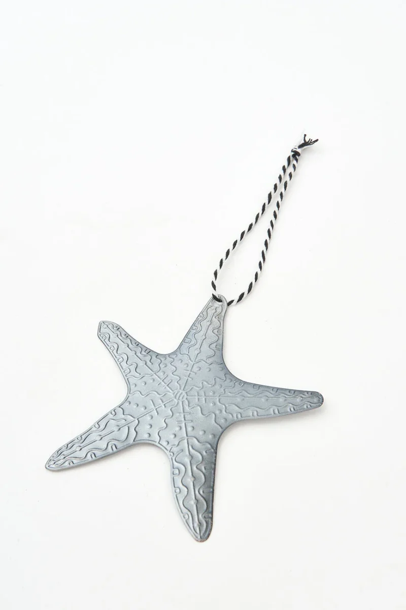 Colgante navideño de hojalata con forma de estrella de mar ideal para dar un toque marinero a tu árbol de Navidad. Aporta un encanto costero y festivo a tu decoración navideña.