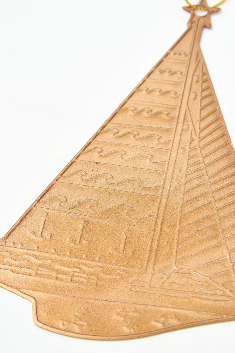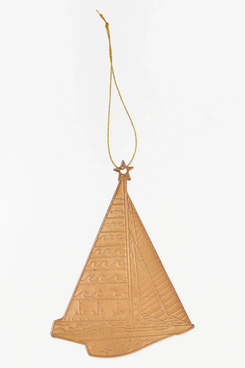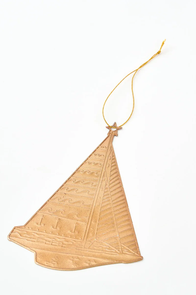 Colgante navideño de hojalata con forma de velero en color dorado, ideal para dar un toque marinero a tu árbol de Navidad. Aporta un encanto costero y festivo a tu decoración navideña.
