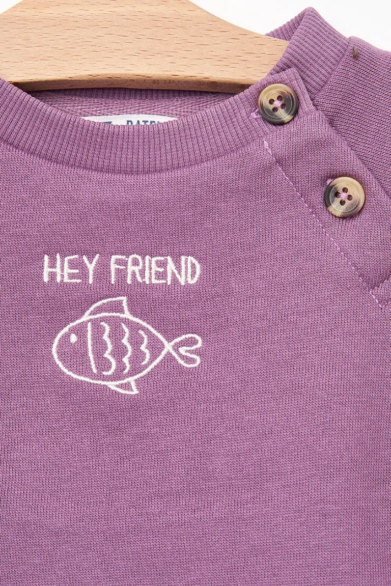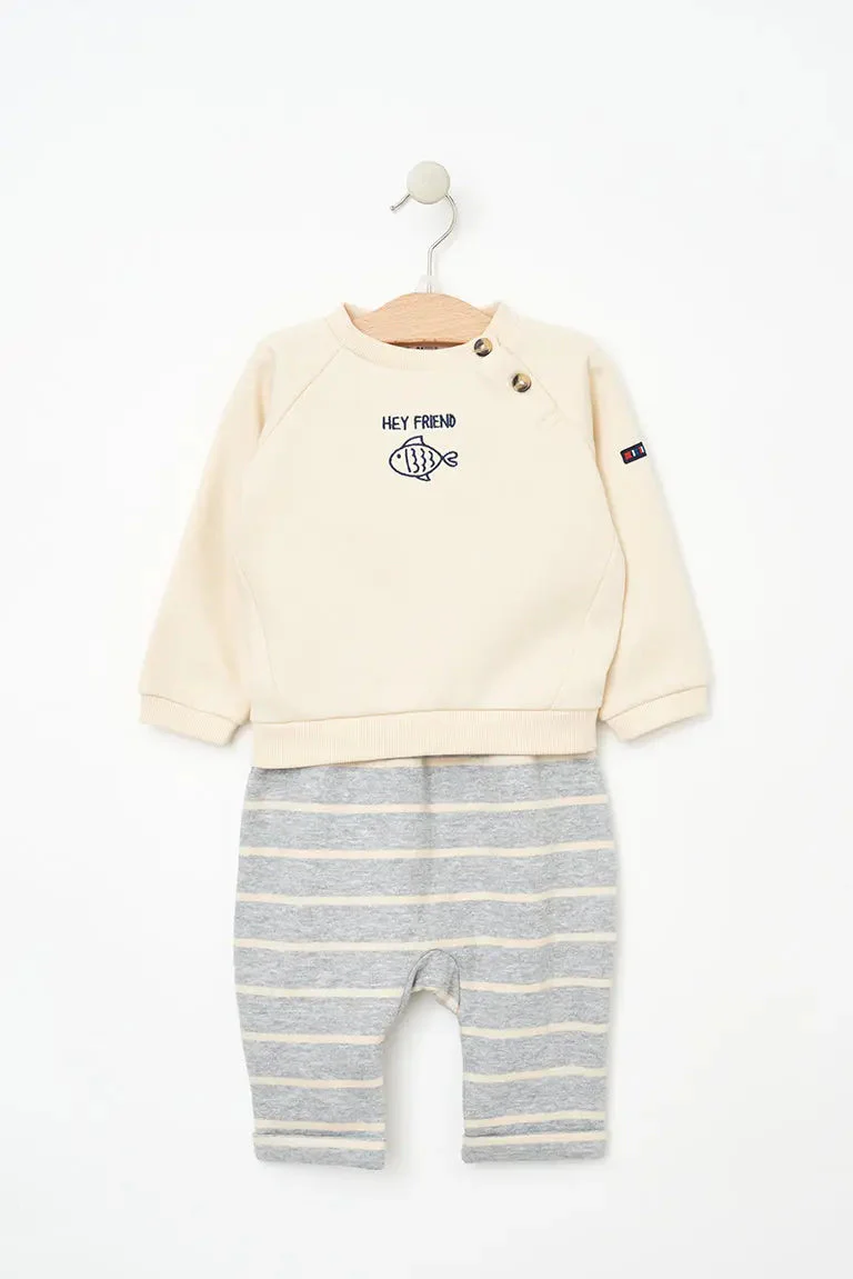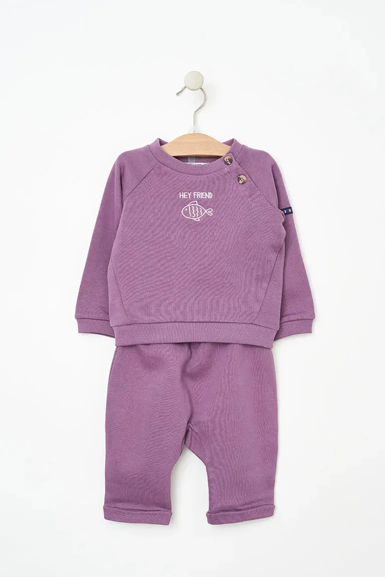 Conjunto compuesto por un pantalón y una sudadera en tejido Terry. En el pecho llevan bordado un pez y el texto ‘Hey Friend’.