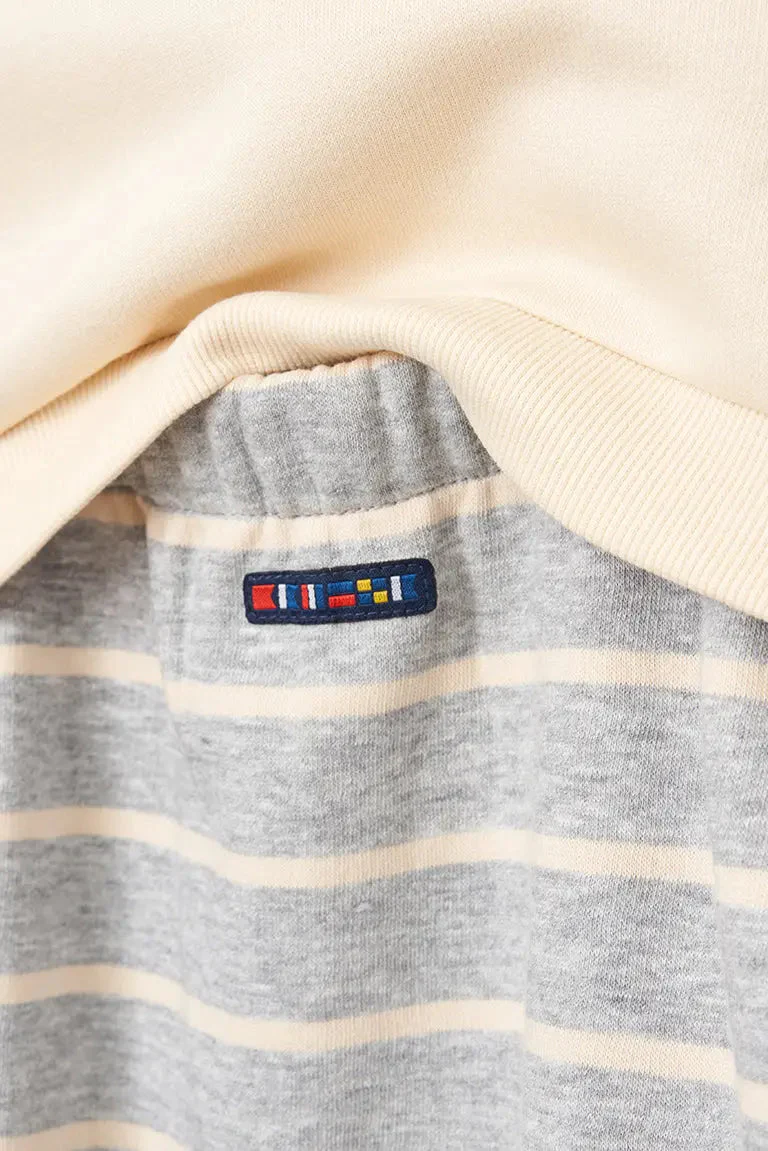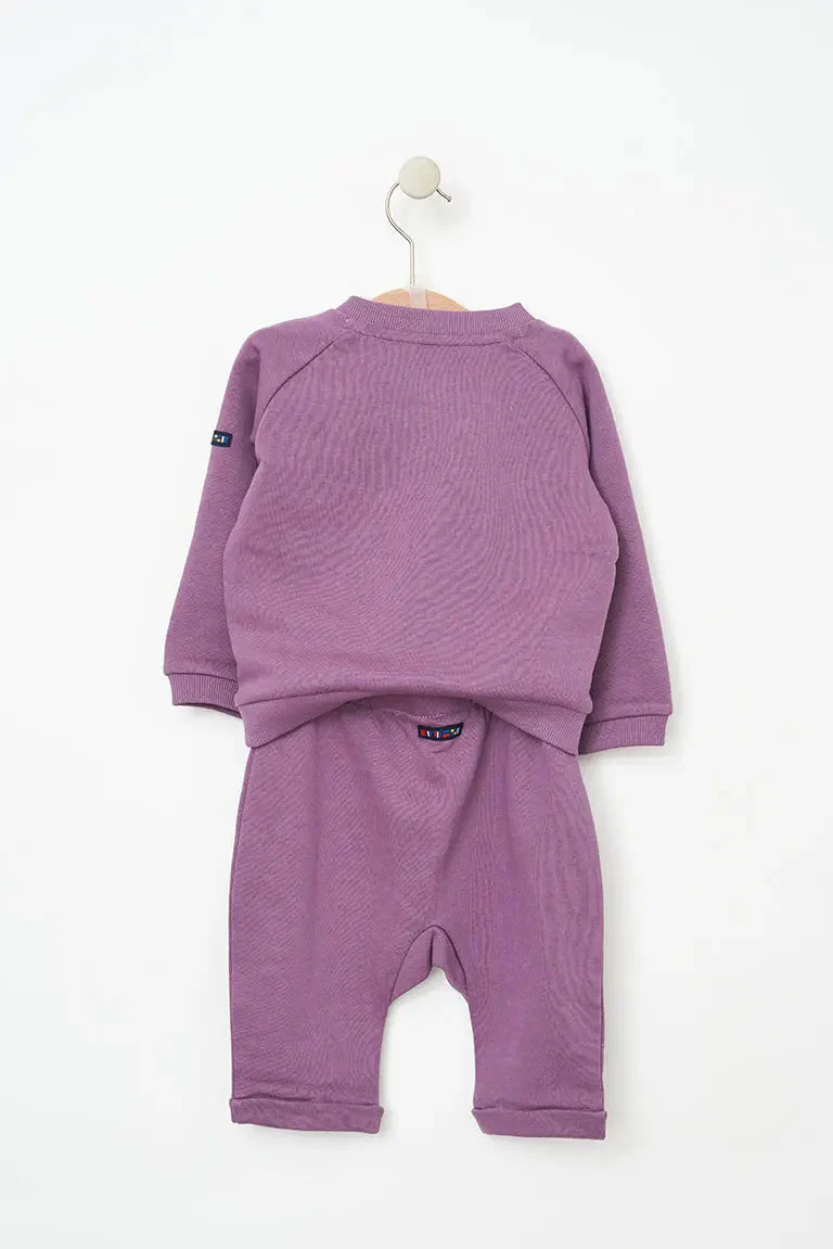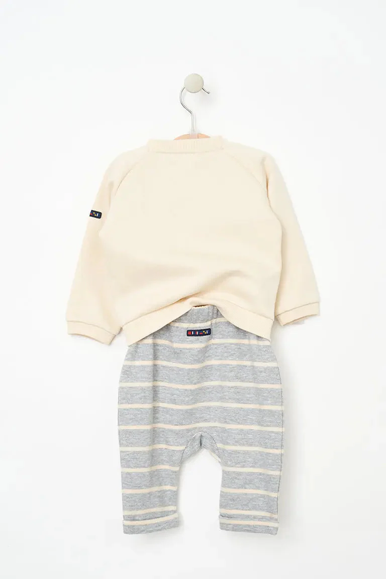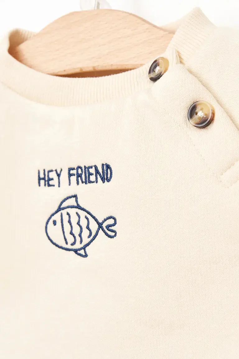 Conjunto compuesto por un pantalón y una sudadera en tejido Terry. En el pecho llevan bordado un pez y el texto ‘Hey Friend’.