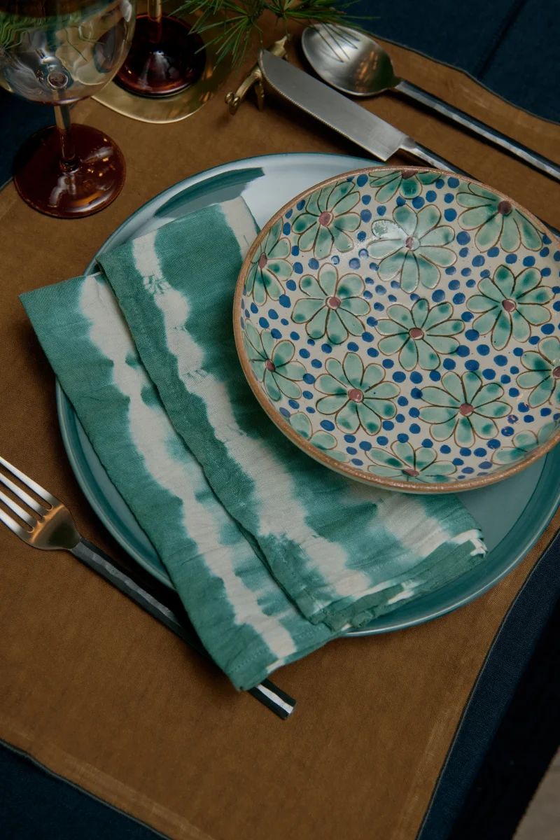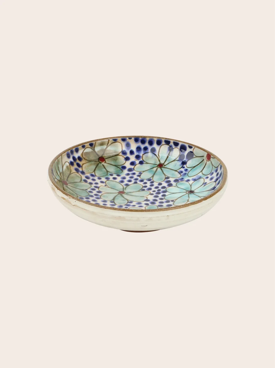 Cléo est une coupelle en céramique tournée et peinte à la main en Égypte, selon une technique artisanale ancestrale. Les contours des fleurs sont gravés avec un petit outil en bois, laissant apparaître la terre brute : la matière elle-même devient couleur. Ce contraste avec l’émail céladon apporte profondeur et relief, inscrivant la nature au cœur du motif.