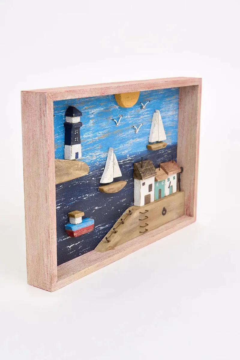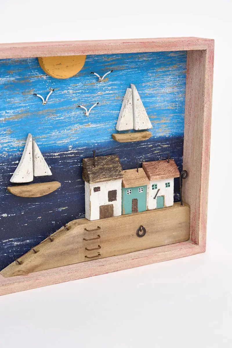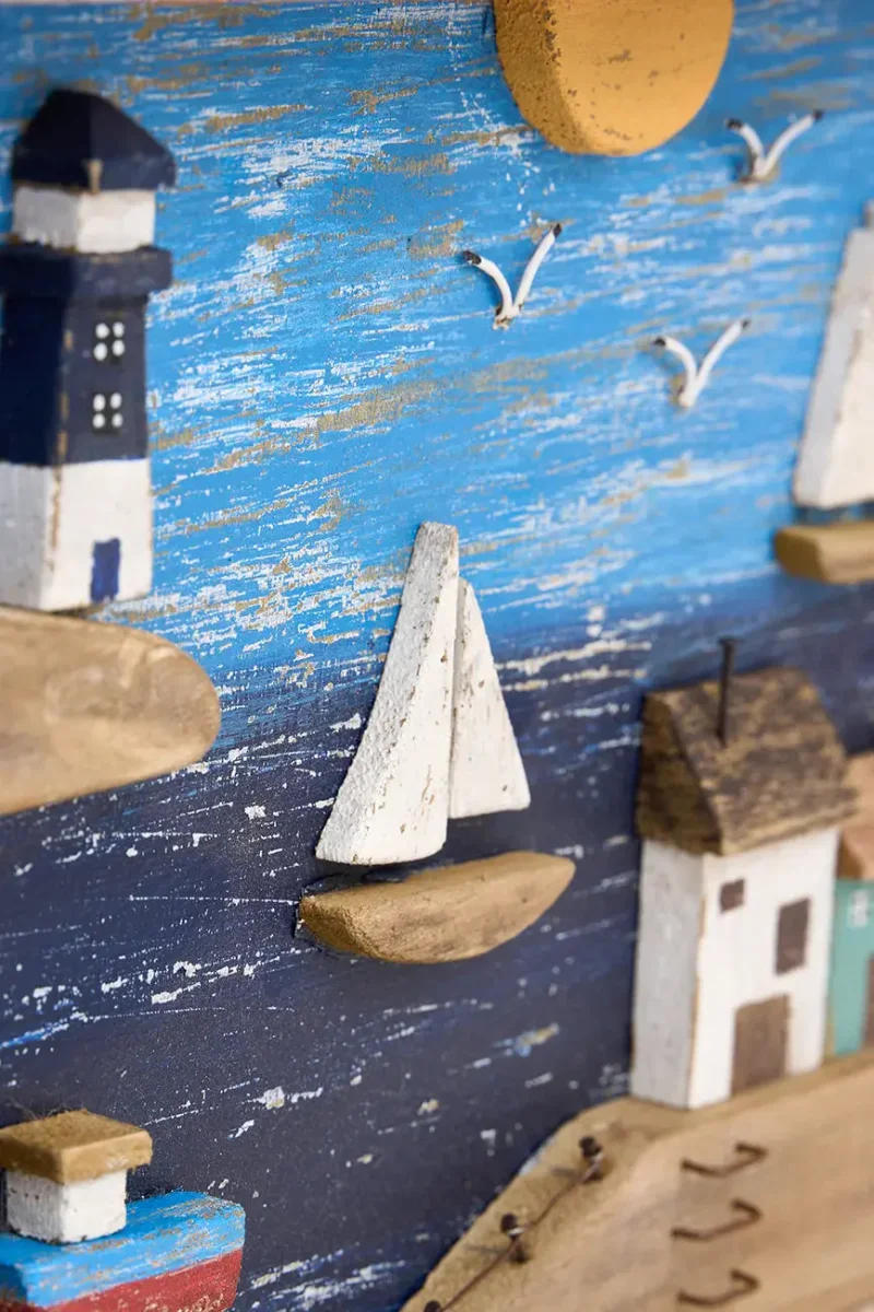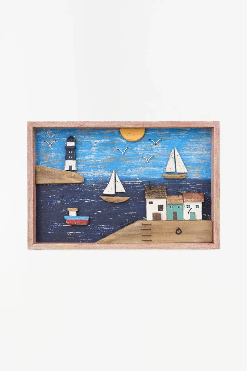 Este cuadro de madera envejecida presenta un encantador paisaje costero con puerto, capturando el encanto de la vida junto al mar. Sus detalles y su acabado rústico le confieren una estética nostálgica y vintage. Ideal para decorar salones, pasillos o dormitorios, esta pieza aporta un toque náutico y evocador