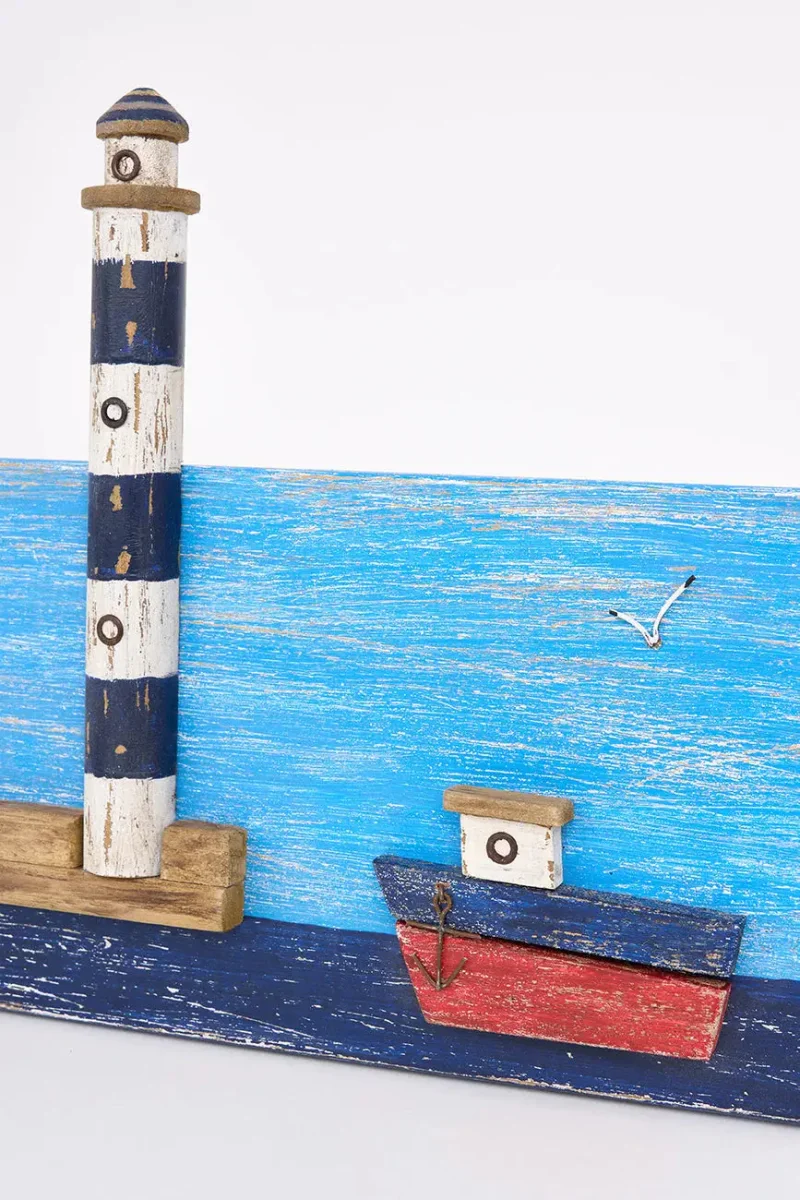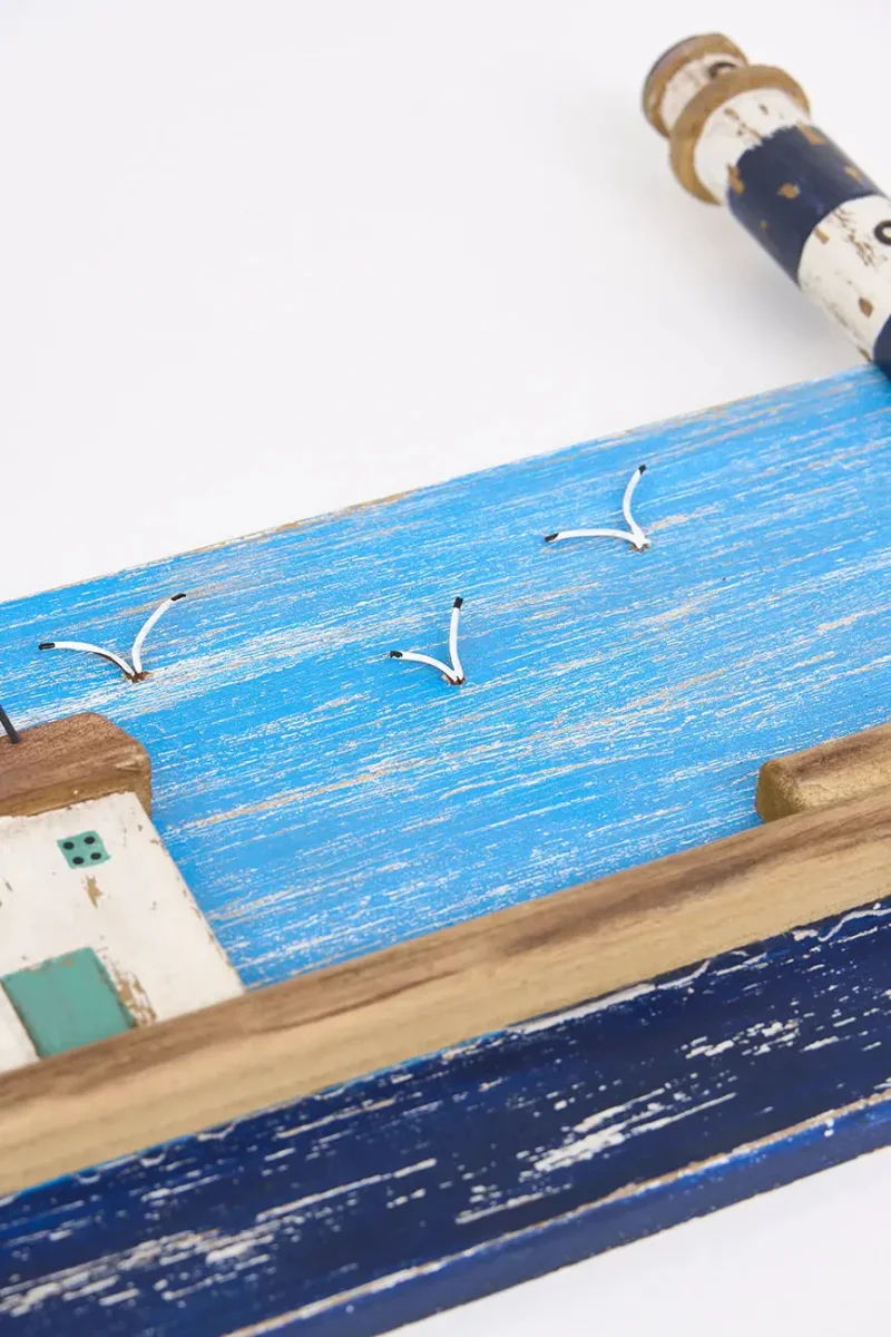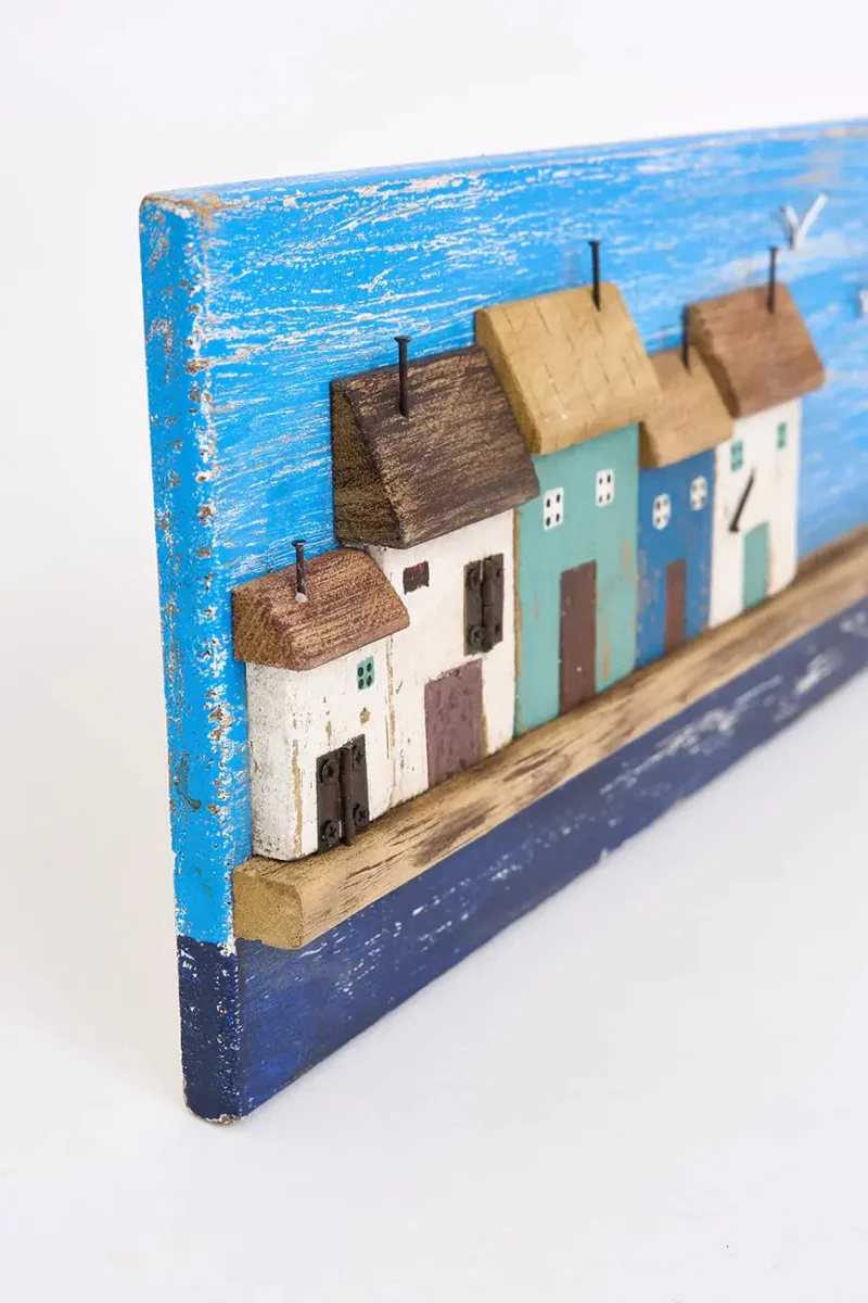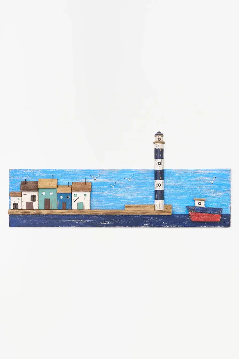 Este cuadro de madera envejecida presenta un encantador paisaje costero con puerto, capturando el encanto de la vida junto al mar. Sus detalles y su acabado rústico le confieren una estética nostálgica y vintage. Ideal para decorar salones, pasillos o dormitorios, esta pieza aporta un toque náutico y evocador
