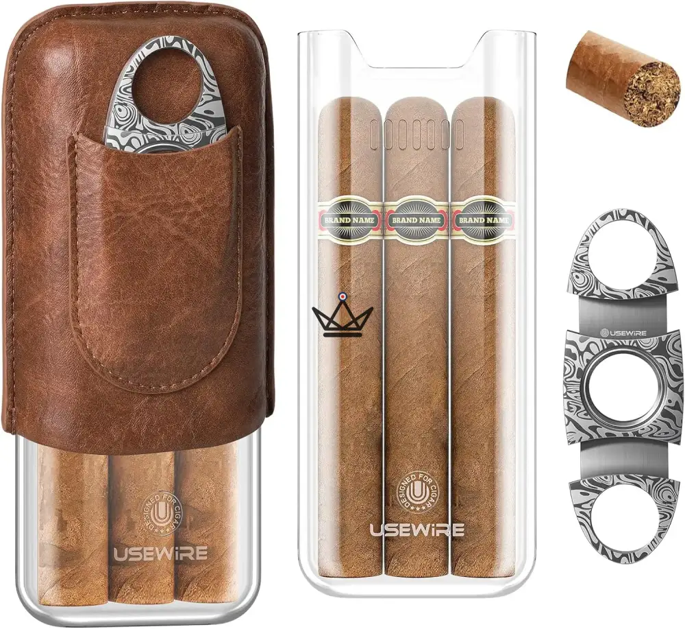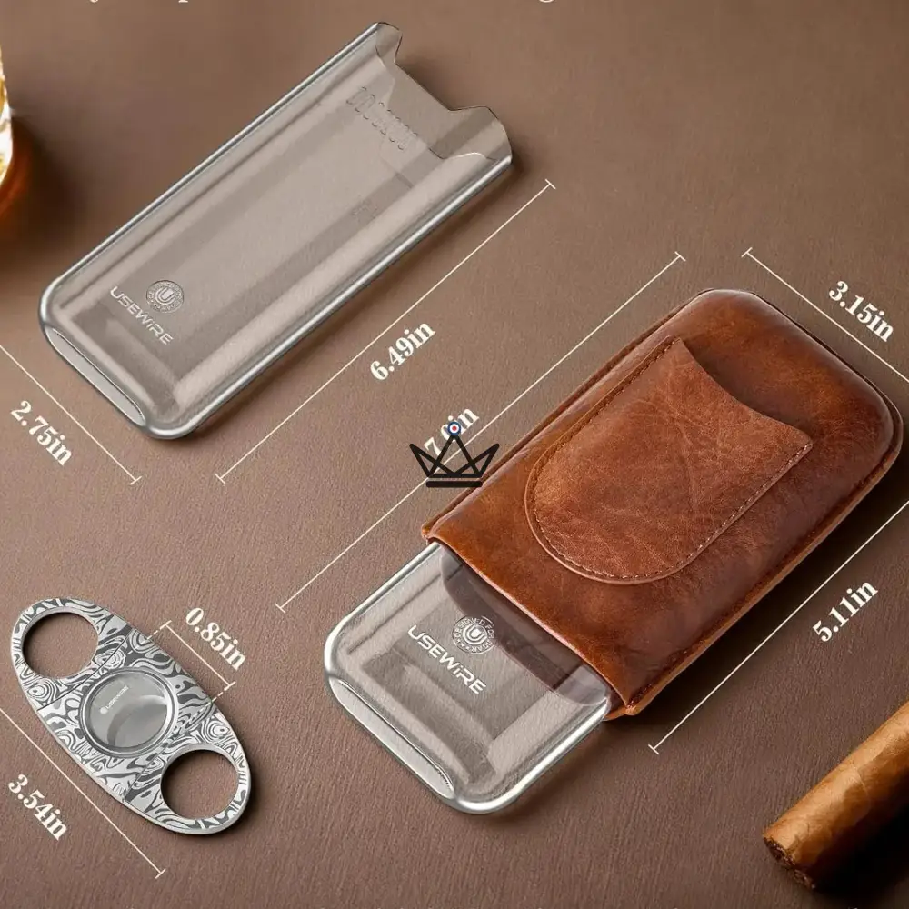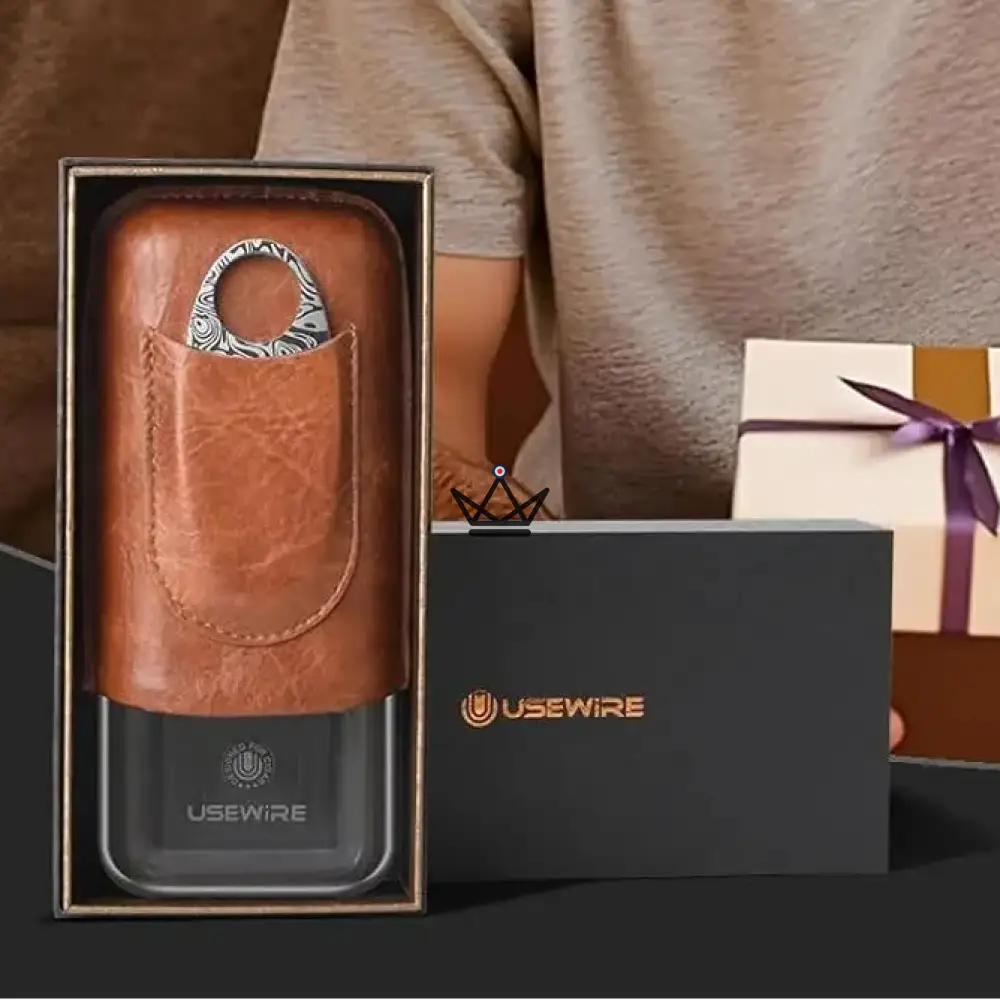 - Kit de Voyage Complet : Une poche frontale intégrée accueille un coupe-cigares double lame en acier inoxydable. Ce dernier arbore des gravures ornementales style « Damas », alliant tranchant chirurgical et élégance.