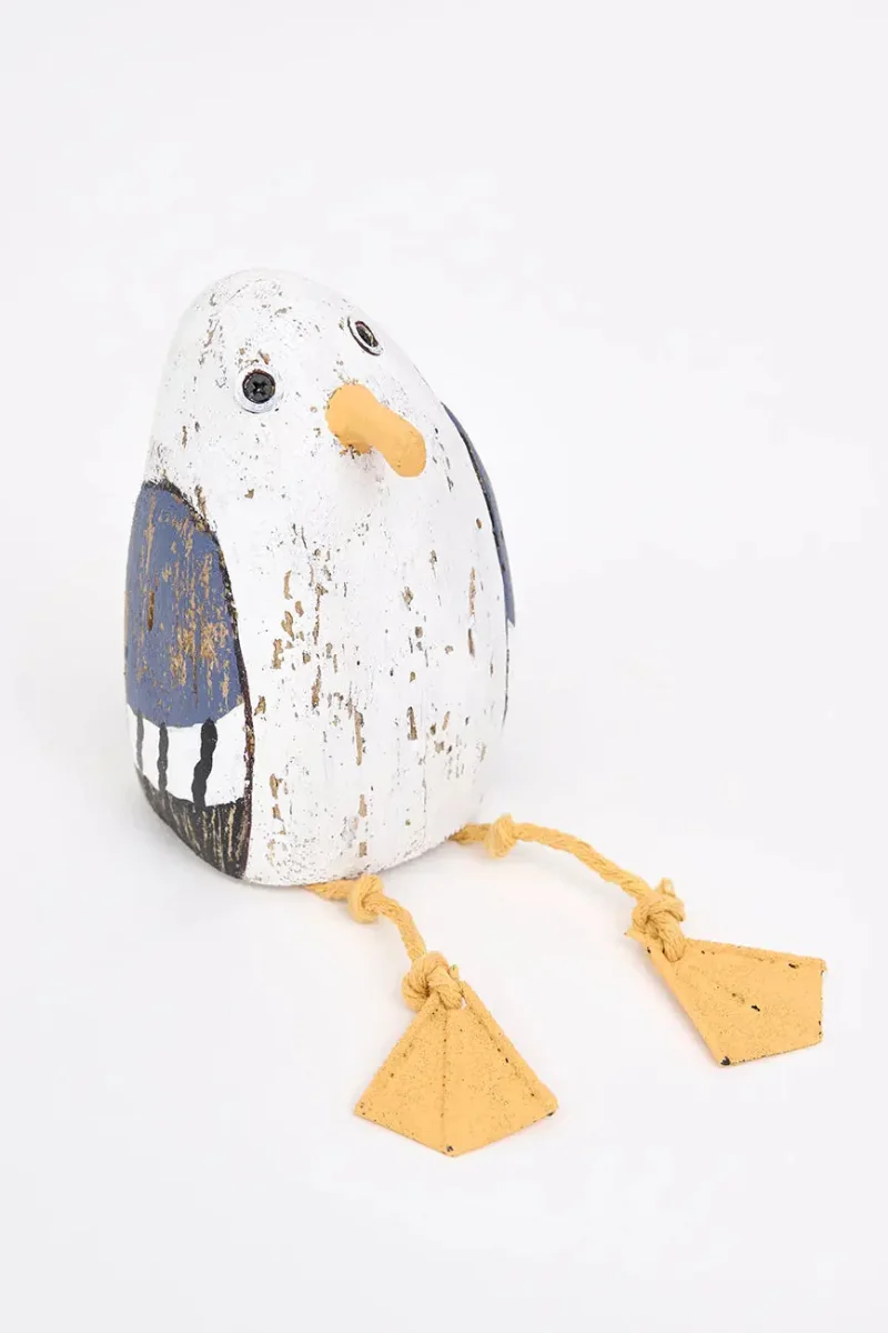 Simpática gaviota de madera con acabado envejecido y patas de cuerda.