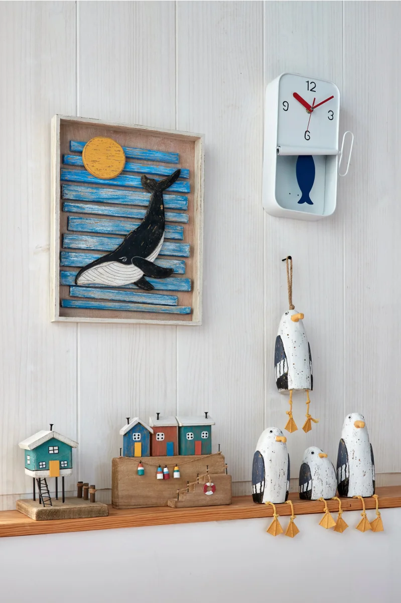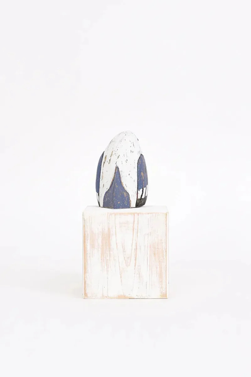 Simpática gaviota de madera con acabado envejecido y patas de cuerda. Colocada sobre una repisa o estantería da la impresión de estar sentada en una posición que resulta verdaderamente graciosa.