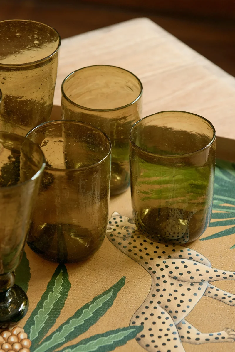 Nil est un gobelet soufflé à la bouche en Égypte, à partir de verre recyclé. Chaque pièce, légèrement épaisse et texturée, porte les marques et les petites irrégularités du geste artisanal : c’est ce qui fait sa beauté presque brute. Loin de l’uniformité, chaque verre a son charme propre, pensé pour accompagner aussi bien le quotidien que les grandes tables de fête. Un objet comme on les aime, qui raconte une histoire.
