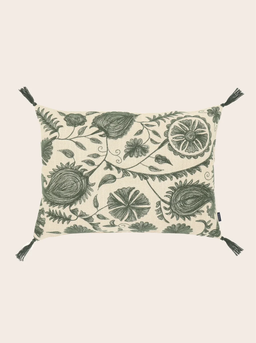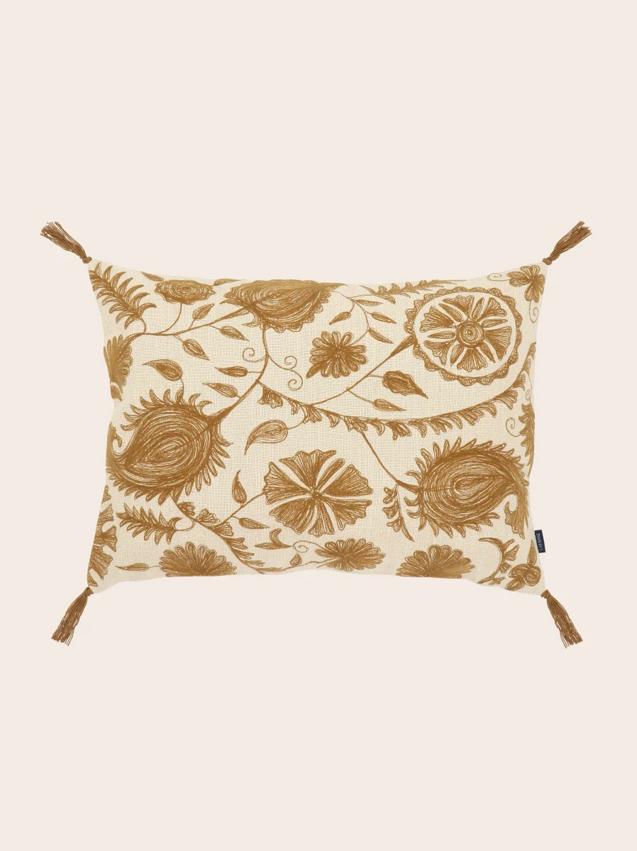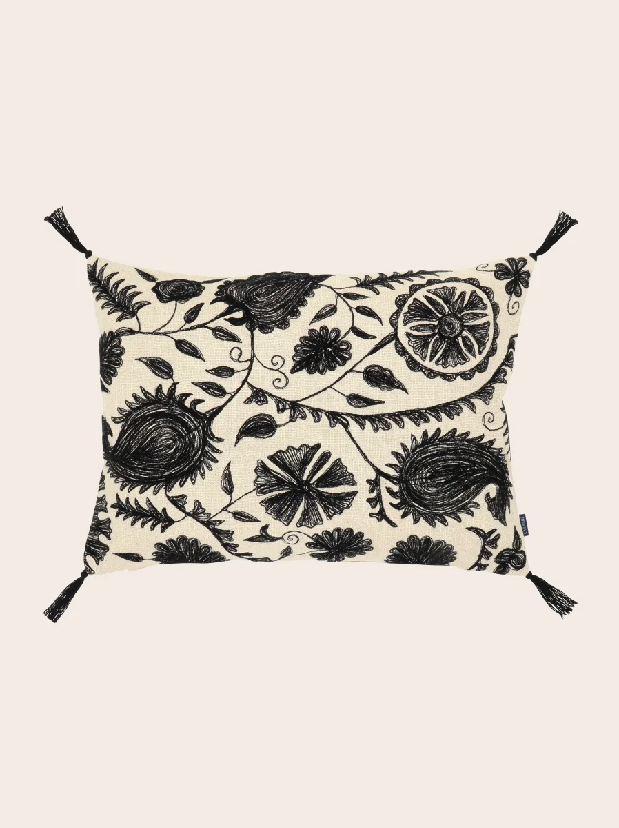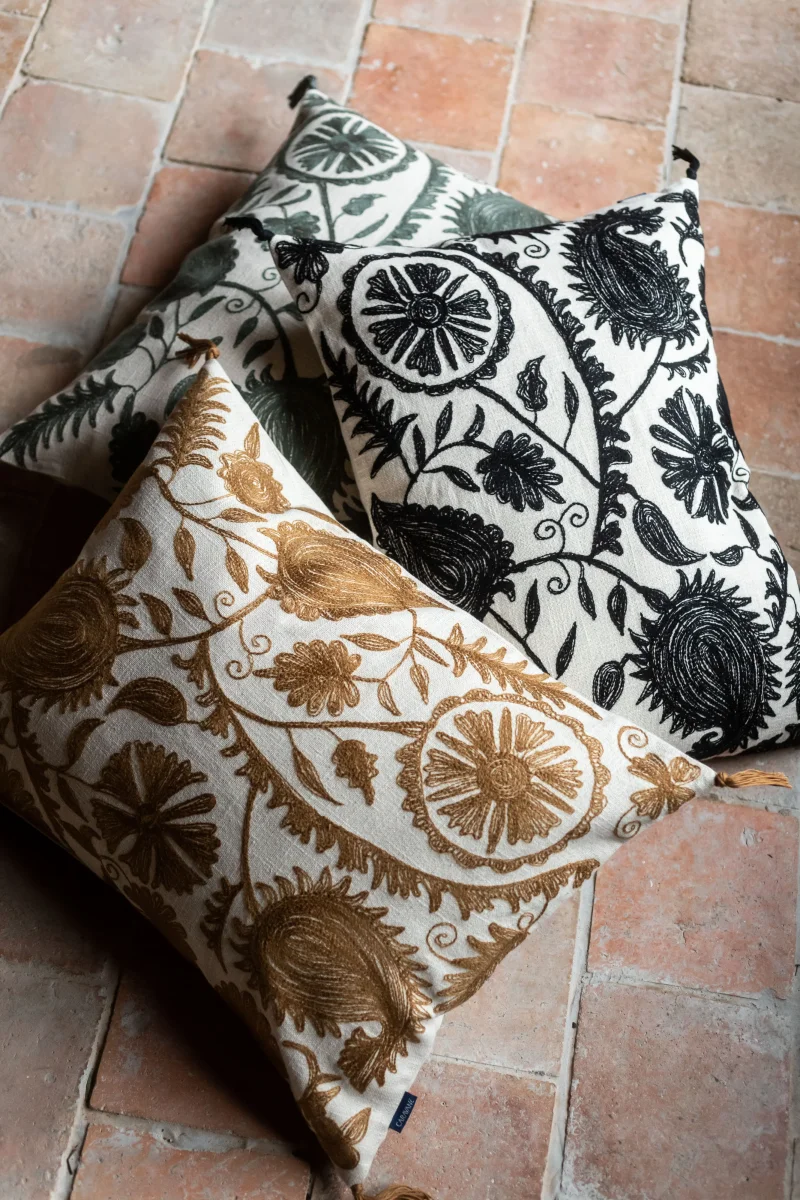 Inspirée par l’art ancestral du suzani, cette housse de coussin célèbre une technique de broderie née en Asie centrale, et particulièrement en Ouzbékistan. Le suzani, réputé pour ses broderies denses et foisonnantes, s’exprime ici dans une version revisitée : des points plus subtils, des motifs aérés et légers, comme dessinés sur le tissu. Une approche contemporaine qui révèle une nouvelle facette des possibilités infinies de cet art textile.