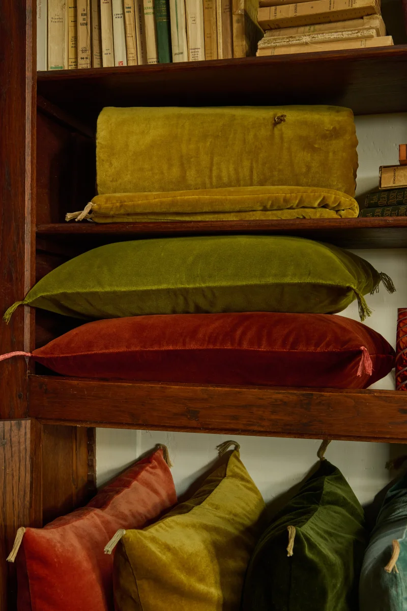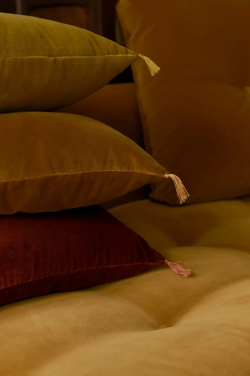 La housse de coussin Dolce est fabriquée à partir d’un velours d’une qualité remarquable, offrant une texture à la fois confortable et élégante, avec des reflets profonds et enveloppants.