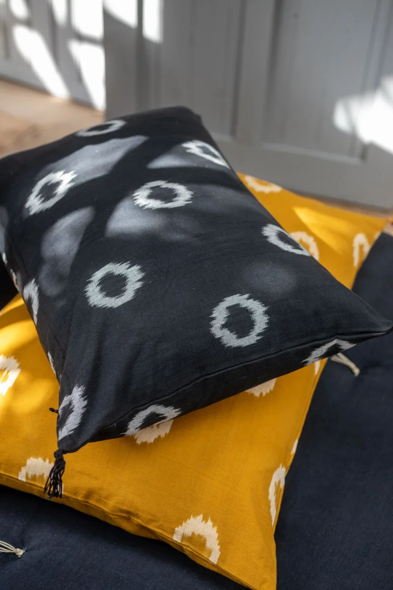 Cette technique traditionnelle permet de teindre les fils avant de les travailler, permettant au motif de se dessiner une fois la toile tissée. C’est ce qui donne à nos housses de coussins en coton cette jolie vibration, qui évite à nos cercles d’être trop réguliers.
