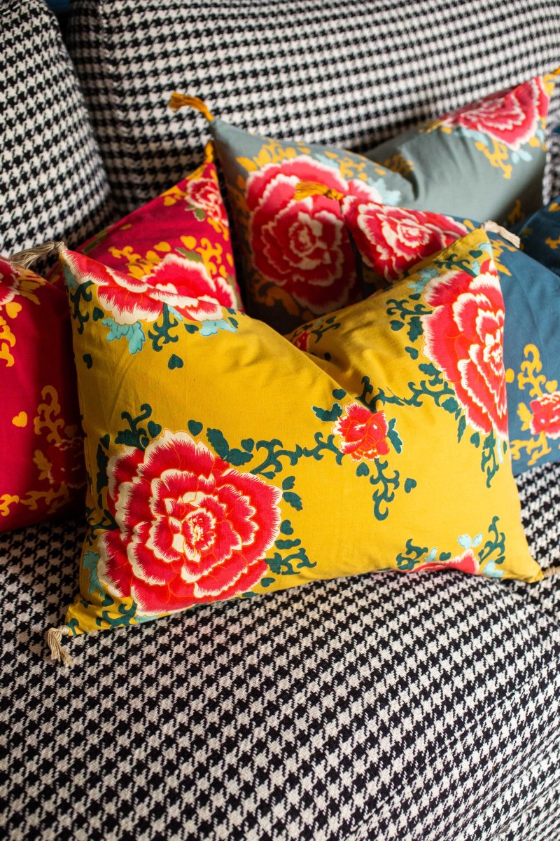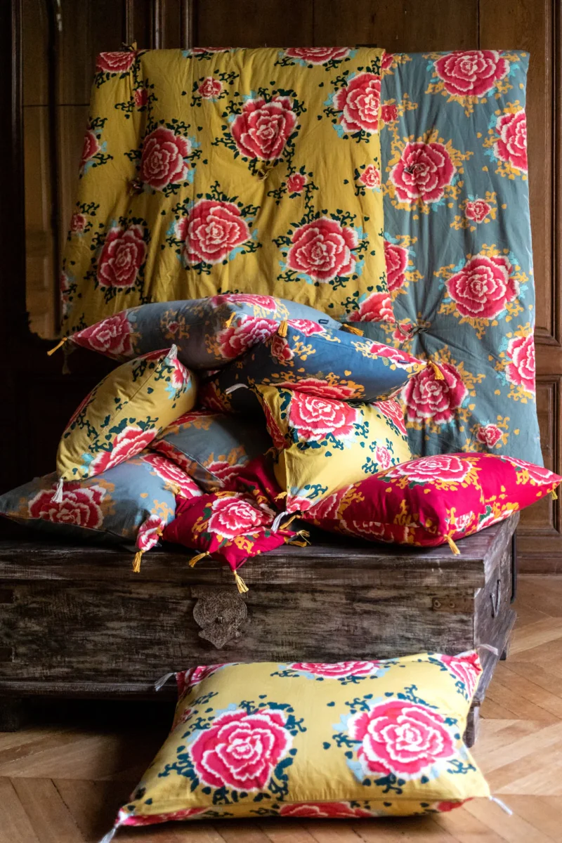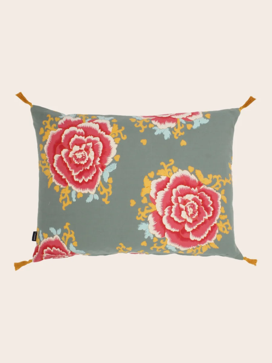 L’imprimé de la housse de coussin Liao semble hérité des documents textiles du 19e siècle, aux motifs floraux généreux et vivants.