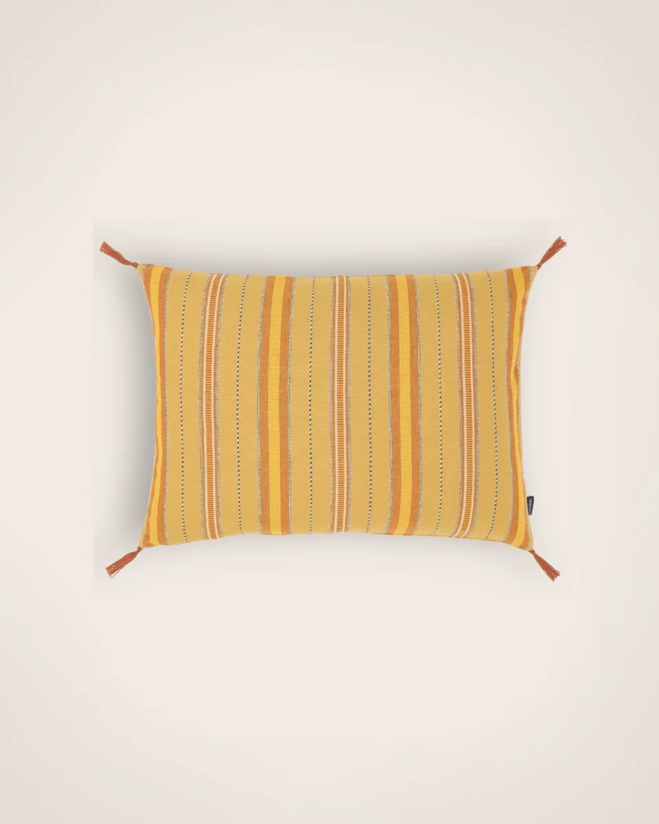 Les housses de coussin Noely se distinguent par un jeu graphique de trois rayures aux largeurs variées. Les fils chinés structurent le motif, tandis qu’une ligne en relief noir et blanc apporte contraste et rythme, soulignant la finesse du tissage.