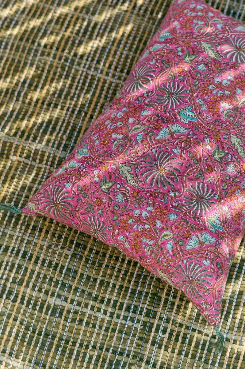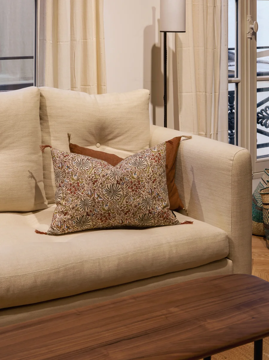La housse Papilio est imprimée au bloc de façon artisanale. C’est le secret de sa splendeur, et ce qui l’érige en un tissu vivant, voué à évoluer au fil des lavages : il se patine avec le temps, sans jamais perdre de son charme.