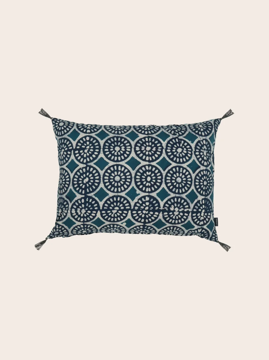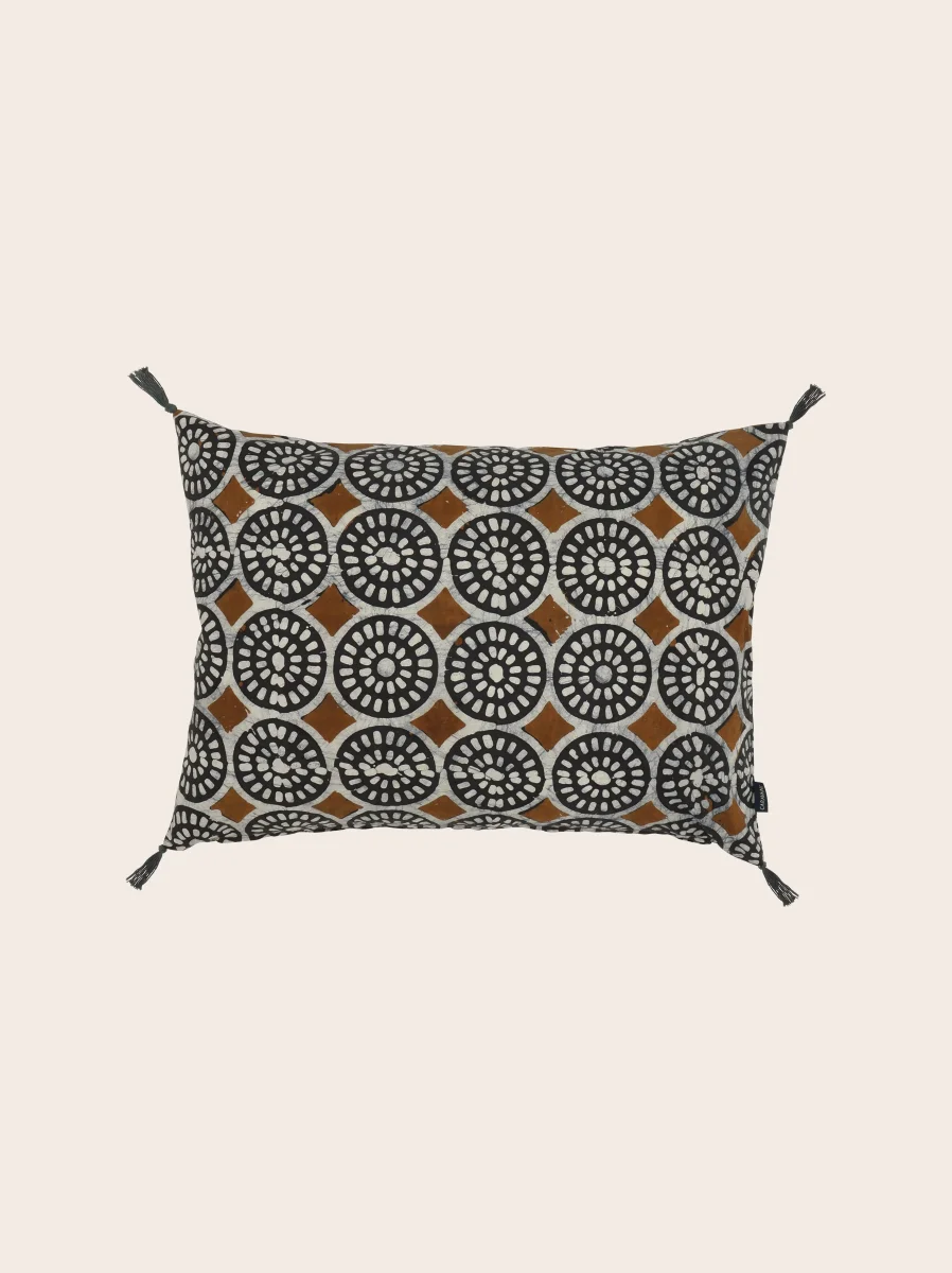 La housse de coussin Pomelo présente ce motif singulier, à la fois lointain et irrésistiblement contemporain.