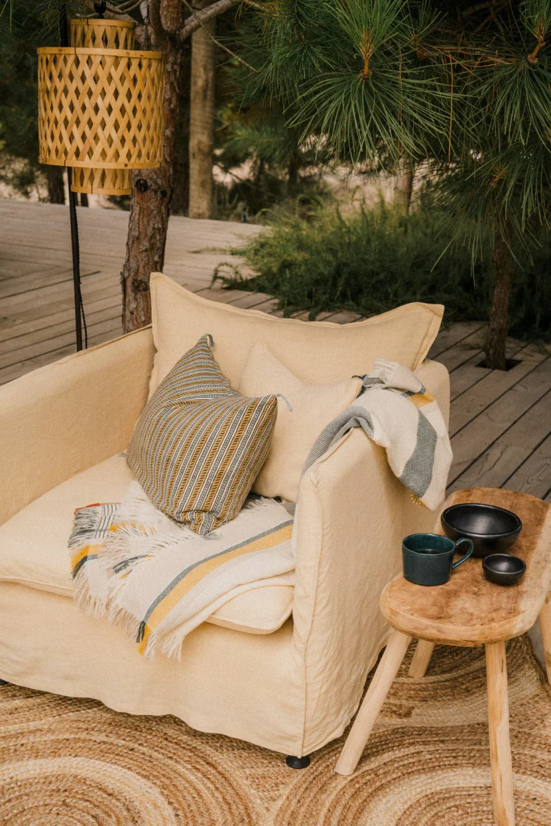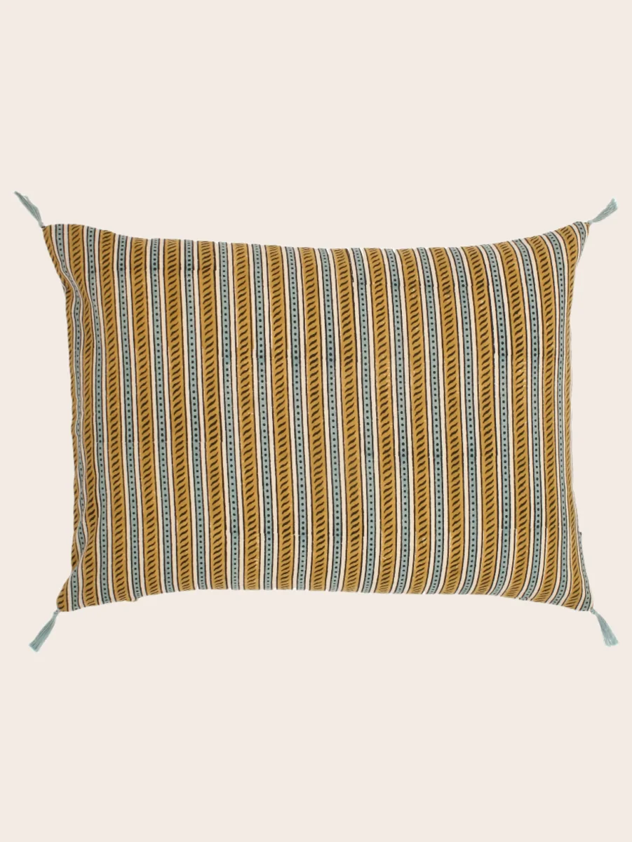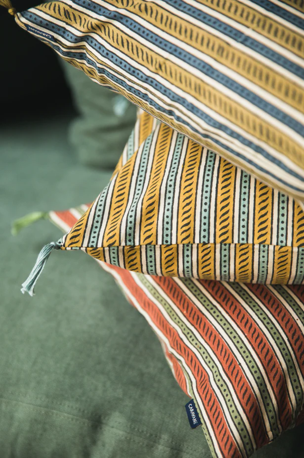 La housse de coussin Raana a été imprimée à la main au bloc. Voilà pourquoi sa rayure n’est jamais stricte et avec de petites irrégularités, qui lui confèrent cette aura révélatrice des étoffes artisanales. Un imprimé – déjà intemporel – mêlant rayures et petits points, avec des notes végétales, surlignés de traits plutôt géométriques.
