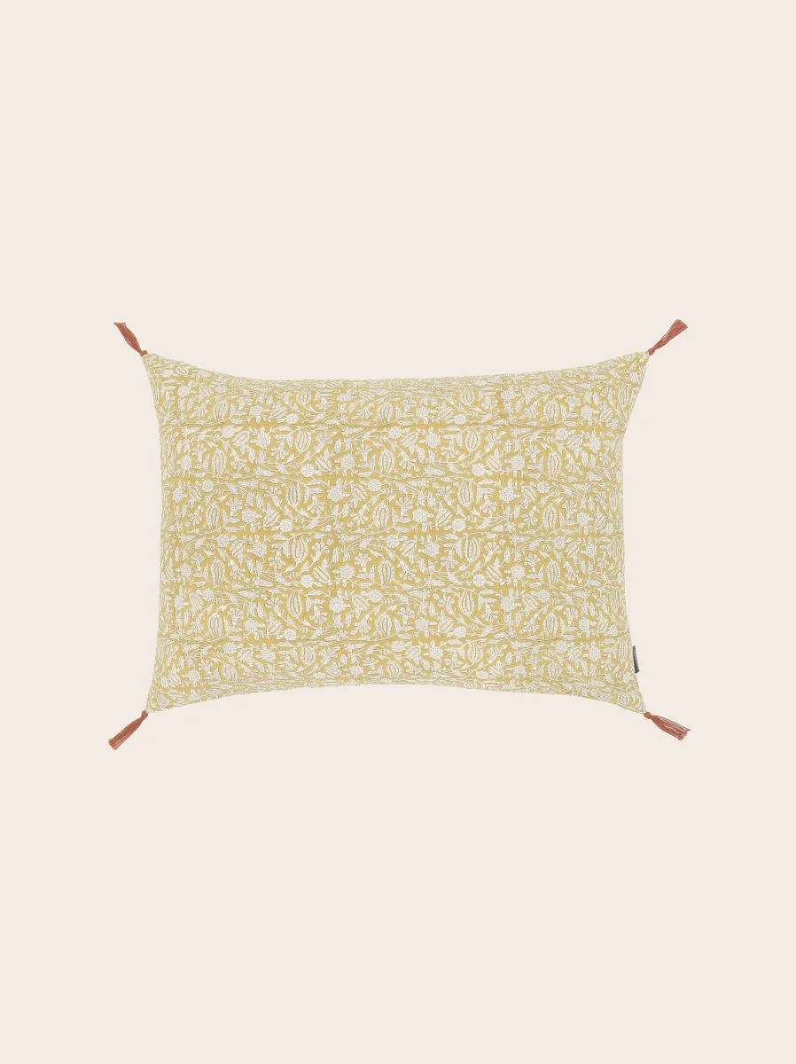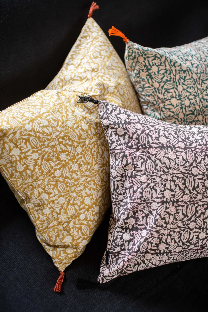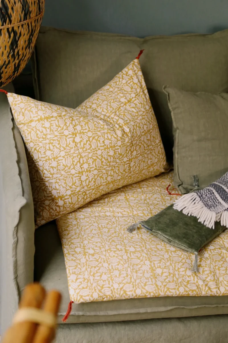 Tulipan est une housse de coussin aux motifs floraux traditionnels indiens, revisités dans des teintes contrastées et pétillantes. Son imprimé végétal, réalisé manuellement au bloc de bois, lui confère un aspect vivant qui se patine avec le temps sans perdre son charme.