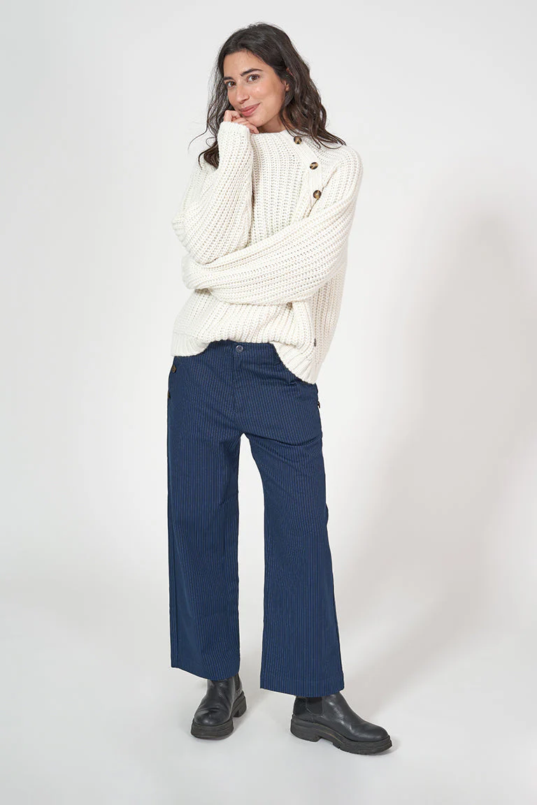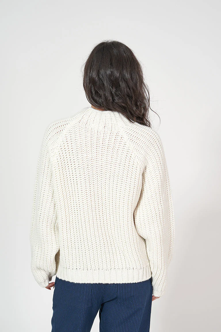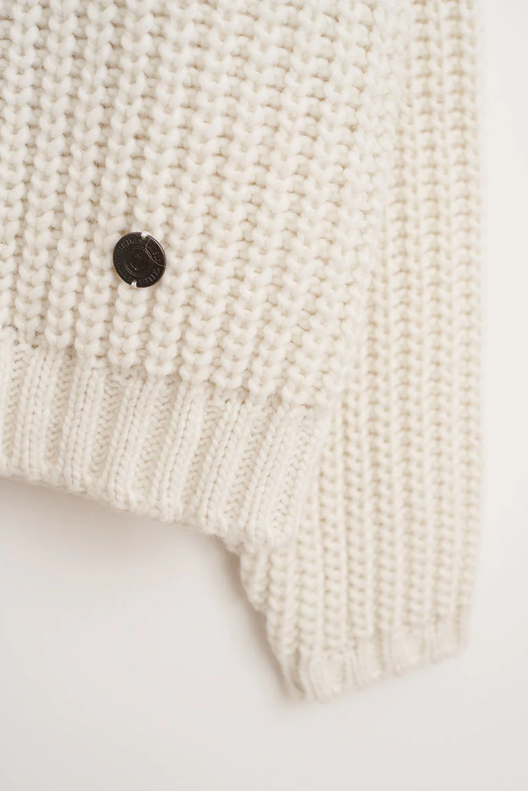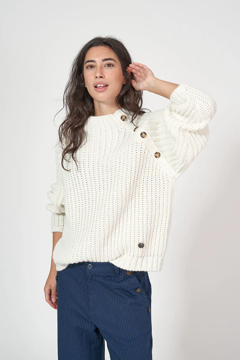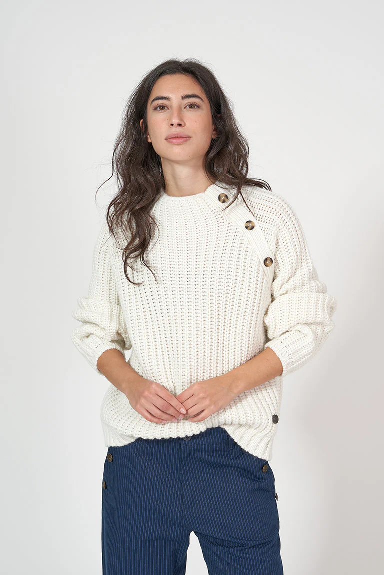 Jersey de punto de mujer con cuello elevado y una botonadura decorativa en un lado del pecho. Esta prenda tiene un corte oversize con manga raglán.
