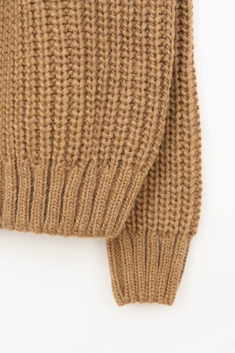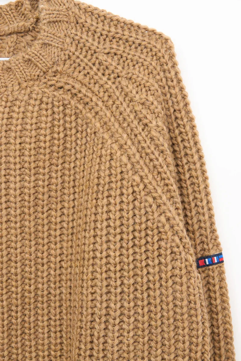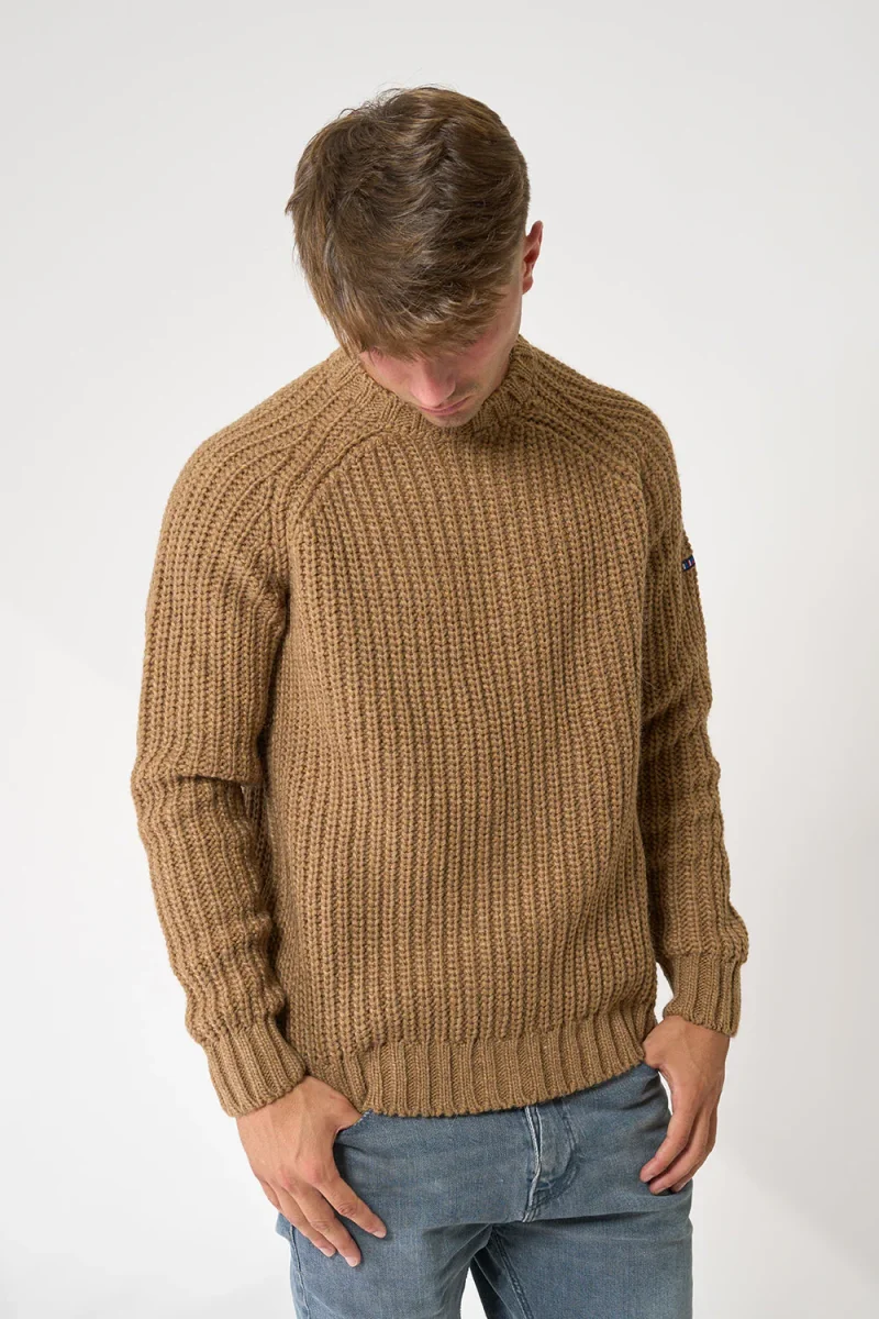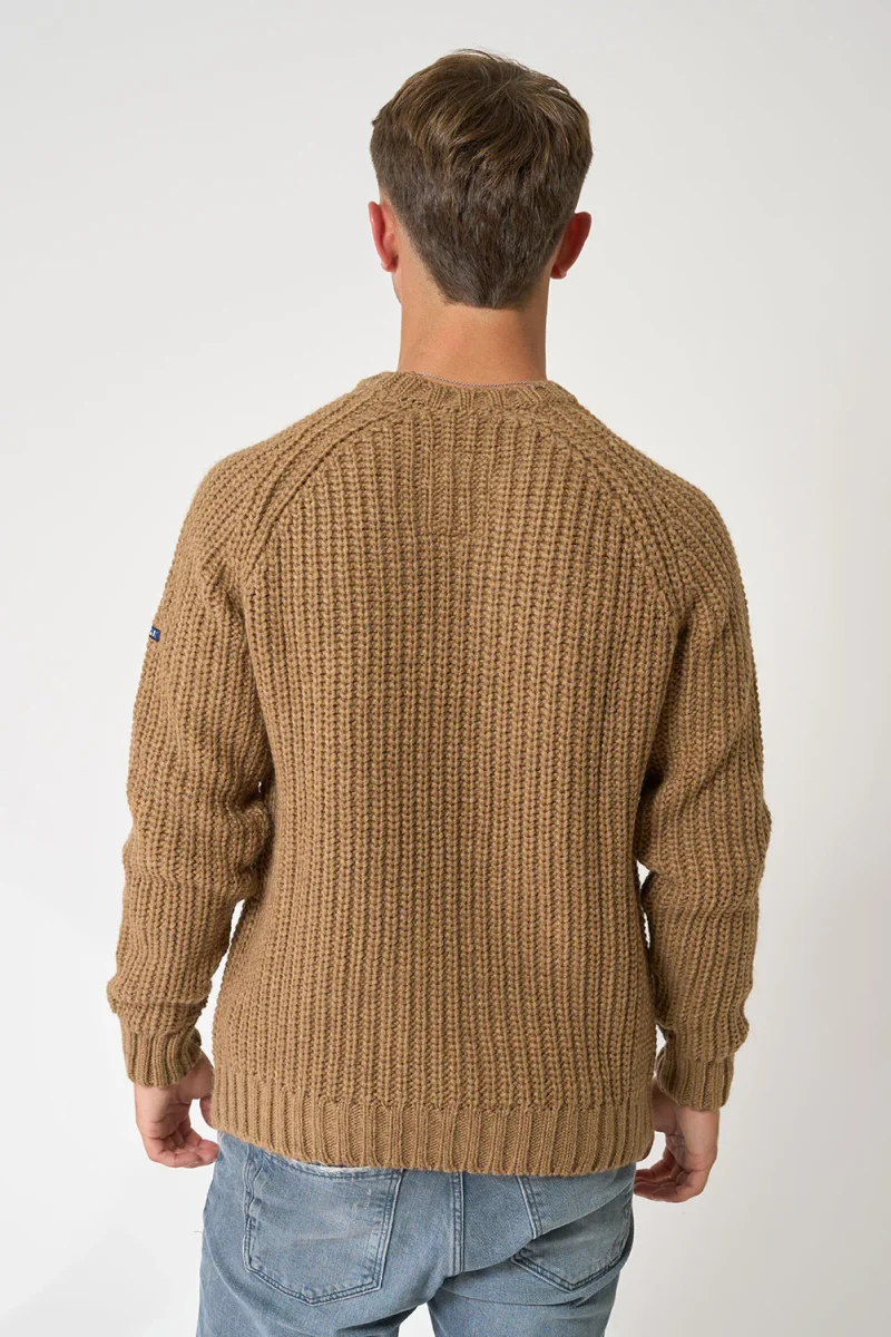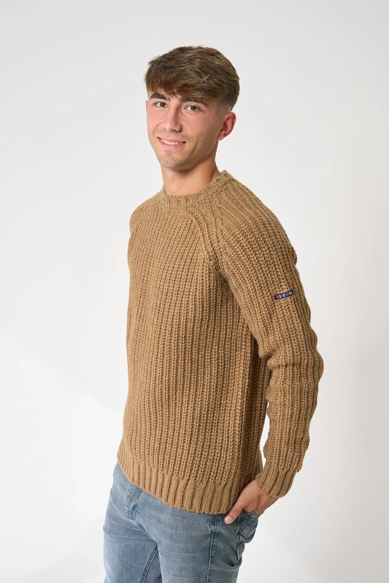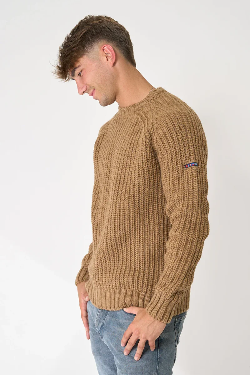 Jersey de punto de hombre con manga raglán y cuello redondo. Tiene remate de canalé en puños, cuello y bajo. Prenda básica y cálida. El modelo mide 1,89m y lleva una talla M