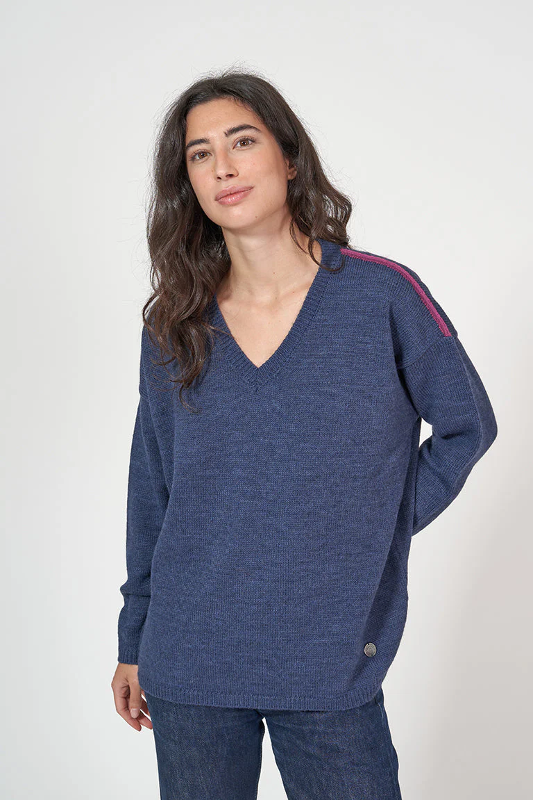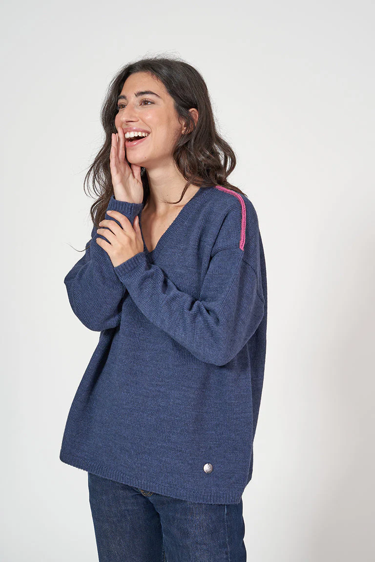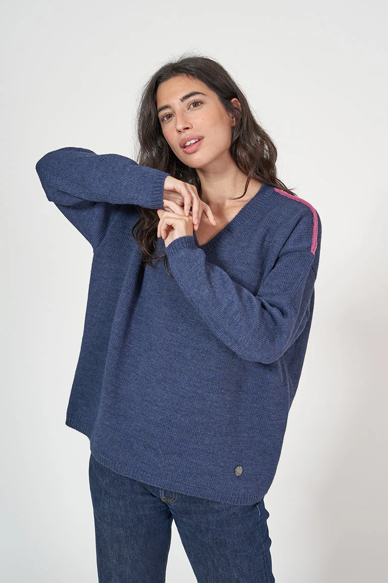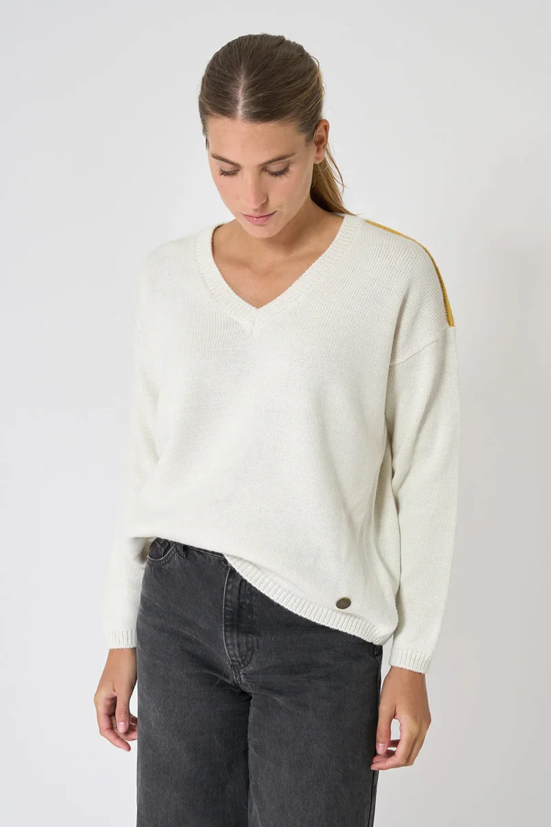 Jersey de punto de mujer con cuello pico. Este modelo tiene un corte oversized con hombros caídos. En los hombros tiene un detalle de color a contraste. La modelo mide 1,72m y lleva una talla 38