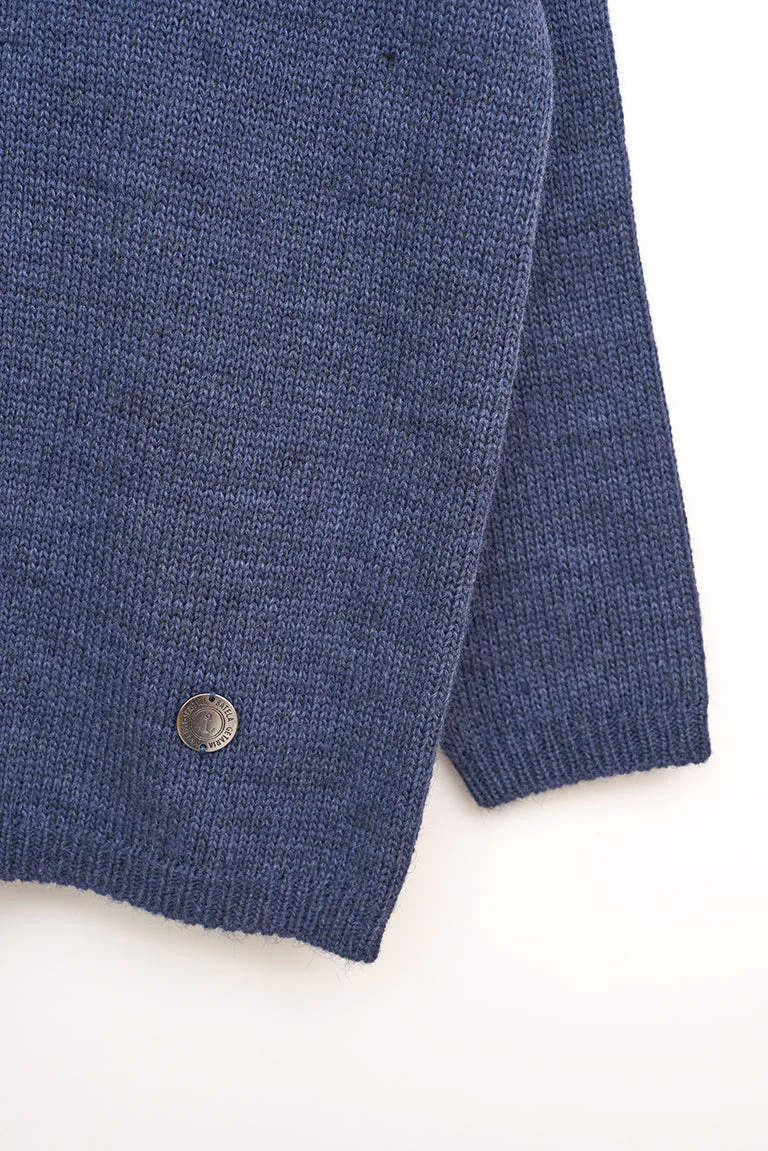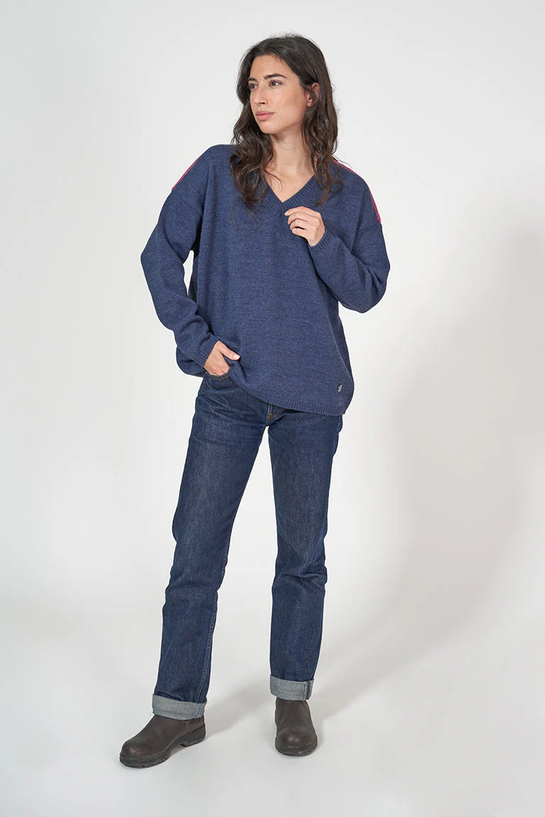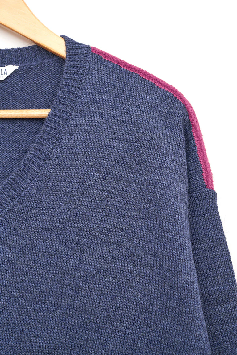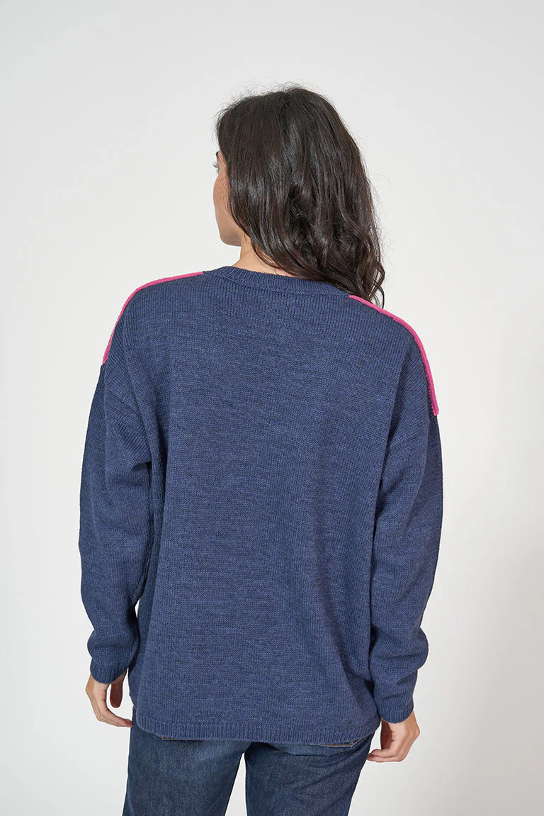 Jersey de punto de mujer con cuello pico. Este modelo tiene un corte oversized con hombros caídos. En los hombros tiene un detalle de color a contraste. La modelo mide 1,72m y lleva una talla 38