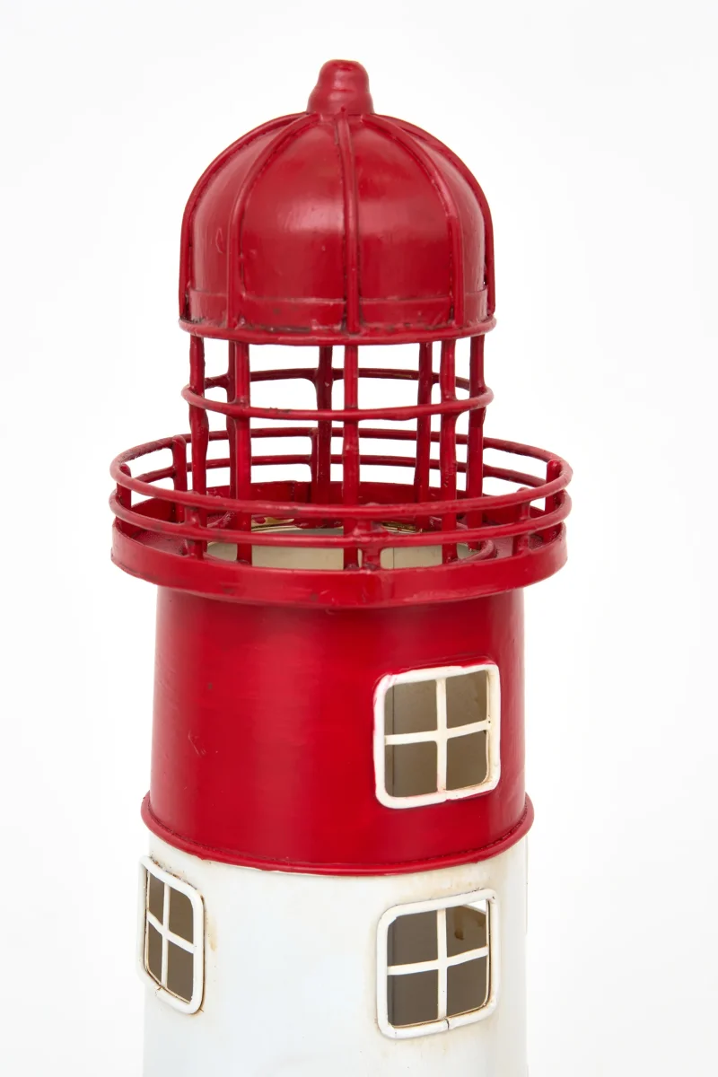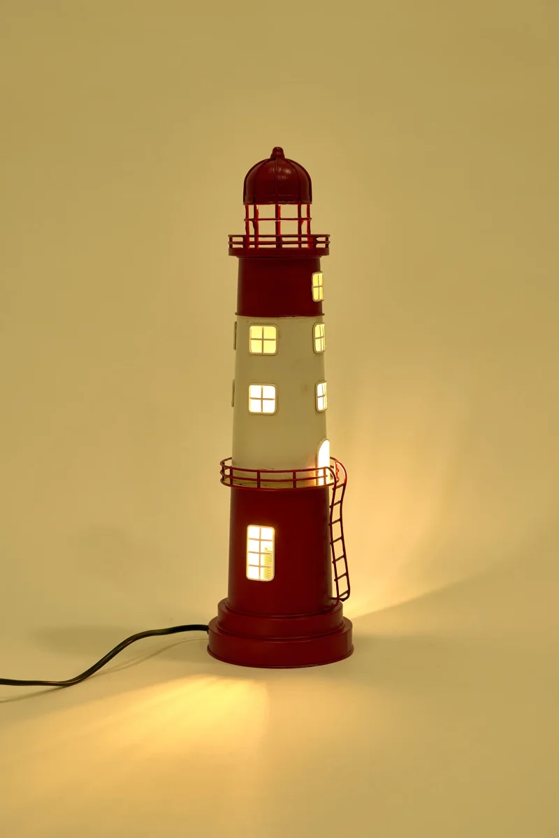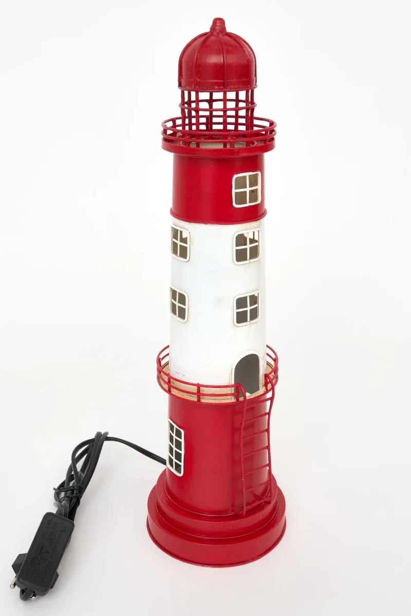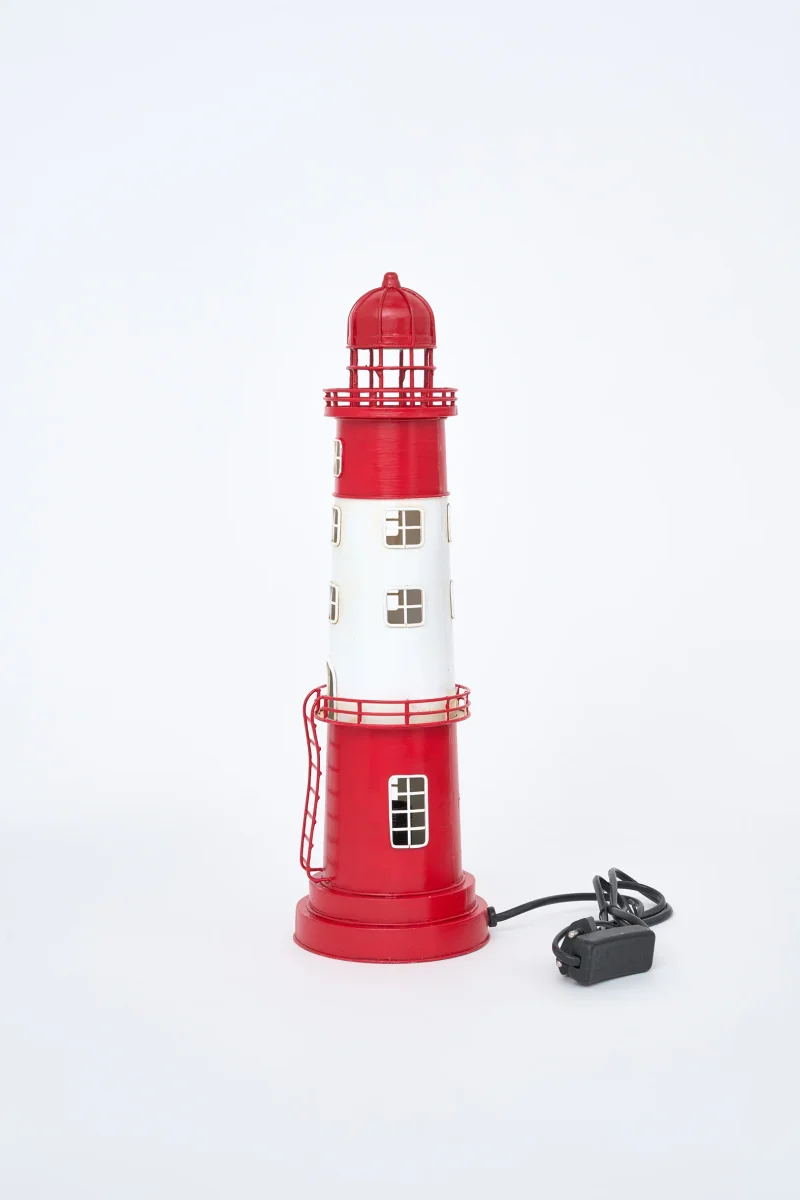 Lámpara decorativa con forma de faro y diseño clásico en tonos rojo y blanco. Su silueta vertical y detalles inspirados en la navegación aportan carácter y un punto costero al espacio.