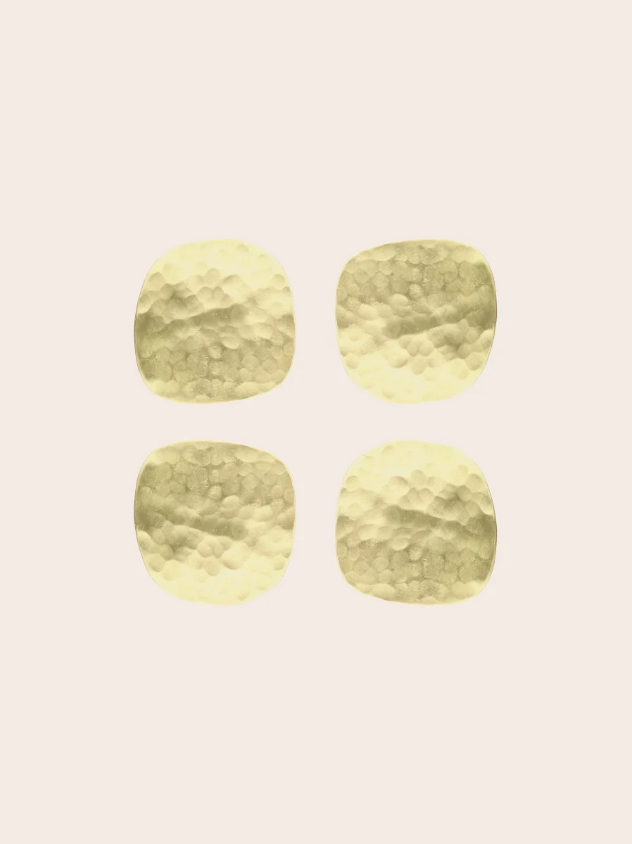 Les dessous de verre Ema font écho dans leur forme abstraite aux miroirs Ame. Leur fin laiton martelé et brossé en font des compagnons intemporels de l’apéritif à toujours garder à portée de verre.