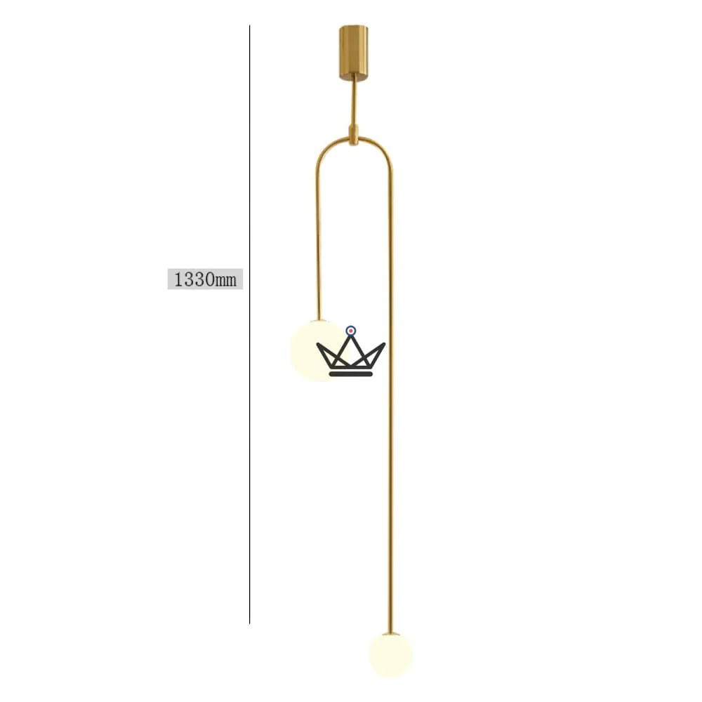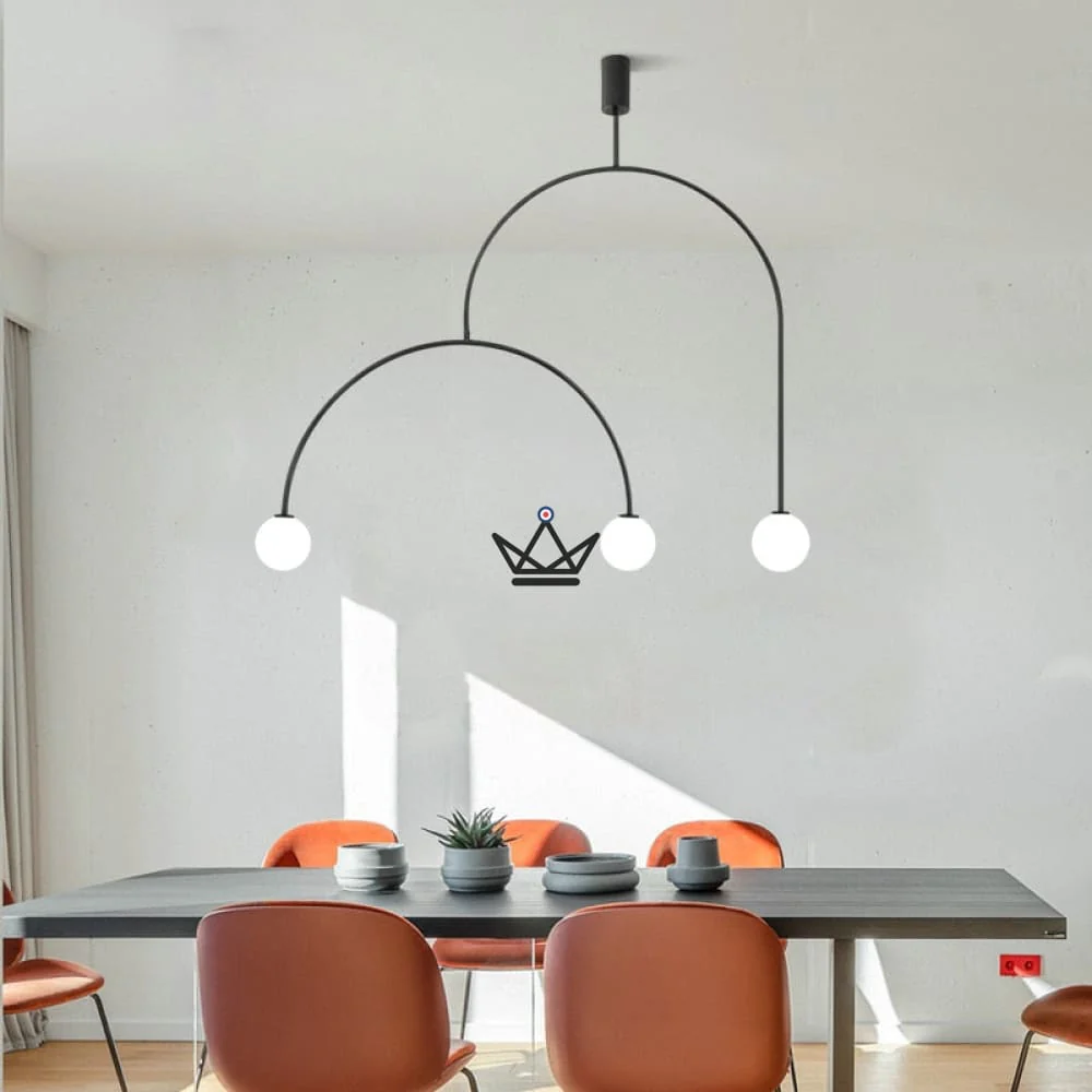 Ce luminaire est surmonté de plusieurs sources de lumière en verre soufflé opalin, créant un éclairage doux et diffus. Son arceau asymétrique ajoute une touche sinueuse et élégante à sa silhouette épurée.
