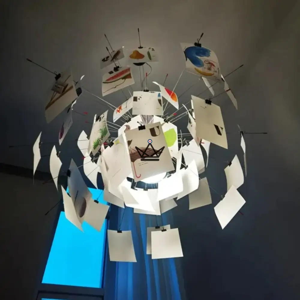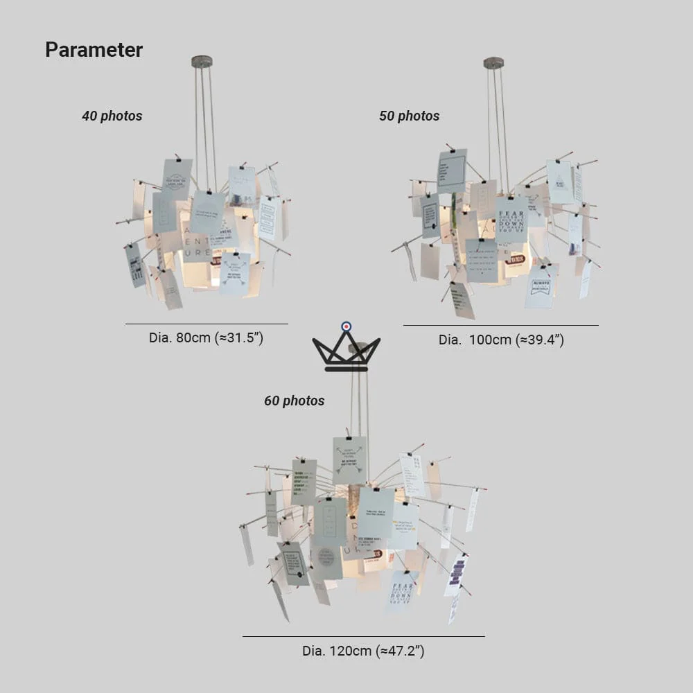 Avec des dimensions adaptées à chaque environnement, disponibles en 80 cm, 100 cm et 120 cm, le Mémosphère est conçu pour s’harmoniser avec l’échelle de votre intérieur. Les modèles se distinguent par le nombre de photos – 40, 50 ou 60 – attachées par des pinces délicates qui ajoutent à l’aspect interactif et personnalisable du luminaire.